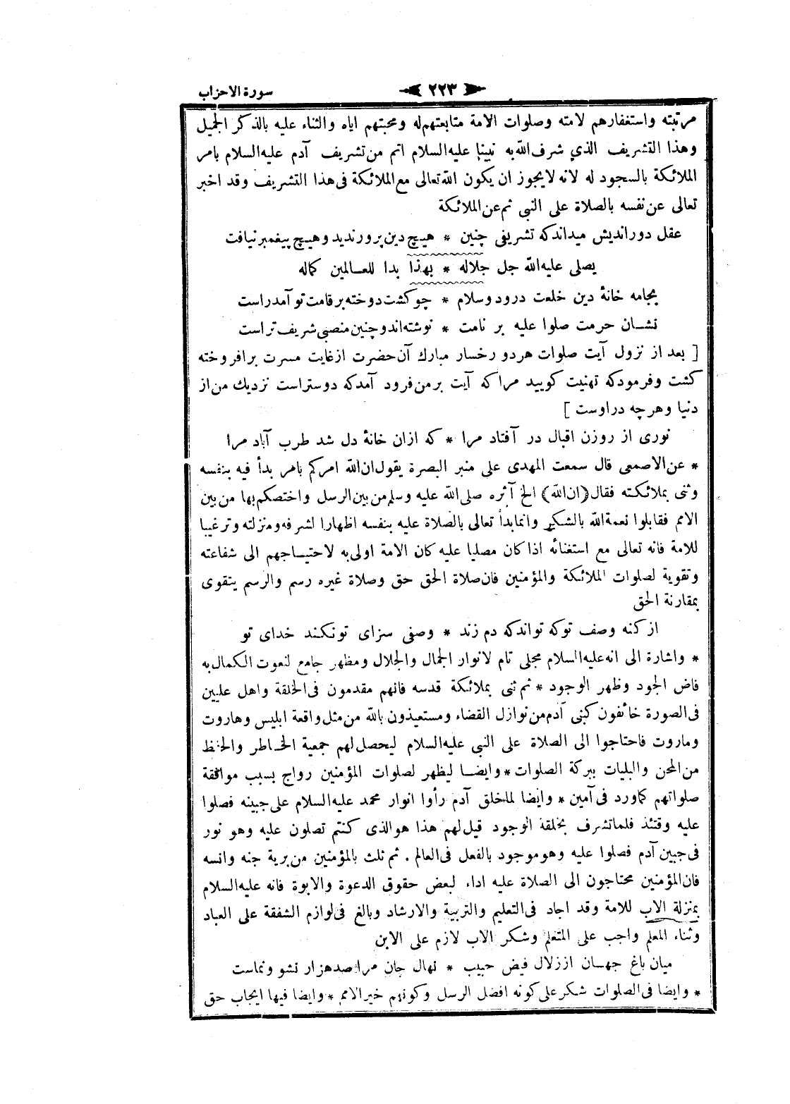 عن الأصمعي قال سمعت المهدى على منبر البصرة يقول ان الله أمركم بامر بدأ فيه بنفسه وثنى بملائكته فقال (إِنَّ اللَّهَ) إلخ آثره صلى الله عليه وسلم من بين الرسل واختصكم بها من بين الأمم فقابلوا نعمة الله بالشكر وانما بدأ تعالى بالصلاة عليه بنفسه إظهارا لشرفه ومنزلته وترغيبا للامة فانه تعالى مع استغنائه إذا كان مصليا عليه كان الامة اولى به لاحتياجهم الى شفاعته وتقوية لصلوات الملائكة والمؤمنين فان صلاة الحق حق وصلاة غيره رسم والرسم يتقوى بمقارنة الحق