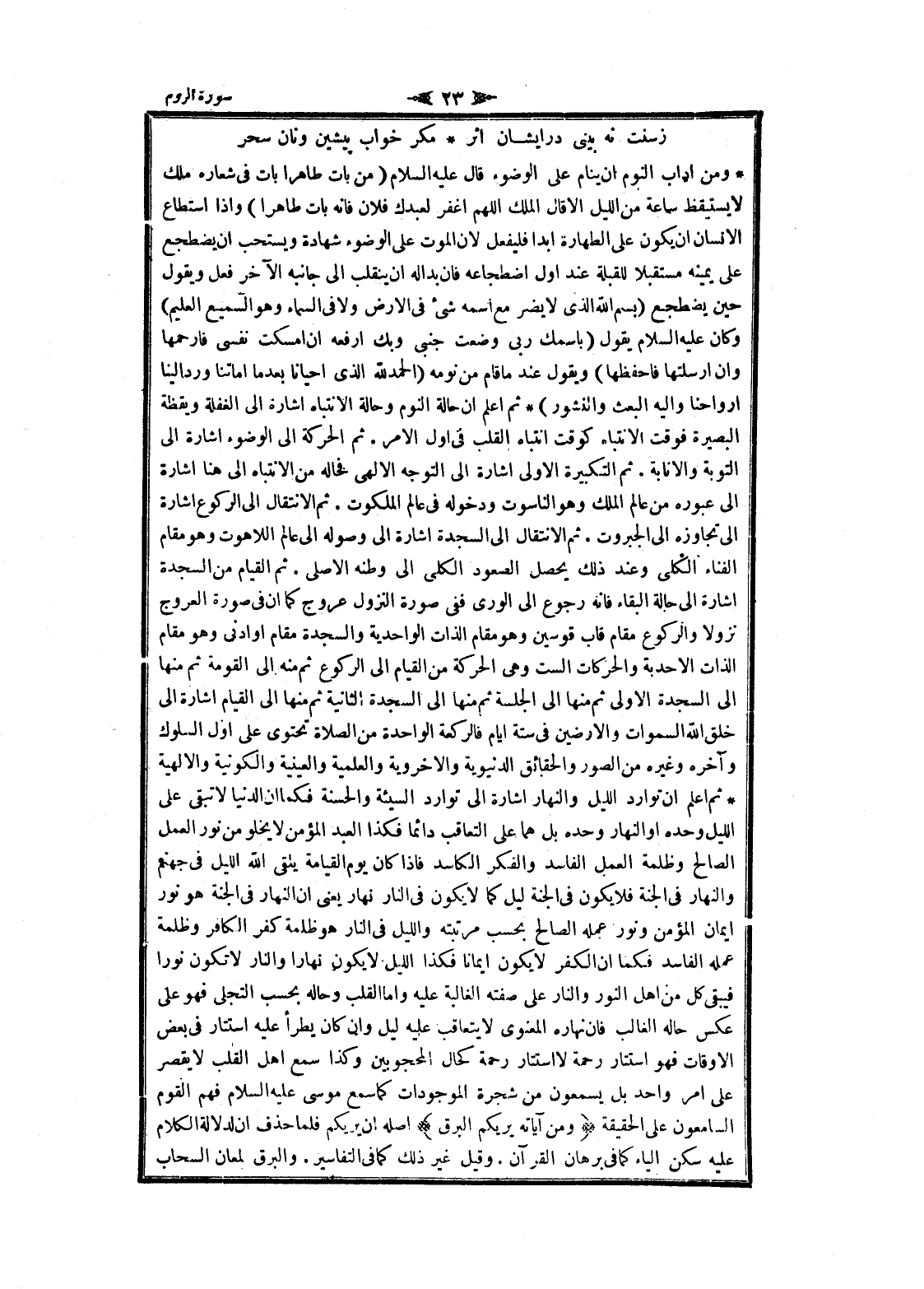ومن آداب النوم ان ينام على الوضوء قال عليه السلام (من بات طاهرا بات فى شعاره ملك لا يستيقظ ساعة من الليل إلا قال الملك اللهم اغفر لعبدك فلان فانه بات طاهرا) وإذا استطاع الإنسان ان يكون على الطهارة ابدا فليفعل لان الموت على الوضوء شهادة ويستحب ان يضطجع على يمينه مستقبلا للقبلة عند أول اضطجاعه فان بدا له ان ينقلب الى جانبه الآخر فعل ويقول حين يضطجع (بسم الله الذي لا يضر مع اسمه شىء فى الأرض ولا فى السماء وهو السميع العليم) وكان عليه السلام يقول (باسمك ربى وضعت جنبى وبك ارفعه ان أمسكت نفسى فارحمها وان أرسلتها فاحفظها) ويقول عند ما قام من نومه (الحمد لله الذي أحيانا بعد ما أماتنا ورد إلينا أرواحنا واليه البعث والنشور) ثم اعلم ان حالة النوم وحالة الانتباه اشارة الى الغفلة ويقظة البصيرة فوقت الانتباه كوقت انتباه القلب فى أول الأمر. ثم الحركة الى الوضوء اشارة الى التوبة والانابة. ثم التكبيرة الاولى اشارة الى التوجه الإلهي فحاله من الانتباه الى هنا اشارة الى عبوره من عالم الملك وهو الناسوت ودخوله فى عالم الملكوت. ثم الانتقال الى الركوع اشارة الى تجاوزه الى الجبروت. ثم الانتقال الى السجدة اشارة الى وصوله الى عالم اللاهوت وهو مقام الفناء الكلى وعند ذلك يحصل الصعود الكلى الى وطنه الأصلي. ثم القيام من السجدة اشارة الى حالة البقاء فانه رجوع الى الورى ففى صورة النزول عروج كما ان فى صورة العروج نزولا والركوع مقام قاب قوسين وهو مقام الذات الواحدية والسجدة مقام او ادنى وهو مقام الذات الاحدية والحركات الست وهى الحركة من القيام الى الركوع ثم منه الى القومة ثم منها الى السجدة الاولى ثم منها الى الجلسة ثم منها الى السجدة الثانية ثم منها الى القيام اشارة الى خلق الله السموات والأرضين فى ستة ايام فالركعة الواحدة من الصلاة تحتوى على أول السلوك وآخره وغيره من الصور والحقائق الدنيوية والاخروية والعلمية والعينية والكونية والالهية ثم اعلم ان توارد الليل والنهار اشارة الى توارد السيئة والحسنة فكما ان الدنيا لا تبقى على الليل وحده او النهار وحده بل هما على التعاقب دائما فكذا العبد المؤمن لا يخلو من نور العمل الصالح وظلمة العمل الفاسد والفكر الكاسد فاذا كان يوم القيامة يلقى الله الليل فى جهنم والنهار فى الجنة فلا يكون فى الجنة ليل كما لا يكون فى النار نهار يعنى ان النهار فى الجنة هو نور ايمان المؤمن ونور عمله الصالح بحسب مرتبته والليل فى النار هو ظلمة كفر الكافر وظلمة عمله الفاسد فكما ان الكفر لا يكون ايمانا فكذا الليل لا يكون نهارا والنار لا تكون نورا فيبقى كل من اهل النور والنار على صفته الغالبة عليه واما القلب وحاله بحسب التجلي فهو على عكس حاله الغالب فان نهاره المعنوي لا يتعاقب عليه ليل وان كان يطرأ عليه استتار فى بعض الأوقات فهو استتار رحمة لا استتار رحمة كحال المحجوبين وكذا سمع اهل القلب لا يقصر على امر واحد بل يسمعون من شجرة الموجودات كما سمع موسى عليه السلام فهم القوم السامعون على الحقيقة وَمِنْ آياتِهِ يُرِيكُمُ الْبَرْقَ أصله ان يريكم فلما حذف ان لدلالة الكلام عليه سكن الياء كما فى برهان القرآن. وقيل غير ذلك كما فى التفاسير. والبرق لمعان السحاب