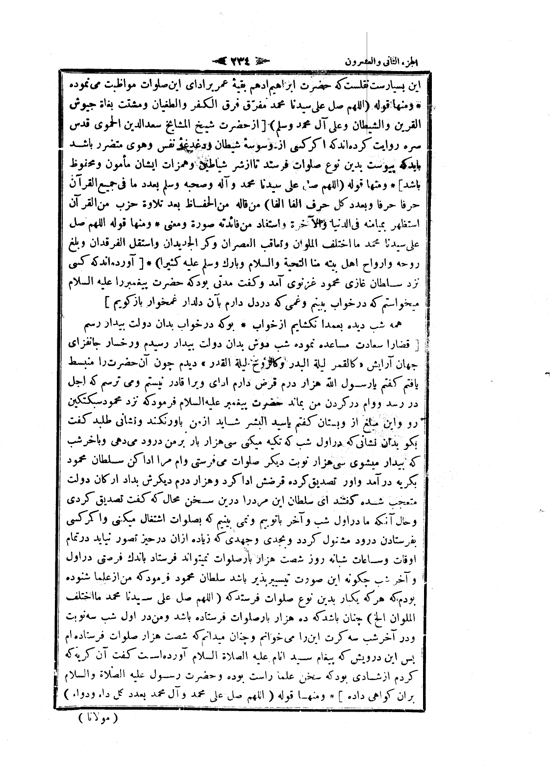 [قضا را سعادت مساعده نموده شب دوش بدان دولت بيدار رسيدم ورخسار جانفزاى جهان آرايش «كالقمر ليلة البدر وكالروح ليلة القدر» ديدم چون آن حضرت را منبسط يافتم كفتم يا رسول الله هزار درم قرض دارم اداى ويرا قادر نيستم ومى ترسم كه أجل در رسد ووام در كردن من بماند حضرت پيغمبر عليه السلام فرمود كه نزد محمود سبكتكين رو واين مبلغ ازو بستان كفتم يا سيد البشر شايد از من باور نكند ونشانى طلبد كفت بگو بدان نشانى كه در أول شب كه تكيه ميكنى سى هزار بار بر من درود مى دهى وباخر شب كه بيدار ميشوى سى هزار نوبت ديكر صلوات مى فرستى وام مرا ادا كن سلطان محمود بگريه درآمد واو را تصديق كرده قرضش ادا كرد وهزار درم ديكرش بداد اركان دولت متعجب شده كفتند اى سلطان اين مرد را درين سخن محال كه كفت تصديق كردى وحال آنكه ما در أول شب وآخر با توييم ونمى بينم كه بصلوات اشتغال ميكنى واگر كسى بفرستادن درود مشغول كردد وبجدي وجهدى كه زياده از ان در حين تصور نيايد در تمام اوقات وساعات شبانه روز شصت هزار بار صلوات نميتواند فرستاد باندك فرصتى در أول وآخر شب چكونه اين صورت تيسييرپذير باشد سلطان محمود فرمود كه من از علما شنوده بودم كه هر كه يكبار بدين نوع صلوات فرستد كه (اللهم صل على سيدنا محمد ما اختلف الملوان إلخ) چنان باشد كه ده هزار بار صلوات فرستاده باشد ومن در أول شب سه نوبت ودر آخر شب سه كرت اين را مى خوانم و چنان ميدانم كه شصت هزار صلوات فرستاده ام پس اين درويش كه پيغام سيد أنام عليه الصلاة السلام آورده است كفت آن كريه كه كردم از شادى بود كه سخن علما راست بوده وحضرت رسول عليه الصلاة والسلام بران كواهى داده] ومنها قوله (اللهم صل على محمد وآل محمد بعدد كل داء ودواء)