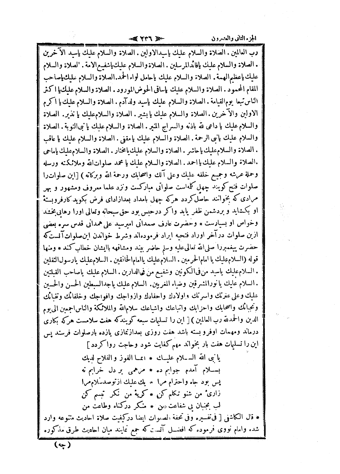 رب العالمين. الصلاة والسلام عليك يا سيد الأولين. الصلاة والسلام عليك يا سيد الآخرين. الصلاة والسلام عليك يا قائد المرسلين. الصلاة والسلام عليك يا شفيع الامة. الصلاة والسلام عليك يا عظيم الهمة. الصلاة والسلام عليك يا حامل لواء الحمد. الصلاة والسلام عليك يا صاحب المقام المحمود. الصلاة والسلام عليك يا ساقى الحوض المورود. الصلاة والسلام عليك يا اكثر الناس تبعا يوم القيامة. الصلاة والسلام عليك يا سيد ولد آدم. الصلاة والسلام عليك يا أكرم الأولين والآخرين. الصلاة والسلام عليك يا بشير. الصلاة والسلام عليك يا نذير. الصلاة والسلام عليك يا داعى لله باذنه والسراج المنير. الصلاة والسلام عليك يا نبى التوبة. الصلاة والسلام عليك يا نبى الرحمة. الصلاة والسلام عليك يا مقفى. الصلاة والسلام عليك يا عاقب. الصلاة والسلام عليك يا حاشر. الصلاة والسلام عليك يا مختار. الصلاة والسلام عليك يا ماحى. الصلاة والسلام عليك يا احمد. الصلاة والسلام عليك يا محمد صلوات الله وملائكته ورسله وحملة عرشه وجميع خلقه عليك وعلى آلك وأصحابك ورحمة الله وبركاته) [اين صلوات را صلوات فتح كويند چهل كلمه است صلواتى مباركست ونزد علما معروف ومشهور وبهر مرادى كه بخوانند حاصل كردد هر كه چهل بامداد بعد از اداى فرض بگويد كار فرو بسته او بگشايد وبر دشمن ظفر يابد واگر در حبس بود حق سبحانه وتعالى او را رهايى بخشد وخواص او بسيارست وحضرت عارف صمدانى امير سيد على همدانى قدس سره بعضى ازين صلوات در آخر أوراد فتحيه إيراد فرموده اند وشرط خواندن اين صلوات آنست كه حضرت پيغمبر را صلى الله تعالى عليه وسلم حاضر بيند ومشافهه با ايشان خطاب كند ومنها قوله (السلام عليك يا امام الحرمين. السلام عليك يا امام الخانقين. السلام عليك يا رسول الثقلين. السلام عليك يا سيد من فى الكونين وشفيع من فى الدارين. السلام عليك يا صاحب القبلتين. السلام عليك يا نور المشرقين وضياء المغربين. السلام عليك يا جد السبطين الحسن والحسين عليك وعلى عترتك وأسرتك وأولادك واحفادك وأزواجك وافواجك وخلفائك ونقبائك ونجبائك وأصحابك واحزابك واتباعك واشياعك سلام الله والملائكة والناس أجمعين الى يوم الدين والحمد لله رب العالمين) [اين را تسليمات سبعه كويند كه هفت سلامست هر كه بكارى درماند ومهمات او فرو بسته باشد هفت روزى بعد از نمازى يازده بار صلوات فرستد پس اين را تسليمات هفت بار بخواند مهم كفايت شود وحاجت روا كردد]