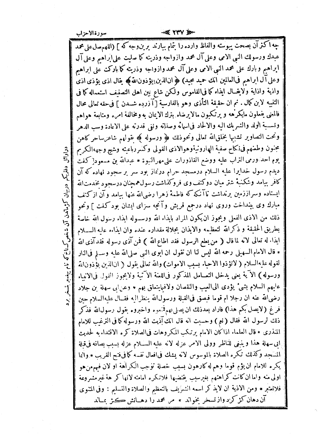 چهـ اكثر آن بصحت پيوسته وألفاظ وارده را بتمام بيارند برين وجه كه] (اللهم صل على محمد عبدك ورسولك النبي الأمي وعلى آل محمد وأزواجه وذريته كما صليت على ابراهيم وعلى آل ابراهيم وبارك على محمد النبي الأمي وعلى آل محمد وأزواجه وذريته كما باركت على ابراهيم وعلى آل ابراهيم فى العالمين انك حميد مجيد) إِنَّ الَّذِينَ يُؤْذُونَ اللَّهَ يقال أذى يؤذى أذى واذية واذاية ولا يقال إيذاء كما فى القاموس ولكن شاع بين اهل التصنيف استعماله كما فى التنبيه لابن كمال. ثم ان حقيقة التأذى وهو بالفارسية [آزرده شدن] فى حقه تعالى محال فالمعنى يفعلون ما يكرهه ويرتكبون ما لا يرضاه بترك الايمان به ومخالفة امره ومتابعة هواهم ونسبة الولد والشريك اليه والإلحاد فى أسمائه وصفاته ونفى قدرته على الاعادة وسب الدهر ونحت التصاوير تشبيها بخلق الله تعالى ونحو ذلك وَرَسُولَهُ بقولهم شاعر ساحر كاهن مجنون وطعنهم فى نكاح صفية الهارونية وهو الأذى القولى وكسر رباعيته وشج وجهه الكريم يوم أحد ورمى التراب عليه ووضع القاذورات على مهر النبوة عبد الله بن مسعود [كفت ديدم رسول خدايرا عليه السلام در مسجد حرام در نماز بود سر بر سجود نهاده كه آن كافر بيامد وشكنبه شتر ميان دو كتف وى فروگذاشت رسول همچنان در سجود بخدمت الله ايستاده وسر از زمين برنداشت تا آنكه كه فاطمه زهرا رضى الله عنها بيامد وآن از كتف مبارك وى بينداخت وروى نهاد در جمع قريش وآنچهـ سزاى ايشان بود كفت] ونحو ذلك من الأذى الفعلى ويجوز ان يكون المراد بايذاء الله ورسوله إيذاء رسول الله خاصة بطريق الحقيقة وذكر الله لتعظيمه والإيذان بجلالة مقداره عنده وان ايذاءه عليه السلام إيذاء له تعالى لانه لما قال (مَنْ يُطِعِ الرَّسُولَ فَقَدْ أَطاعَ اللَّهَ) فمن آذى رسوله فقد آذى الله قال الامام السهيلي رحمه الله ليس لنا ان نقول ان أبوي النبي صلى الله عليه وسلم فى النار لقوله عليه السلام (لا تؤذوا الاحياء بسبب الأموات) والله تعالى يقول (إِنَّ الَّذِينَ يُؤْذُونَ اللَّهَ وَرَسُولَهُ) الآية يعنى يدخل التعامل المذكور فى اللعنة الآتية ولا يجوز القول فى الأنبياء عليهم السلام بشىء يؤدى الى العيب والنقصان ولا فيما يتعلق بهم وعن ابى سهلة بن جلاد رضى الله عنه ان رجلا أم قوما فبصق فى القبلة ورسول الله ينظر اليه فقال عليه السلام حين فرغ (لا يصل بكم هذا) فاراد بعد ذلك ان يصلى بهم فمنعوه واخبروه بقول رسول الله فذكر ذلك لرسول الله فقال (نعم) وحسبت انه قال انك آذيت الله ورسوله كما فى الترغيب للامام المنذرى قال العلماء إذا كان الامام يرتكب المكروهات فى الصلاة كره الاقتداء به لحديث ابى سهلة هذا وينبغى للناظر وولى الأمر عزله لانه عليه السلام عزله بسبب بصاقه فى قبلة المسجد وكذلك تكره الصلاة بالموسوس لانه يشك فى افعال نفسه كما فى فتح القريب وانما يكره للامام ان يؤم قوما وهم له كارهون بسبب خصلة توجب الكراهة او لان فيهم من هو اولى منه واما ان كانت كراهتهم بغير سبب يقتضيها فلا تكره إمامته لانها كراهة غير مشروعة فلا تعتبر ومن الاذية ان لا يذكر اسمه الشريف بالتعظيم والصلاة والتسليم: وفى المثنوى