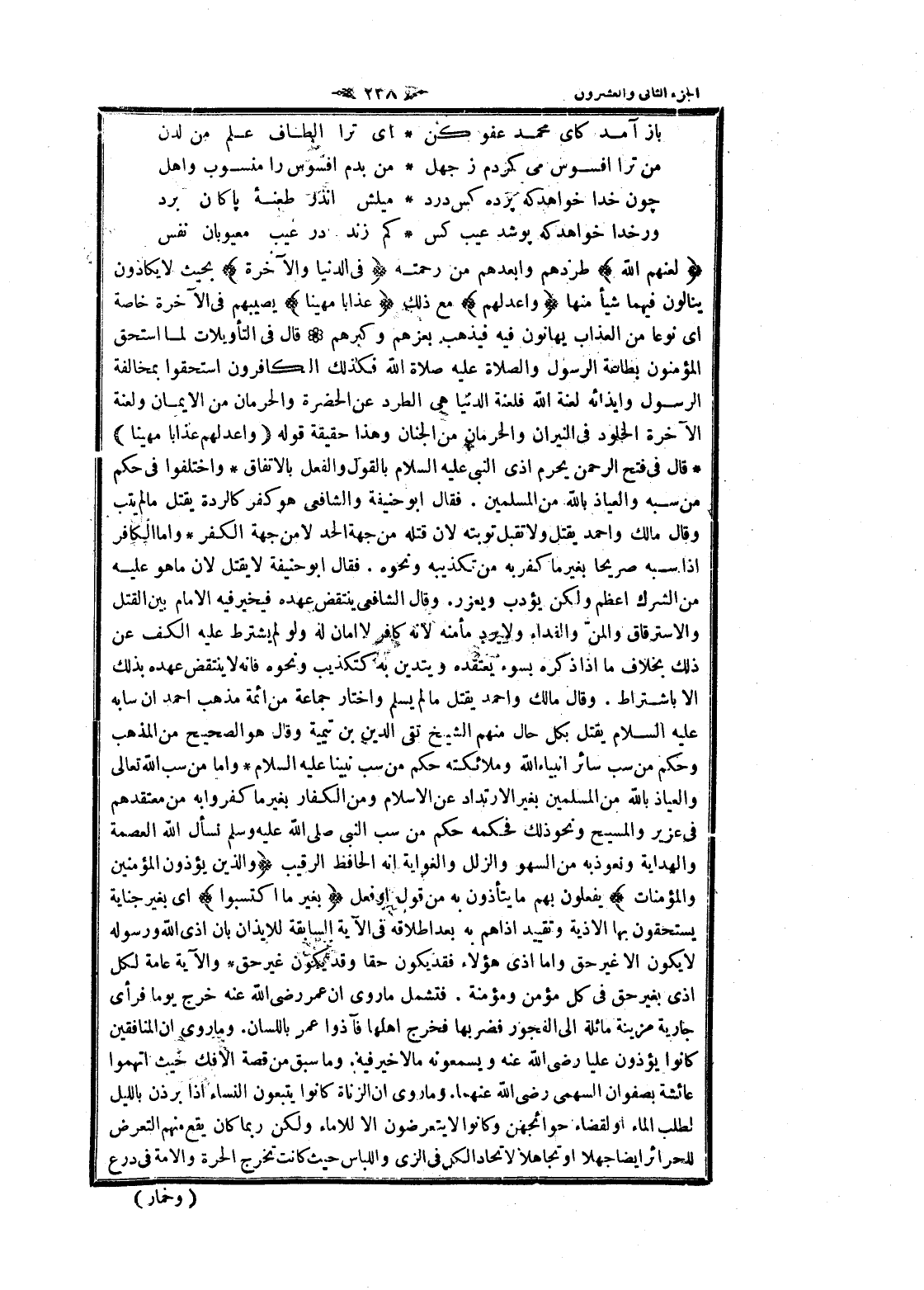 لَعَنَهُمُ اللَّهُ طردهم وابعدهم من رحمته فِي الدُّنْيا وَالْآخِرَةِ بحيث لا يكادون ينالون فيهما شيأ منها وَأَعَدَّ لَهُمْ مع ذلك عَذاباً مُهِيناً يصيبهم فى الآخرة خاصة اى نوعا من العذاب يهانون فيه فيذهب بعزهم وكبرهم قال فى التأويلات لما استحق المؤمنون بطاعة الرسول والصلاة عليه صلاة الله فكذلك الكافرون استحقوا بمخالفة الرسول وإيذائه لعنة الله فلعنة الدنيا هى الطرد عن الحضرة والحرمان من الايمان ولعنة الآخرة الخلود فى النيران والحرمان من الجنان وهذا حقيقة قوله (وَأَعَدَّ لَهُمْ عَذاباً مُهِيناً) قال فى فتح الرحمن يحرم أذى النبي عليه السلام بالقول والفعل بالاتفاق واختلفوا فى حكم من سبه والعياذ بالله من المسلمين. فقال ابو حنيفة والشافعي هو كفر كالردة يقتل ما لم يتب وقال مالك واحمد يقتل ولا تقبل توبته لان قتله من جهة الحد لا من جهة الكفر واما الكافر إذا سبه صريحا بغير ما كفر به من تكذيبه ونحوه. فقال ابو حنيفة لا يقتل لان ما هو عليه من الشرك أعظم ولكن يؤدب ويعزر. وقال الشافعي ينتقض عهده فيخير فيه الامام بين القتل والاسترقاق والمنّ والفداء ولا يرد مأمنه لانه كافر لا أمان له ولو لم يشترط عليه الكف عن ذلك بخلاف ما إذا ذكره بسوء يعتقده ويتدين به كتكذيب ونحوه فانه لا ينتقض عهده بذلك الا باشتراط. وقال مالك واحمد يقتل ما لم يسلم واختار جماعة من ائمة مذهب احمد ان سابه عليه السلام يقتل بكل حال منهم الشيخ تقى الدين بن تيمية وقال هو الصحيح من المذهب وحكم من سب سائر أنبياء الله وملائكته حكم من سب نبينا عليه السلام واما من سب الله تعالى والعياذ بالله من المسلمين بغير الارتداد عن الإسلام ومن الكفار بغير ما كفروا به من معتقدهم فى عزير والمسيح ونحو ذلك فحكمه حكم من سب النبي صلى الله عليه وسلم نسأل الله العصمة والهداية ونعوذ به من السهو والزلل والغواية انه الحافظ الرقيب وَالَّذِينَ يُؤْذُونَ الْمُؤْمِنِينَ وَالْمُؤْمِناتِ يفعلون بهم ما يتأذون به من قول او فعل بِغَيْرِ مَا اكْتَسَبُوا اى بغير جناية يستحقون بها الاذية وتقييد اذاهم به بعد إطلاقه فى الآية السابقة للايذان بان أذى الله ورسوله لا يكون الا غير حق واما أذى هؤلاء فقد يكون حقا وقد يكون غير حق والآية عامة لكل أذى بغير حق فى كل مؤمن ومؤمنة. فتشمل ما روى ان عمر رضى الله عنه خرج يوما فرأى جارية مزينة مائلة الى الفجور فضربها فخرج أهلها فآذوا عمر باللسان. وما روى ان المنافقين كانوا يؤذون عليا رضى الله عنه ويسمعونه ما لا خير فيه. وما سبق من قصة الافك حيث اتهموا عائشة بصفوان السهمي رضى الله عنهما. وما روى ان الزناة كانوا يتبعون النساء إذا برذن بالليل لطلب الماء او لقضاء حوائجهن وكانوا لا يتعرضون الا للاماء ولكن ربما كان يقع منهم التعرض للحرائر ايضا جهلا او تجاهلا لاتحاد الكل فى الزي واللباس حيث كانت تخرج الحرة والامة فى درع
