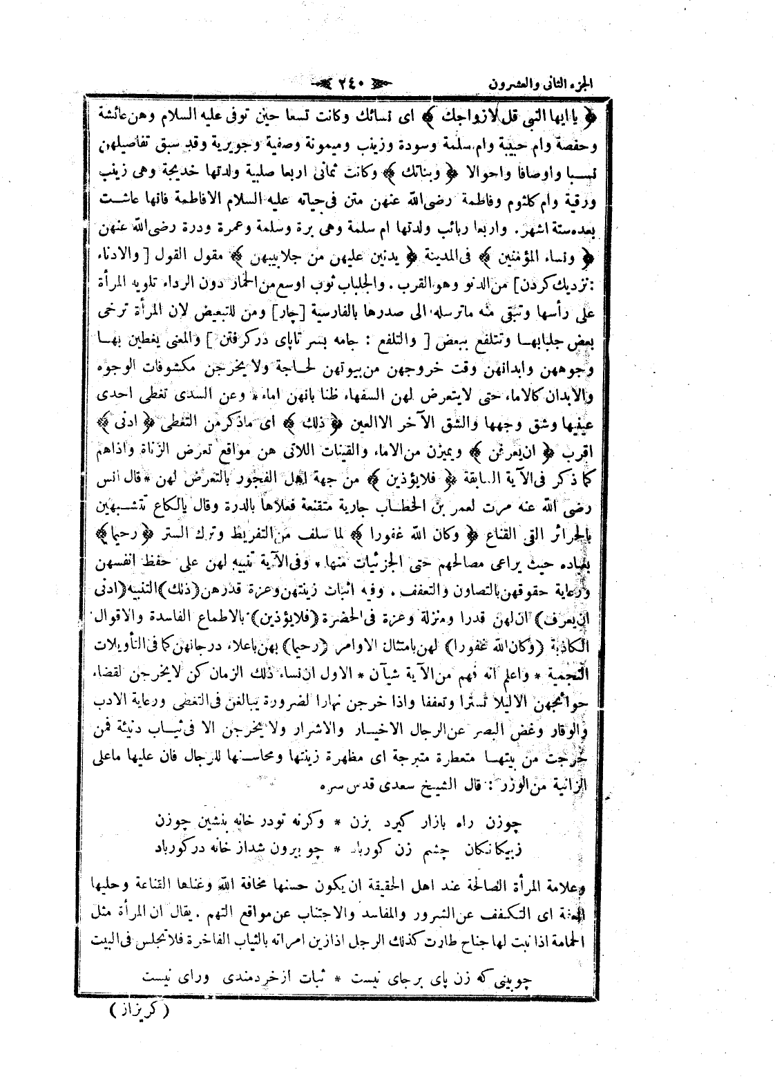 يا أَيُّهَا النَّبِيُّ قُلْ لِأَزْواجِكَ اى نسائك وكانت تسعا حين توفى عليه السلام وهن عائشة وحفصة وأم حبيبة وأم سلمة وسودة وزينب وميمونة وصفية وجويرية وقد سبق تفاصيلهن نسبا واوصافا وأحوالا وَبَناتِكَ وكانت ثمانى أربعا صلبية ولدتها خديجة وهى زينب ورقية وأم كلثوم وفاطمة رضى الله عنهن متن فى حياته عليه السلام الا فاطمة فانها عاشت بعده ستة أشهر. وأربعا ربائب ولدتها أم سلمة وهى برة وسلمة وعمرة ودرة رضى الله عنهن وَنِساءِ الْمُؤْمِنِينَ فى المدينة يُدْنِينَ عَلَيْهِنَّ مِنْ جَلَابِيبِهِنَّ مقول القول [والادناء: نزديك كردن] من الدنو وهو القرب. والجلباب ثوب أوسع من الخمار دون الرداء تلويه المرأة على رأسها وتبقى منه ما ترسله الى صدرها بالفارسية [چار] ومن للتبعيض لان المرأة ترخى بعض جلبابها وتتلفع ببعض [والتلفع: جامه بسر تا پاى درگرفتن] والمعنى يغطين بها وجوههن وأبدانهن وقت خروجهن من بيوتهن لحاجة ولا يخرجن مكشوفات الوجوه والأبدان كالاماء حتى لا يتعرض لهن السفهاء ظنا بانهن إماء وعن السدى تغطى احدى عينيها وشق وجهها والشق الآخر الا العين ذلِكَ اى ما ذكر من التغطى أَدْنى اقرب أَنْ يُعْرَفْنَ ويميزن من الإماء والقينات اللاتي هن مواقع تعرض الزناة واذاهم كما ذكر فى الآية السابقة فَلا يُؤْذَيْنَ من جهة اهل الفجور بالتعرض لهن قال انس رضى الله عنه مرت لعمر بن الخطاب جارية متقنعة فعلاها بالدرة وقال يا لكاع تتشبهين بالحرائر القى القناع وَكانَ اللَّهُ غَفُوراً لما سلف من التفريط وترك الستر رَحِيماً بعباده حيث يراعى مصالحهم حتى الجزئيات منها وفى الآية تنبيه لهن على حفظ انفسهن ورعاية حقوقهن بالتصاون والتعفف. وفيه اثبات زينتهن وعزة قدرهن (ذلِكَ) التنبيه (أَدْنى أَنْ يُعْرَفْنَ) ان لهن قدرا ومنزلة وعزة فى الحضرة (فَلا يُؤْذَيْنَ) بالاطماع الفاسدة والأقوال الكاذبة (وَكانَ اللَّهُ غَفُوراً) لهن بامتثال الأوامر (رَحِيماً) بهن بإعلاء درجاتهن كما فى التأويلات النجمية واعلم انه فهم من الآية شيآن الاول ان نساء ذلك الزمان كن لا يخرجن لقضاء حوائجهن الا ليلا تسترا وتعففا وإذا خرجن نهارا لضرورة يبالغن فى التغطى ورعاية الأدب والوقار وغض البصر عن الرجال الأخيار والأشرار ولا يخرجن الا فى ثياب دنيئة فمن خرجت من بيتها متعطرة متبرجة اى مظهرة زينتها ومحاسنها للرجال فان عليها ما على الزانية من الوزر: قال الشيخ سعدى قدس سره