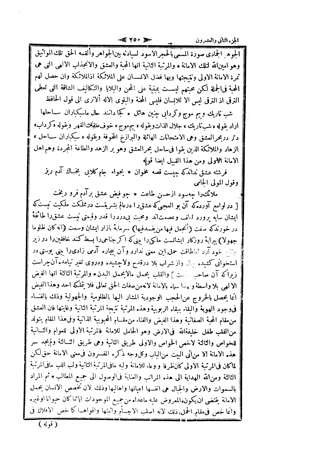 [در لوامع آورده كه آن بو العجبى كه عشق را در عالم بشريتست در مملكت ملكيت نيست كه ايشان سايه پرورد لطف وعصمت اند ومحبت بى درد را قدر وقيمتى نيست عشق را طائفه درخورند كه صفت (أَتَجْعَلُ فِيها مَنْ يُفْسِدُ فِيها) سرمايه بازار ايشان وسمت (إِنَّهُ كانَ ظَلُوماً جَهُولًا) پيرايه روزكار ايشانست ملكى را بينى كه اگر جناحى را بسط كند خافقين را در زير جناح خود آرد اما طاقت حمل اين معنى ندارد وآن بيچاره آدمى زادى را بينى پوستى در استخوانى كشيده بيباك واز شراب بلا در قدح ولا چشيده ودر وى تغير نيامده آن چراست زيرا كه آن صاحب دلست] والقلب يحمل ما لا يحمل البدن والمرتبة الثالثة انها الفيض الإلهي بلا واسطة ولهذا سماه بالامانة لانه من صفات الحق تعالى فلا يتملكه أحد وهذا الفيض انما يحصل بالخروج عن الحجب الوجودية المشار إليها بالظلومية والجهولية وذلك بالفناء فى وجود الهوية والبقاء ببقاء الربوبية وهذه المرتبة نتيجة المرتبة الثانية وغايتها فان العشق من مقام المحبة الصفاتية وهذا الفيض والفناء من مقام المحبوبية الذاتية وفى هذا