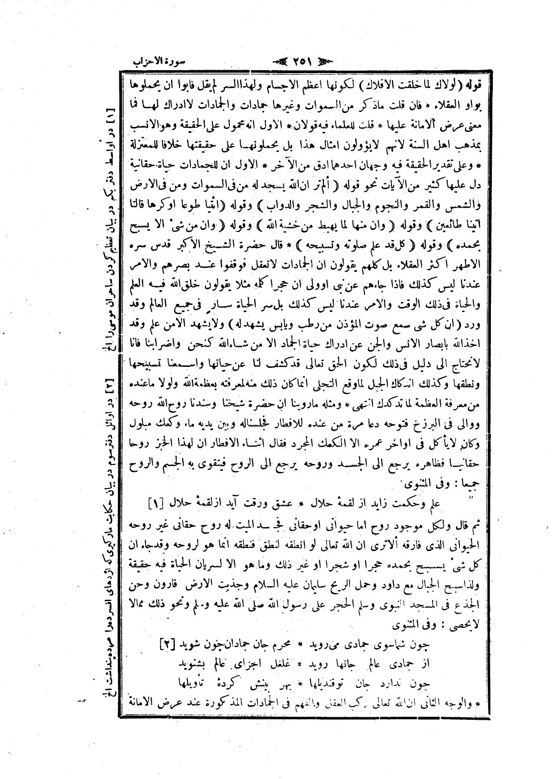 وقوله (ائْتِيا طَوْعاً أَوْ كَرْهاً قالَتا أَتَيْنا طائِعِينَ) وقوله (وَإِنَّ مِنْها لَما يَهْبِطُ مِنْ خَشْيَةِ اللَّهِ) وقوله (وَإِنْ مِنْ شَيْءٍ إِلَّا يُسَبِّحُ بِحَمْدِهِ) وقوله (كُلٌّ قَدْ عَلِمَ صَلاتَهُ وَتَسْبِيحَهُ) قال حضرة الشيخ الأكبر قدس سره الأطهر اكثر العقلاء بل كلهم يقولون ان الجمادات لا تعقل فوقفوا عند بصرهم والأمر عندنا ليس كذلك فاذا جاءهم عن نبى او ولى ان حجرا كلمه مثلا يقولون خلق الله فيه العلم والحياة فى ذلك الوقت والأمر عندنا ليس كذلك بل سر الحياة سار فى جميع العالم وقد ورد (ان كل شى سمع صوت المؤذن من رطب ويابس يشهد له) ولا يشهد الا من علم وقد أخذ الله بابصار الانس والجن عن ادراك حياة الجماد الا من شاء الله كنحن واضرابنا فانا لا نحتاج الى دليل فى ذلك لكون الحق تعالى قد كشف لنا عن حياتها وأسمعنا تسبيحها ونطقها وكذلك اندكاك الجبل لما وقع التجلي انما كان ذلك منه لمعرفته بعظمة الله ولولا ما عنده من معرفة العظمة لما تدكدك انتهى ومثله ما روينا ان حضرة شيخنا وسندنا روح الله روحه ووالى فى البرزخ فتوحه دعا مرة من عنده للافطار فجلسنا له وبين يديه ماء وكعك مبلول وكان لا يأكل فى اواخر عمره الا الكعك المجرد فقال أثناء الإفطار ان لهذا الخبر روحا حقانيا فظاهره يرجع الى الجسد وروحه يرجع الى الروح فيتقوى به الجسم والروح جميعا: وفى المثنوى