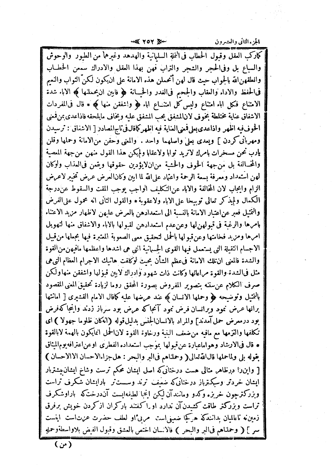 كما ركب العقل وقبول الخطاب فى النملة السليمانية والهدهد وغيرهما من الطيور والوحوش والسباع بل وفى الحجر والشجر والتراب فهن بهذا العقل والإدراك سمعن الخطاب وانطقهن الله بالجواب حيث قال لهن أتحملن هذه الامانة على ان يكون لكنّ الثواب والنعيم فى الحفظ والأداء والعقاب والجحيم فى الغدر والخيانة فَأَبَيْنَ أَنْ يَحْمِلْنَها الإباء شدة الامتناع فكل اباء امتناع وليس كل امتناع اباء وَأَشْفَقْنَ مِنْها قال فى المفردات الإشفاق عناية مختلطة بخوف لان المشفق يحب المشفق عليه ويخاف ما يلحقه فاذا عدى بمن فمعنى الخوف فيه اظهر وإذا عدى بعلى فمعنى العناية فيه اظهر كما قال فى تاج المصادر [الإشفاق: ترسيدن ومهربانى كردن] ويعدى بعلى وأصلهما واحد. والمعنى وحفن من الامانة وحملها وقلن يا رب نحن مسخرات بامرك لا نريد ثوابا ولا عقابا ولم يكن هذا القول منهن من جهة المعصية والمخالفة بل من جهة الخوف والخشية من ان لا يؤدين حقوقها ويقعن فى العذاب ولو كان لهن استعداد ومعرفة بسعة الرحمة واعتماد على الله لما أبين وكان العرض عرض تخيير لا عرض الزام وإيجاب لان المخالفة والإباء عن التكليف الواجب يوجب المقت والسقوط عن درجة الكمال ولم يذكر تعالى توبيخا على الإباء ولا عقوبة والقول الثاني انه محمول على الفرض والتمثيل فعبر عن اعتبار الامانة بالنسبة الى استعدادهن بالعرض عليهن لاظهار مزيد الاعتناء بامرها والرغبة فى قبولهن لها وعن عدم استعدادهن لقبولها بالاباء والإشفاق منها لتهويل أمرها ومزيد فخامتها وعن قبولها بالحمل لتحقيق معنى الصعوبة المعتبرة فيها بجعلها من قبيل الأجسام الثقيلة التي يستعمل فيها القوى الجسمانية التي هى أشدها وأعظمها ما فيهن من القوة والشدة فالمعنى ان تلك الامانة فى عظم الشأن بحيث لو كلفت هاتيك الاجرام العظام التي هى مثل فى الشدة والقوة مراعاتها وكانت ذات شهود وادراك لا بين قبولها وأشفقن منها ولكن صرف الكلام عن سننه بتصوير المفروض بصورة المحقق روما لزيادة تحقيق المعنى المقصود بالتمثيل وتوضيحه وَحَمَلَهَا الْإِنْسانُ عند عرضها عليه كما قال الامام القشيري [امانتها بر انها عرض نمود وبر انسان فرض نمود آنجا كه عرض بود سر باز زدند واينجا كه فرض بود در معرض حمل آمدند] والمراد بالإنسان الجنس بدليل قوله (إِنَّهُ كانَ ظَلُوماً جَهُولًا) اى تكلفها والتزمها مع ما فيه من ضعف البنية ورخاوة القوة لان الحمل انما يكون بالهمة لا بالقوة قال فى الإرشاد وهو اما عبارة عن قبولها بموجب استعداده الفطري او عن اعترافه يوم الميثاق بقوله بلى ولما حملها قال الله تعالى (وَحَمَلْناهُمْ فِي الْبَرِّ وَالْبَحْرِ: هَلْ جَزاءُ الْإِحْسانِ إِلَّا الْإِحْسانُ) [واين را در ظاهر مثالى هست درختانى كه اصل ايشان محكم ترست وشاخ ايشان بيشتر بار ايشان خردتر وسبكتر باز درختانى كه ضعيف ترند وسست تر بار ايشان شكرف تر است وبزركتر چون خربزه وكدو ومانند آن ليكن اينجا لطيفه ايست آن درخت كه بار او شكرف تر است وبزركتر طاقت كشيدن آن ندارد او را كفتند بار كران از كردن خويش بر فرق زمين نه تا عالميان بدانند كه هر كجا ضعيفى است مربىء او لطف حضرت عزت است اينست سر] (وَحَمَلْناهُمْ فِي الْبَرِّ وَالْبَحْرِ) فالانسان اختص بالعشق وقبول الفيض بلا واسطة وحمله