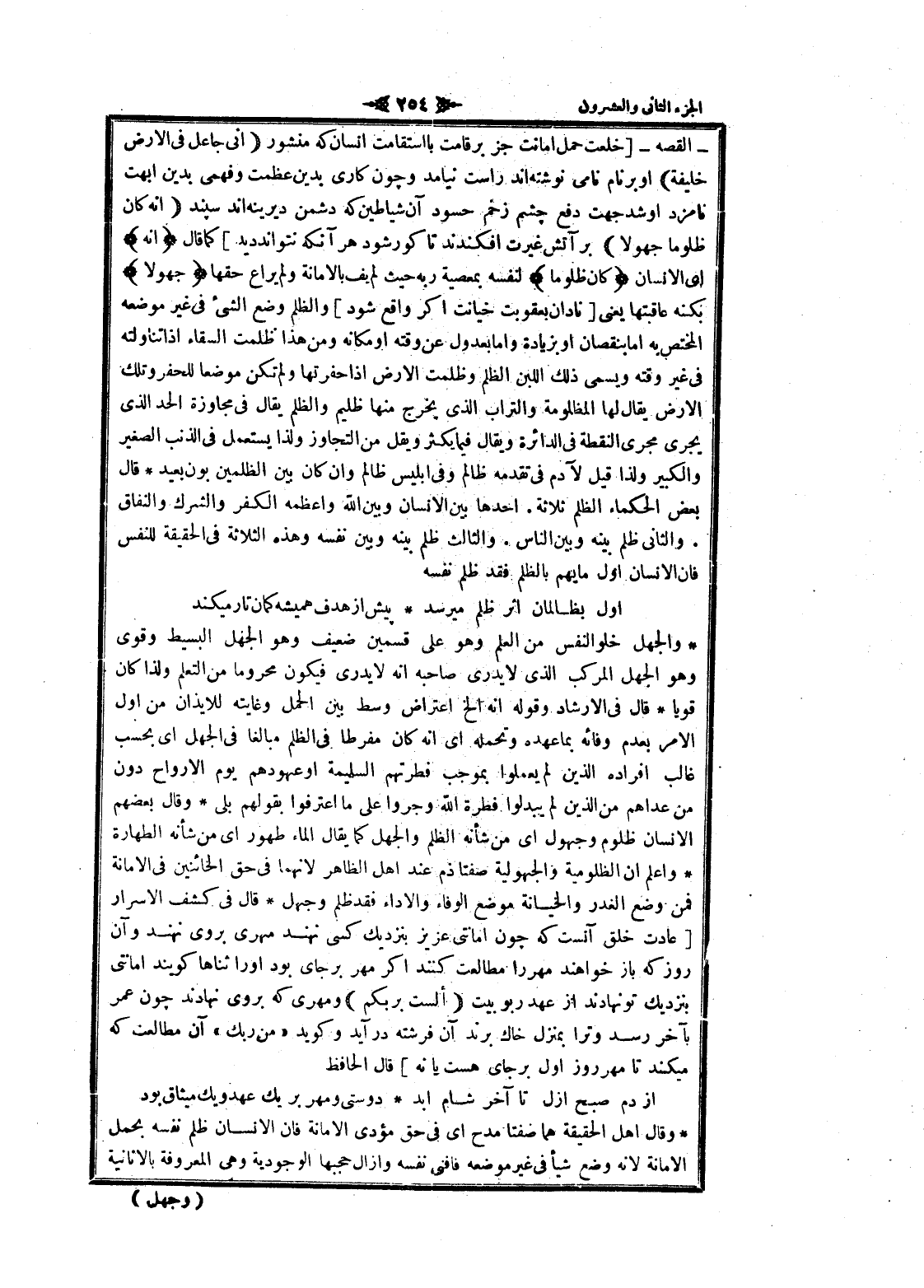 - القصة-[خلعت حمل امانت جز بر قامت با استقامت انسان كه منشور (إِنِّي جاعِلٌ فِي الْأَرْضِ خَلِيفَةً) او بر نام نامى نوشته اند راست نيامد و چون كارى بدين عظمت وفهمى بدين ابهت نامزد او شد جهت دفع چشم زخم حسود آن شياطين كه دشمن ديرينه اند سپند (إِنَّهُ كانَ ظَلُوماً جَهُولًا) بر آتش غيرت افكندند تا كور شود هر آنكه نتواند ديد] كما قال إِنَّهُ اى الإنسان كانَ ظَلُوماً لنفسه بمعصية ربه حيث لم يف بالامانة ولم يراع حقها جَهُولًا بكنه عاقبتها يعنى [نادان بعقوبت خيانت اگر واقع شود] والظلم وضع الشيء فى غير موضعه المختص به اما بنقصان او بزيادة واما بعدول عن وقته او مكانه ومن هذا ظلمت السقاء إذا تناولته فى غير وقته ويسمى ذلك اللبن الظلم وظلمت الأرض إذا حفرتها ولم تكن موضعا للحفر وتلك الأرض يقال لها المظلومة والتراب الذي يخرج منها ظليم والظلم يقال فى مجاوزة الحد الذي يجرى مجرى النقطة فى الدائرة ويقال فيما يكثر ويقل من التجاوز ولذا يستعمل فى الذنب الصغير والكبير ولذا قيل لآدم فى تقدمه ظالم وفى إبليس ظالم وان كان بين الظلمين بون بعيد قال بعض الحكماء الظلم ثلاثة. أحدها بين الإنسان وبين الله وأعظمه الكفر والشرك والنفاق. والثاني ظلم بينه وبين الناس. والثالث ظلم بينه وبين نفسه وهذه الثلاثة فى الحقيقة للنفس فان الإنسان أول مايهم بالظلم فقد ظلم نفسه