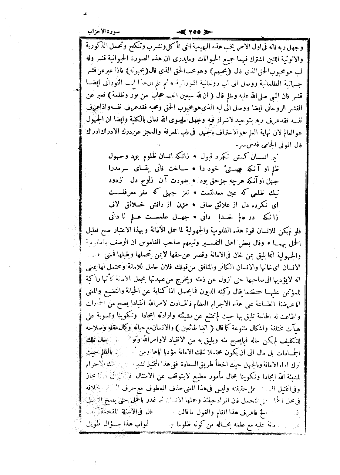 وجهل ربه فانه فى أول الأمر يخب هذه البهيمية التي تأكل وتشرب وتنكح وتحمل الذكورية والأنوثية اللتين اشترك فيهما جميع الحيوانات وما يدرى ان هذه الصورة الحيوانية قشر وله لب هو محبوب الحق الذي قال (يُحِبُّهُمْ) وهو محب الحق الذي قال (يُحِبُّونَهُ) فاذا عبر عن قشر جسمانية الظلمانية ووصل الى لب روحانية النورانية ثم علم ان هذا اللب النورانى ايضا قشر فان النبي صلى الله عليه وسلم قال (ان لله سبعين الف حجاب من نور وظلمة) فعبر عن القشر الروحاني ايضا ووصل الى لبه الذي هو محبوب الحق ومحبه فقد عرف نفسه وإذا عرف نفسه فقد عرف ربه بتوحيد لا شرك فيه وجهل ما سوى الله تعالى بالكلية وايضا ان الجهول هو العالم لان نهاية العلم هو الاعتراف بالجهل فى باب المعرفة والعجز عن درك الإدراك ادراك قال المولى الجامى قدس سره