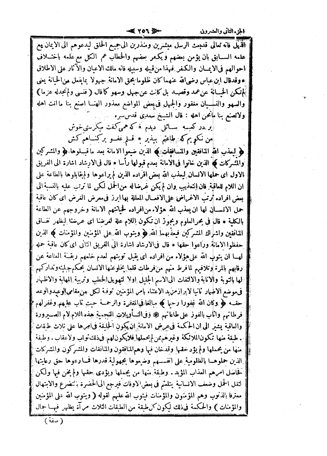 الذيل فانه تعالى قد بعث الرسل مبشرين ومنذرين الى جميع الخلق ليدعوهم الى الايمان مع علمه السابق بان يؤمن بعضهم ويكفر بعضهم والخطاب عم الكل مع علمه باختلاف أحوالهم فى الايمان والكفر فهذا من قبيله وسبيله فانه مالك الأعيان والآثار على الإطلاق وقد قال ابن عباس رضى الله عنهما كان ظلوما بحق الامانة جهولا بما يفعل من الخيانة يعنى لم تكن الخيانة عن عمد وقصد بل كانت عن جهل وسهو كما قال (فَنَسِيَ وَلَمْ نَجِدْ لَهُ عَزْماً) والسهو والنسيان مغفور والجهل فى بعض المواضع معذور الهنا اصنع بنا ما أنت اهله ولا تصنع بنا ما نحن اهله: قال الشيخ سعدى قدس سره