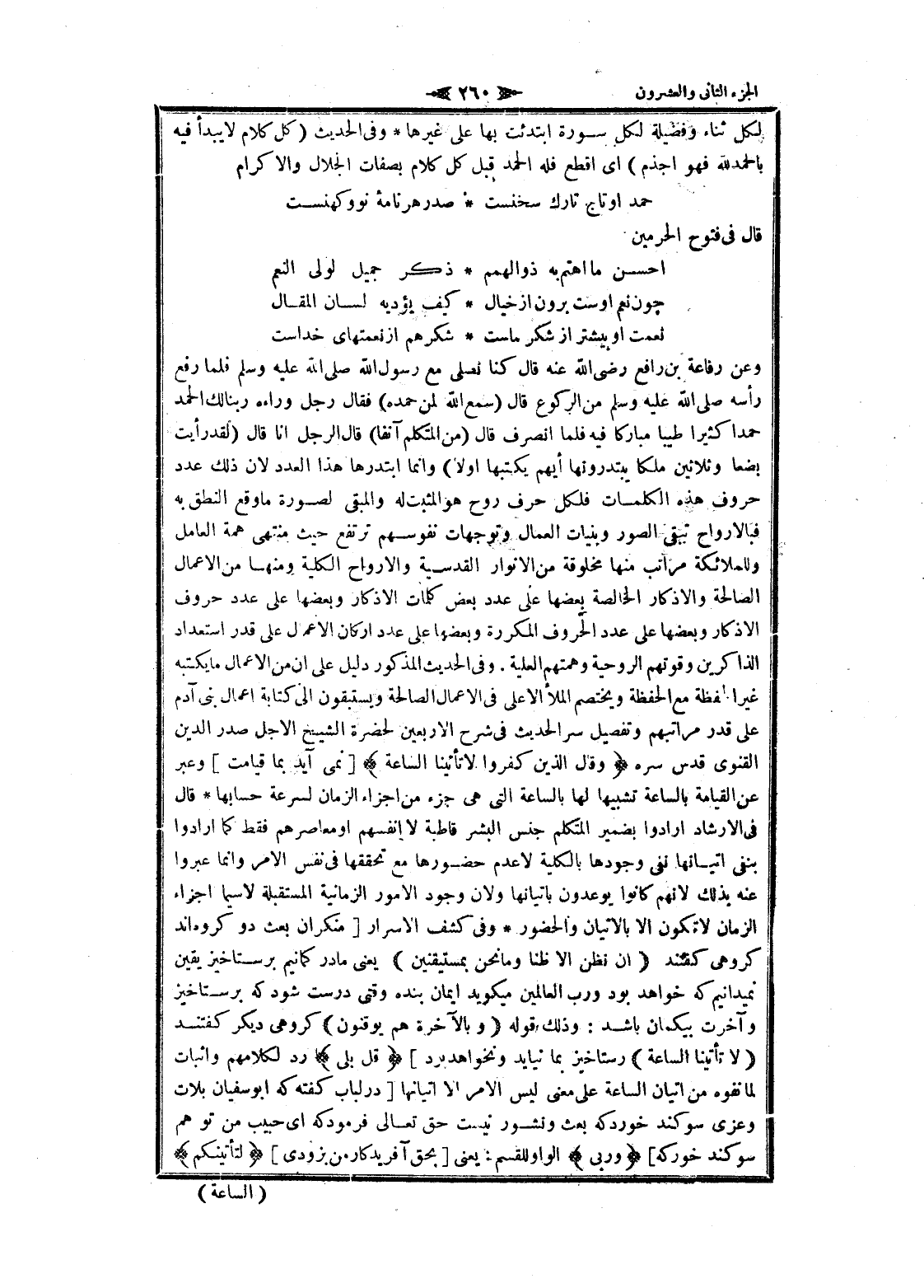 وعن رفاعة بن رافع رضى الله عنه قال كنا نصلى مع رسول الله صلى الله عليه وسلم فلما رفع رأسه صلى الله عليه وسلم من الركوع قال (سمع الله لمن حمده) فقال رجل وراءه ربنا لك الحمد حمدا كثيرا طيبا مباركا فيه فلما انصرف قال (من المتكلم آنفا) قال الرجل انا قال (لقد رأيت بضعا وثلاثين ملكا يبتدرونها أيهم يكتبها اولا) وانما ابتدرها هذا العدد لان ذلك عدد حروف هذه الكلمات فلكل حرف روح هو المثبت له والمبقى لصورة ما وقع النطق به فبالارواح تبقى الصور وبنيات العمال وتوجهات نفوسهم ترتفع حيث منتهى همة العامل وللملائكة مراتب منها مخلوقة من الأنوار القدسية والأرواح الكلية ومنها من الأعمال الصالحة والاذكار الخالصة بعضها على عدد بعض كلمات الاذكار وبعضها على عدد حروف الاذكار وبعضها على عدد الحروف المكررة وبعضها على عدد اركان الأعمال على قدر استعداد الذاكرين وقوتهم الروحية وهمتهم العلية. وفى الحديث المذكور دليل على ان من الأعمال ما يكتبه غير الحفظة مع الحفظة ويختصم الملأ الأعلى فى الأعمال الصالحة ويستبقون الى كتابة اعمال بنى آدم على قدر مراتبهم وتفصيل سر الحديث فى شرح الأربعين لحضرة الشيخ الاجل صدر الدين القنوى قدس سره وَقالَ الَّذِينَ كَفَرُوا لا تَأْتِينَا السَّاعَةُ [نمى آيد بما قيامت] وعبر عن القيامة بالساعة تشبيها لها بالساعة التي هى جزء من اجزاء الزمان لسرعة حسابها قال فى الإرشاد أرادوا بضمير المتكلم جنس البشر قاطبة لا أنفسهم او معاصرهم فقط كما أرادوا بنفي إتيانها نفى وجودها بالكلية لا عدم حضورها مع تحققها فى نفس الأمر وانما عبروا عنه بذلك لانهم كانوا يوعدون بإتيانها ولان وجود الأمور الزمانية المستقبلة لا سيما اجزاء الزمان لا تكون الا بالإتيان والحضور وفى كشف الاسرار [منكران بعث دو كروه اند كروهى كفتند (إِنْ نَظُنُّ إِلَّا ظَنًّا وَما نَحْنُ بِمُسْتَيْقِنِينَ) يعنى ما در كمانيم برستاخيز يقين نميدانيم كه خواهد بود ورب العالمين ميكويد ايمان بنده وقتى درست شود كه برستاخيز وآخرت بيكمان باشد: وذلك قوله (وَبِالْآخِرَةِ هُمْ يُوقِنُونَ) كروهى ديكر كفتند (لا تَأْتِينَا السَّاعَةُ) رستاخيز بما نيايد ونخواهد بود] قُلْ بَلى رد لكلامهم واثبات لما نفوه من إتيان الساعة على معنى ليس الأمر الا إتيانها [در لباب كفته كه ابو سفيان بلات وعزى سوكند خورد كه بعث ونشور نيست حق تعالى فرمود كه اى حبيب من تو هم سوكند خور كه] وَرَبِّي الواو للقسم: يعنى [بحق آفريدگار من بزودى] لَتَأْتِيَنَّكُمْ