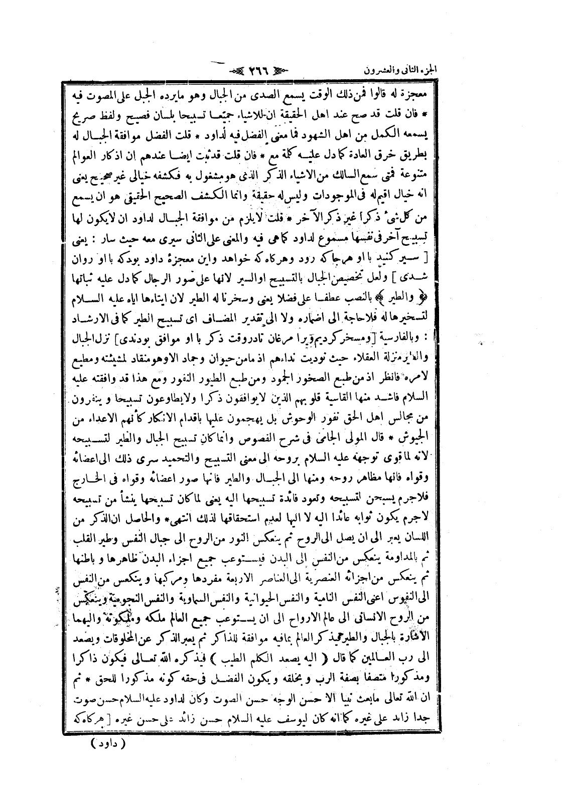 يهجمون عليها باقدام الإنكار كأنهم الأعداء من الجيوش قال المولى الجامى فى شرح الفصوص وانما كان تسبيح الجبال والطير لتسبيحه لانه لما قوى توجهه عليه السلام بروحه الى معنى التسبيح والتحميد سرى ذلك الى أعضائه وقواه فانها مظاهر روحه ومنها الى الجبال والطير فانها صور أعضائه وقواه فى الخارج فلا جرم يسبحن لتسبيحه وتعود فائدة تسبيحها اليه يعنى لما كان تسبيحها ينشأ من تسبيحه لا جرم يكون ثوابه عائدا اليه لا إليها لعدم استحقاقها لذلك انتهى والحاصل ان الذكر من اللسان يعبر الى ان يصل الى الروح ثم ينعكس النور من الروح الى جبال النفس وطير القلب ثم بالمداومة ينعكس من النفس الى البدن فيستوعب جميع اجزاء البدن ظاهرها وباطنها ثم ينعكس من اجزائه العنصرية الى العناصر الاربعة مفردها ومركبها وينعكس من النفس الى النفوس اعنى النفس النامية والنفس الحيوانية والنفس السماوية والنفس النجومية وينعكس من الروح الإنساني الى عالم الأرواح الى ان يستوعب جميع العالم ملكه وملكوته وإليهما الاشارة بالجبال والطير فيذكر العالم بما فيه موافقة للذاكر ثم يعبر الذكر عن المخلوقات ويصعد الى رب العالمين كما قال (إِلَيْهِ يَصْعَدُ الْكَلِمُ الطَّيِّبُ) فيذكره الله تعالى فيكون ذاكرا ومذكورا متصفا بصفة الرب وبخلقه ويكون الفضل فى حقه كونه مذكورا للحق ثم ان الله تعالى ما بعث نبيا الا حسن الوجه حسن الصوت وكان لداود عليه السلام حسن صوت جدا زائد على غيره كما انه كان ليوسف عليه السلام حسن زائد على حسن غيره [هر كاه كه