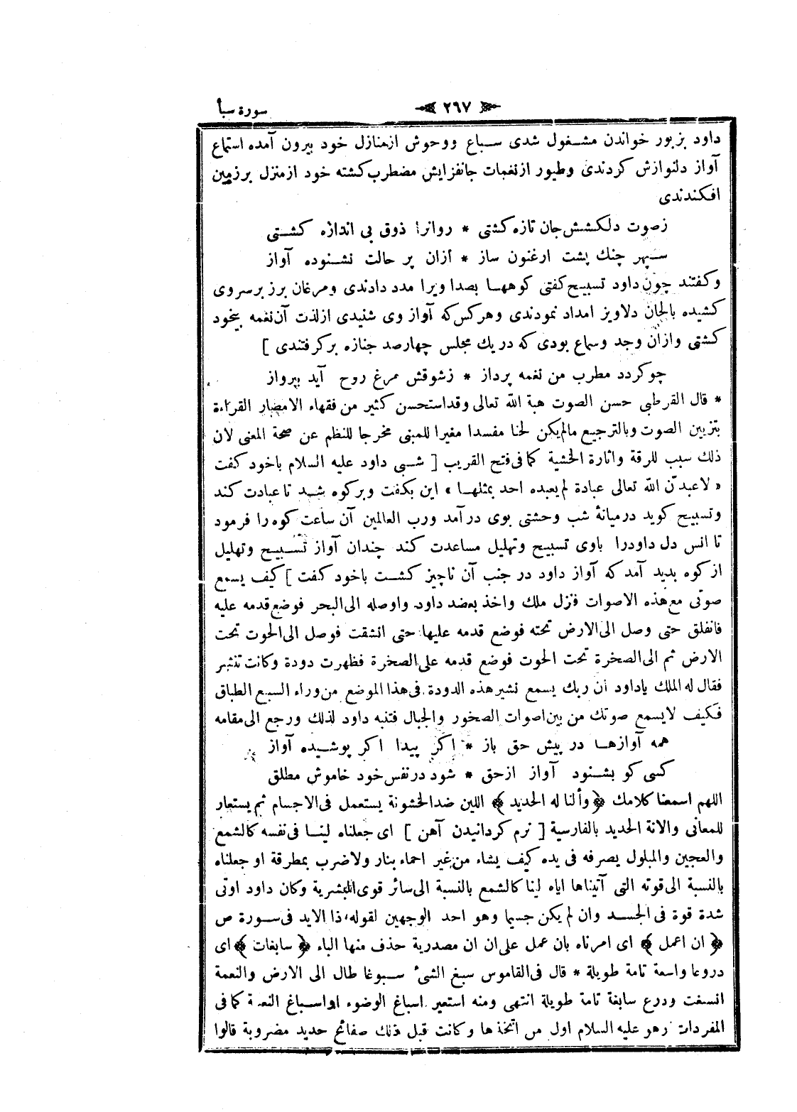قال القرطبي حسن الصوت هبة الله تعالى وقد استحسن كثير من فقهاء الأمصار القراءة بتزيين الصوت وبالترجيع ما لم يكن لحنا مفسدا مغيرا للمبنى مخرجا للنظم عن صحة المعنى لان ذلك سبب للرقة واثارة الخشية كما فى فتح القريب [شبى داود عليه السلام با خود كفت «لا عبدّن الله تعالى عبادة لم يعبده أحد بمثلها» اين بكفت وبر كوه شد تا عبادت كند وتسبيح كويد در ميانه شب وحشتي بوى درآمد ورب العالمين آن ساعت كوه را فرمود تا انس دل داود را با وى تسبيح وتهليل مساعدت كند چندان آواز تسبيح وتهليل از كوه پديد آمد كه آواز داود در جنب آن ناچيز كشت با خود كفت] كيف يسمع صوتى مع هذه الأصوات فنزل ملك وأخذ بعضد داود وأوصله الى البحر فوضع قدمه عليه فانفلق حتى وصل الى الأرض تحته فوضع قدمه عليها حتى انشقت فوصل الى الحوت تحت الأرض ثم الى الصخرة تحت الحوت فوضع قدمه على الصخرة فظهرت دودة وكانت تنشر فقال له الملك يا داود ان ربك يسمع نشير هذه الدودة فى هذا الموضع من وراء السبع الطباق فكيف لا يسمع صوتك من بين أصوات الصخور والجبال فتنبه داود لذلك ورجع الى مقامه