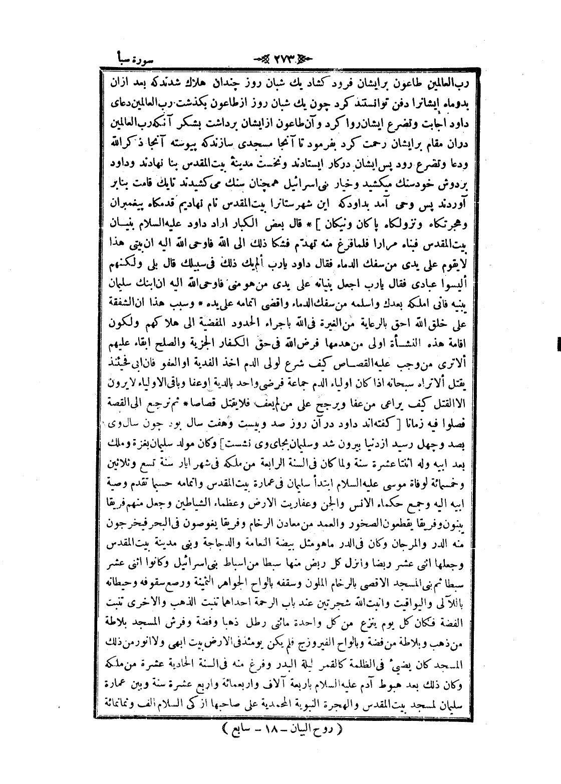 من هو منى فاوحى الله اليه ان ابنك سليمان يبنيه فانى أملكه بعدك وأسلمه من سفك الدماء وأقضي إتمامه على يده وسبب هذا ان الشفقة على خلق الله أحق بالرعاية من الغيرة فى الله بإجراء الحدود المفضية الى هلاكهم ولكون اقامة هذه النشأة اولى من هدمها فرض الله فى حق الكفار الجزية والصلح ابقاء عليهم ألا ترى من وجب عليه القصاص كيف شرع لولى الدم أخذ الفدية او العفو فان ابى فحينئذ يقتل ألا تراه سبحانه إذا كان اولياء الدم جماعة فرضى واحد بالدية او عفا وباقى الأولياء لا يرون الا القتل كيف يراعى من عفا ويرجح على من لم يعف فلا يقتل قصاصا ثم نرجع الى القصة فصلوا فيه زمانا [كفته اند داود در آن روز صد وبيست وهفت سال بود چون سال وى بصد و چهل رسيد از دنيا بيرون شد وسليمان بجاى وى نشست] وكان مولد سليمان بغزة وملك بعد أبيه وله اثنتا عشرة سنة ولما كان فى السنة الرابعة من ملكه فى شهر أيار سنة تسع وثلاثين وخمسمائة لوفاة موسى عليه السلام ابتدأ سليمان فى عمارة بيت المقدس وإتمامه حسبما تقدم وصية أبيه اليه وجمع حكماء الانس والجن وعفاريت الأرض وعظماء الشياطين وجعل منهم فريقا يبنون وفريقا يقطعون الصخور والعمد من معادن الرخام وفريقا يغوصون فى البحر فيخرجون منه الدر والمرجان وكان فى الدر ما هو مثل بيضة النعامة والدجاجة وبنى مدينة بيت المقدس وجعلها اثنى عشر ربضا وانزل كل ربض منها سبطا من أسباط بنى إسرائيل وكانوا اثنى عشر سبطا ثم بنى المسجد الأقصى بالرخام الملون وسقفه بألواح الجواهر الثمينة ورصع سقوفه وحيطانه باللئالئ واليواقيت وأنبت الله شجرتين عند باب الرحمة إحداهما تنبت الذهب والاخرى تنبت الفضة فكان كل يوم ينزع من كل واحدة مائتى رطل ذهبا وفضة وفرش المسجد بلاطة من ذهب وبلاطة من فضة وبألواح الفيروزج فلم يكن يومئذ فى الأرض بيت ابهى ولا أنوار من ذلك المسجد كان يضيىء فى الظلمة كالقمر ليلة البدر وفرغ منه فى السنة الحادية عشرة من ملكه وكان ذلك بعد هبوط آدم عليه السلام باربعة آلاف واربعمائة واربع عشرة سنة وبين عمارة سليمان لمسجد بيت المقدس والهجرة النبوية المحمدية على صاحبها ازكى السلام الف وثمانمائة