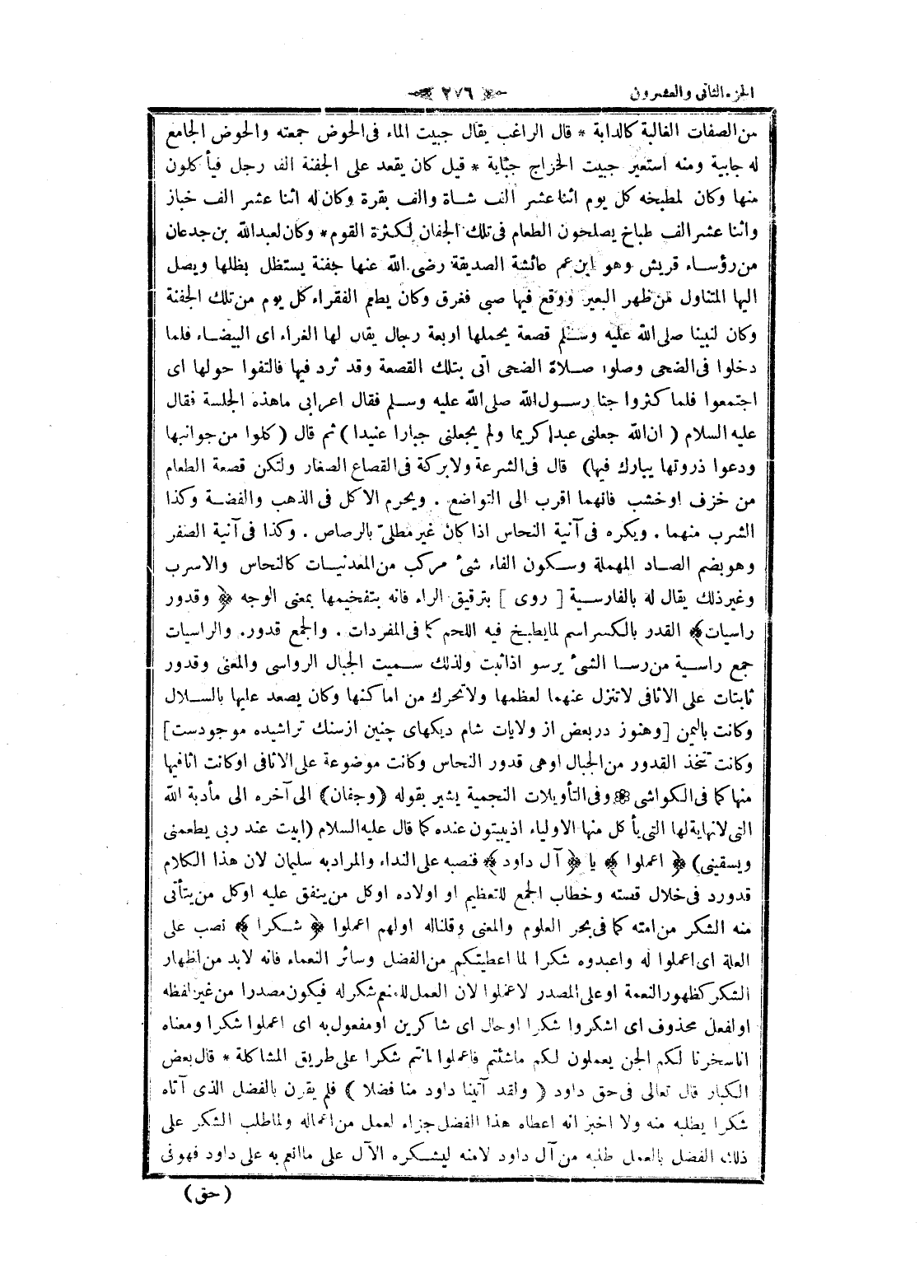 من الصفات الغالبة كالدابة قال الراغب يقال جبيت الماء فى الحوض جمعته والحوض الجامع له جابية ومنه استعير جبيت الخراج جباية قيل كان يقعد على الجفنة الفا رجل فيأكلون منها وكان لمطبخه كل يوم اثنا عشر الف شاة والف بقرة وكان له اثنا عشر الف خباز واثنا عشر الف طباخ يصلحون الطعام فى تلك الجفان لكثرة القوم وكان لعبد الله بن جدعان من رؤساء قريش وهو ابن عم عائشة الصديقة رضى الله عنها جفنة يستظل بظلها ويصل إليها المتناول من ظهر البعير ووقع فيها صبى فغرق وكان يطعم الفقراء كل يوم من تلك الجفنة وكان لنبينا صلى الله عليه وسلم قصعة يحملها اربعة رجال يقال لها الغراء اى البيضاء فلما دخلوا فى الضحى وصلوا صلاة الضحى اتى بتلك القصعة وقد ثرد فيها فالتفوا حولها اى اجتمعوا فلما كثروا جثا رسول الله صلى الله عليه وسلم فقال أعرابي ما هذه الجلسة فقال عليه السلام (ان الله جعلنى عبدا كريما ولم يجعلنى جبارا عنيدا) ثم قال (كلوا من جوانبها ودعوا ذروتها يبارك فيها) قال فى الشرعة ولا بركة فى القصاع الصغار ولتكن قصعة الطعام من خزف او خشب فانهما اقرب الى التواضع. ويحرم الاكل فى الذهب والفضة وكذا الشرب منهما. ويكره فى آنية النحاس إذا كان غير مطلىّ بالرصاص. وكذا فى آنية الصفر وهو بضم الصاد المهملة وسكون الفاء شىء مركب من المعدنيات كالنحاس والأسرب وغير ذلك يقال له بالفارسية [روى] بترقيق الراء فانه بتفخيمها بمعنى الوجه وَقُدُورٍ راسِياتٍ القدر بالكسر اسم لما يطبخ فيه اللحم كما فى المفردات. والجمع قدور. والراسيات جمع راسية من رسا الشيء يرسو إذا ثبت ولذلك سميت الجبال الرواسي والمعنى وقدور ثابتات على الأثافي لا تنزل عنهما لعظمها ولا تحرك من أماكنها وكان يصعد عليها بالسلال وكانت باليمن [وهنوز در بعض از ولايات شام ديكهاى چنين از سنك تراشيده موجودست] وكانت تتخذ القدور من الجبال او هى قدور النحاس وكانت موضوعة على الأثافي او كانت اثافيها منها كما فى الكواشي وفى التأويلات النجمية يشير بقوله (وَجِفانٍ) الى آخره الى مأدبة الله التي لا نهاية لها التي يأكل منها الأولياء إذ يبيتون عنده كما قال عليه السلام (أبيت عند ربى يطعمنى ويسقينى) اعْمَلُوا يا آلَ داوُدَ فنصبه على النداء والمراد به سليمان لان هذا الكلام قد ورد فى خلال قصته وخطاب الجمع للتعظيم او أولاده او كل من ينفق عليه او كل من يتأتى منه الشكر من أمته كما فى بحر العلوم والمعنى وقلنا له او لهم اعملوا شُكْراً نصب على العلة اى اعملوا له واعبدوه شكرا لما أعطيتكم من الفضل وسائر النعماء فانه لا بد من اظهار الشكر كظهور النعمة او على المصدر لا عملوا لان العمل للمنعم شكر له فيكون مصدرا من غير لفظه او لفعل محذوف اى اشكروا شكرا او حال اى شاكرين او مفعول به اى اعملوا شكرا ومعناه انا سخرنا لكم الجن يعملون لكم ما شئتم فاعملوا أنتم شكرا على طريق المشاكلة قال بعض الكبار قال تعالى فى حق داود (وَلَقَدْ آتَيْنا داوُدَ مِنَّا فَضْلًا) فلم يقرن بالفضل الذي آتاه شكرا يطلبه منه ولا اخبر انه أعطاه هذا الفضل جزاء لعمل من اعماله ولما طلب الشكر على ذلك الفضل بالعمل طلبه من آل داود لامنه ليشكره الآل على ما أنعم به على داود فهو فى
