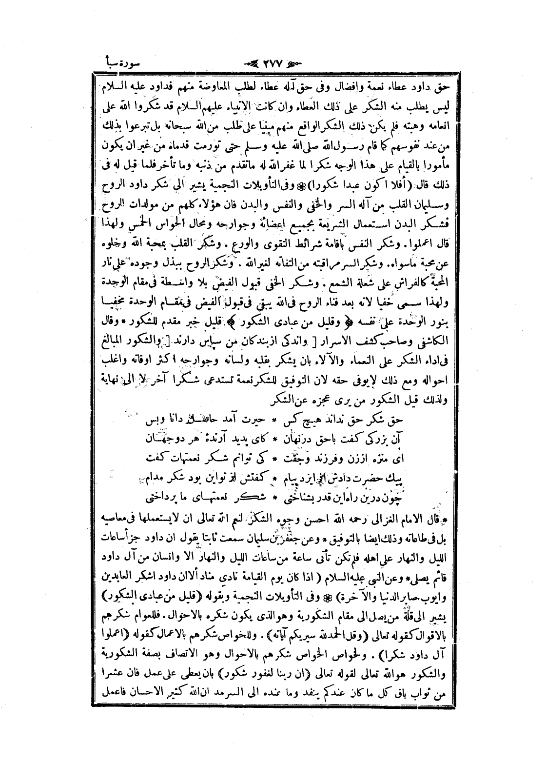 قال الامام الغزالي رحمه الله احسن وجوه الشكر لنعم الله تعالى ان لا يستعملها فى معاصيه بل فى طاعاته وذلك ايضا بالتوفيق وعن جعفر بن سليمان سمعت ثابتا يقول ان داود جزأ ساعات الليل والنهار على اهله فلم تكن تأتى ساعة من ساعات الليل والنهار الا وانسان من آل داود قائم يصلى وعن النبي عليه السلام (إذا كان يوم القيامة نادى مناد ألا ان داود اشكر العابدين وأيوب صابر الدنيا والآخرة) وفى التأويلات النجمية وبقوله (قَلِيلٌ مِنْ عِبادِيَ الشَّكُورُ) يشير الى قلة من يصل الى مقام الشكورية وهو الذي يكون شكره بالأحوال. فللعوام شكرهم بالأقوال كقوله تعالى (وَقُلِ الْحَمْدُ لِلَّهِ سَيُرِيكُمْ آياتِهِ) . وللخواص شكرهم بالأعمال كقوله (اعْمَلُوا آلَ داوُدَ شُكْراً) . ولخواص الخواص شكرهم بالأحوال وهو الاتصاف بصفة الشكورية والشكور هو الله تعالى لقوله تعالى (إِنَّ رَبَّنا لَغَفُورٌ شَكُورٌ) بان يعطى على عمل فان عشرا من ثواب باق كل ما كان عندكم ينفد وما عنده الى السرمد ان الله كثير الإحسان فاعمل