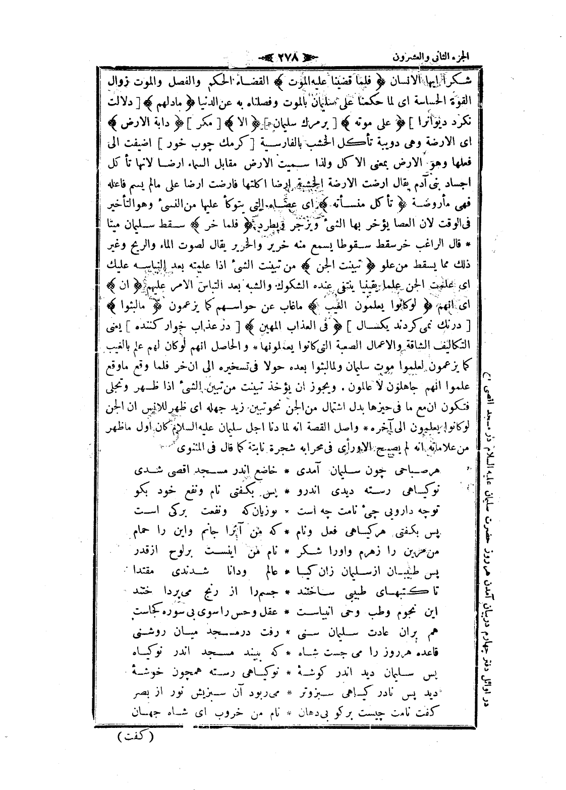 شكرا ايها الإنسان فَلَمَّا قَضَيْنا عَلَيْهِ الْمَوْتَ القضاء الحكم والفصل والموت زوال القوة الحساسة اى لما حكمنا على سليمان بالموت وفصلناه به عن الدنيا ما دَلَّهُمْ [دلالت نكرد ديوانرا] عَلى مَوْتِهِ [بر مرك سليمان] إِلَّا [مكر] دَابَّةُ الْأَرْضِ اى الارضة وهى دويبة تأكل الخشب بالفارسية [كرمك چوب خور] أضيفت الى فعلها وهو الأرض بمعنى الاكل ولذا سميت الأرض مقابل السماء أرضا لانها تأكل أجساد بنى آدم يقال ارضت الارضة الخشبة أرضا اكلتها فارضت أرضا على ما لم يسم فاعله فهى مأروضة تَأْكُلُ مِنْسَأَتَهُ اى عصاه التي يتوكأ عليها من النسيء وهو التأخير فى الوقت لان العصا يؤخر بها الشيء ويزجر ويطرد فَلَمَّا خَرَّ سقط سليمان ميتا قال الراغب خر سقط سقوطا يسمع منه خرير والخرير يقال لصوت الماء والريح وغير ذلك مما يسقط من علو تَبَيَّنَتِ الْجِنُّ من تبينت الشيء إذا علمته بعد النباسه عليك اى علمت الجن علما يقينيا ينتفى عنده الشكوك والشبه بعد التباس الأمر عليهم أَنْ اى انهم لَوْ كانُوا يَعْلَمُونَ الْغَيْبَ ما غاب عن حواسهم كما يزعمون ما لَبِثُوا [درنك نمى كردند يكسال] فِي الْعَذابِ الْمُهِينِ [در عذاب خوار كننده] يعنى التكاليف الشاقة والأعمال الصعبة التي كانوا يعملونها والحاصل انهم لو كان لهم علم بالغيب كما يزعمون لعلموا موت سليمان ولما لبثوا بعده حولا فى تسخيره الى ان خر فلما وقع ما وقع علموا انهم جاهلون لا عالمون. ويجوز ان يؤخذ تبينت من تبين الشيء إذا ظهر وتجلى فتكون ان مع ما فى حيزها بدل اشتمال من الجن نحو تبين زيد جهله اى ظهر للانس ان الجن لو كانوا يعلمون الى آخره واصل القصة انه لما دنا أجل سليمان عليه السلام كان أول ما ظهر من علاماته انه لم يصبح الا ورأى فى محرابه شجرة نابتة كما قال فى المثنوى