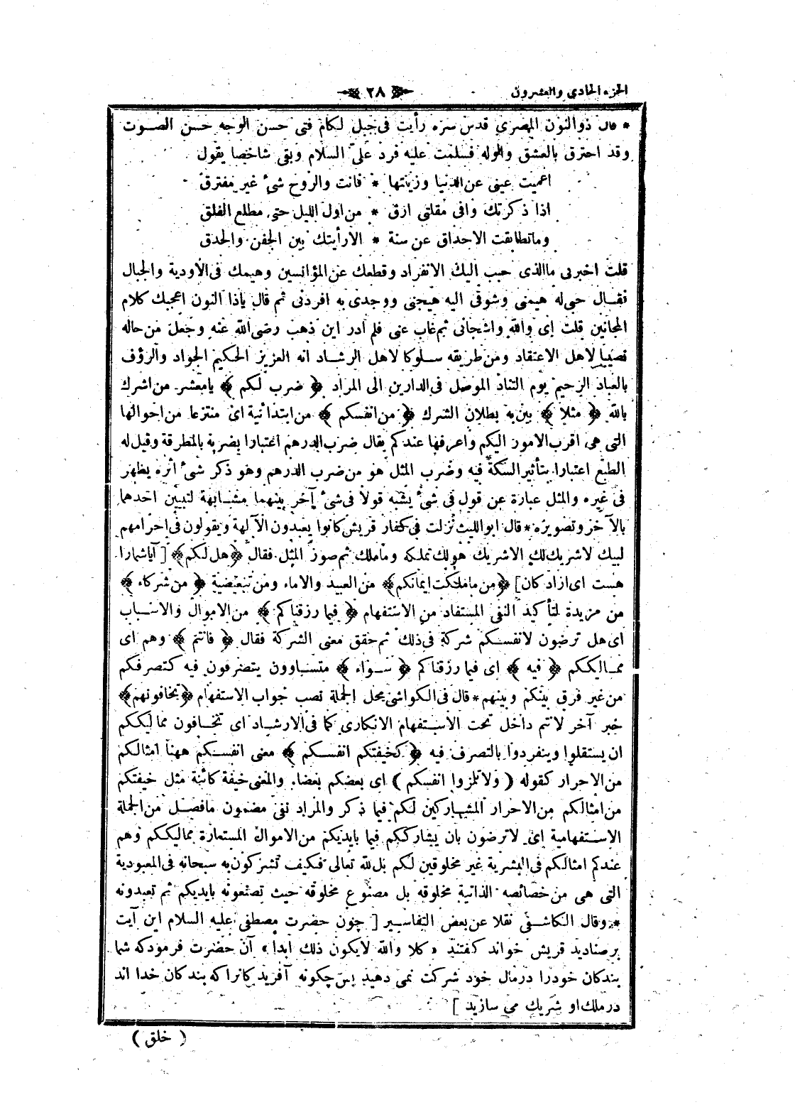 قلت أخبرني ما الذي حبب إليك الانفراد وقطعك عن المؤانسين وهيمك فى الاودية والجبال فقال حبى له هيمنى وشوقى اليه هيجنى ووجدي به افردنى ثم قال يا ذا النون أعجبك كلام المجانين قلت اى والله وأشجاني ثم غاب عنى فلم أدر اين ذهب رضى الله عنه وجعل من حاله نصيبا لاهل الاعتقاد ومن طريقه سلوكا لاهل الرشاد انه العزيز الحكيم الجواد والرؤوف بالعباد الرحيم يوم التناد الموصل فى الدارين الى المراد ضَرَبَ لَكُمْ يا معشر من أشرك بالله مَثَلًا بين به بطلان الشرك مِنْ أَنْفُسِكُمْ من ابتدائية اى منتزعا من أحوالها التي هى اقرب الأمور إليكم واعرفها عندكم يقال ضرب الدرهم اعتبارا بضربه بالمطرقة وقيل له الطبع اعتبارا بتأثير السكة فيه وضرب المثل هو من ضرب الدرهم وهو ذكر شىء اثره يظهر فى غيره والمثل عبارة عن قول فى شىء يشبه قولا فى شىء آخر بينهما مشابهة لتبيين أحدهما بالآخر وتصويره قال ابو الليث نزلت فى كفار قريش كانوا يعبدون الآلهة ويقولون فى إحرامهم لبيك لا شريك لك الا شريك هو لك تملكه وما ملك ثم صور المثل فقال هَلْ لَكُمْ [آيا شما را هست اى آزادگان] مِنْ ما مَلَكَتْ أَيْمانُكُمْ من العبيد والإماء ومن تبعيضية مِنْ شُرَكاءَ من مزيدة لتأكيد النفي المستفاد من الاستفهام فِي ما رَزَقْناكُمْ من الأموال والأسباب اى هل ترضون لانفسكم شركة فى ذلك ثم حقق معنى الشركة فقال فَأَنْتُمْ وهم اى مما ليككم فِيهِ اى فيما رزقناكم سَواءٌ متساوون يتصرفون فيه كتصرفكم من غير فرق بينكم وبينهم قال فى الكواشي محل الجملة نصب جواب الاستفهام تَخافُونَهُمْ خبر آخر لانتم داخل تحت الاستفهام الإنكاري كما فى الإرشاد اى تخافون مماليككم ان يستقلوا وينفردوا بالتصرف فيه كَخِيفَتِكُمْ أَنْفُسَكُمْ معنى أنفسكم هاهنا أمثالكم من الأحرار كقوله (وَلا تَلْمِزُوا أَنْفُسَكُمْ) اى بعضكم بعضا. والمعنى خيفة كائنة مثل خيفتكم من أمثالكم من الأحرار المشاركين لكم فيما ذكر والمراد نفى مضمون ما فصل من الجملة الاستفهامية اى لا ترضون بان يشارككم فيما بايديكم من الأموال المستعارة مماليككم وهم عندكم أمثالكم فى البشرية غير مخلوقين لكم بل لله تعالى فكيف تشركون به سبحانه فى المعبودية التي هى من خصائصه الذاتية مخلوقه بل مصنوع مخلوقه حيث تصنعونه بايديكم ثم تعبدونه وقال الكاشفى نقلا عن بعض التفاسير [چون حضرت مصطفى عليه السلام اين آيت بر صناديد قريش خواند كفتند «كلا والله لا يكون ذلك ابدا» آن حضرت فرمود كه شما بندگان خود را در مال خود شركت نمى دهيد پس چكونه آفريد كانرا كه بندگان خدااند در ملك او شريك مى سازيد]