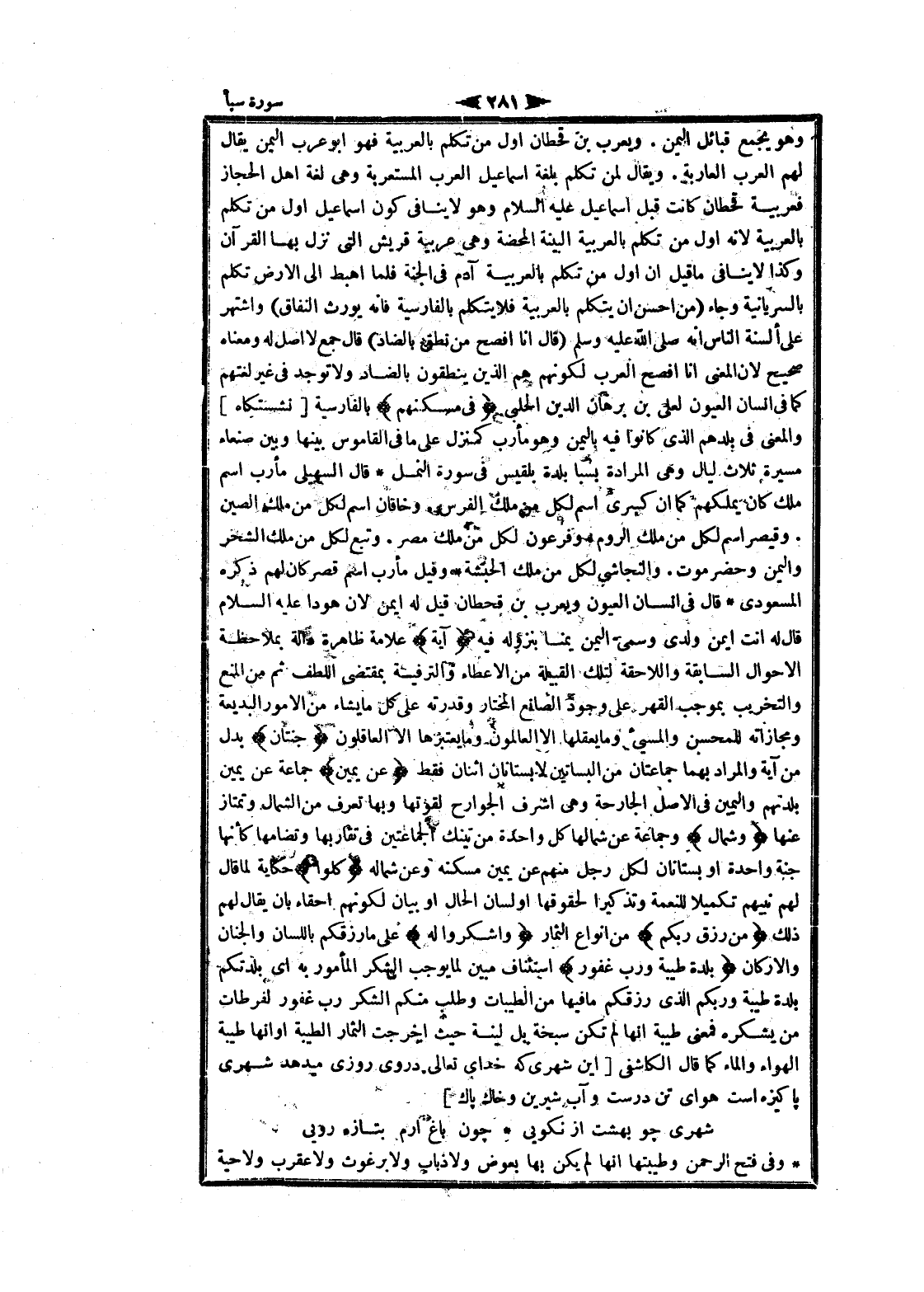 بالضاد ولا توجد فى غير لغتهم كما فى انسان العيون لعلى بن برهان الدين الحلبي فِي مَسْكَنِهِمْ بالفارسية [نشستكاه] والمعنى فى بلدهم الذي كانوا فيه باليمن وهو مأرب كمنزل على ما فى القاموس بينها وبين صنعاء مسيرة ثلاث ليال وهى المرادة بسبا بلدة بلقيس فى سورة النمل قال السهيلي مأرب اسم ملك كان يملكهم كما ان كسرى اسم لكل من ملك الفرس. وخاقان اسم لكل من ملك الصين. وقيصر اسم لكل من ملك الروم. وفرعون لكل من ملك مصر. وتبع لكل من ملك الشحر واليمن وحضر موت. والنجاشي لكل من ملك الحبشة وقيل مأرب اسم قصر كان لهم ذكره المسعودي قال فى انسان العيون ويعرب بن قحطان قيل له ايمن لان هودا عليه السلام قال له أنت ايمن ولدي وسمى اليمن يمنا بنزوله فيه آيَةٌ علامة ظاهرة دالة بملاحظة الأحوال السابقة واللاحقة لتلك القبيلة من الإعطاء والترفية بمقتضى اللطف ثم من المنع والتخريب بموجب القهر على وجود الصانع المختار وقدرته على كل ما يشاء من الأمور البديعة ومجازاته للمحسن والمسيء وما يعقلها الا العالمون وما يعتبرها الا العاقلون جَنَّتانِ بدل من آية والمراد بهما جماعتان من البساتين لا بستانان اثنان فقط عَنْ يَمِينٍ جماعة عن يمين بلدتهم واليمين فى الأصل الجارحة وهى اشرف الجوارح لقوتها وبها تعرف من الشمال وتمتاز عنها وَشِمالٍ وجماعة عن شمالها كل واحدة من تينك الجماعتين فى تقاربها وتضامها كأنها جنة واحدة او بستانان لكل رجل منهم عن يمين مسكنه وعن شماله كُلُوا حكاية لما قال لهم نبيهم تكميلا للنعمة وتذكيرا لحقوقها او لسان الحال او بيان لكونهم أحقاء بان يقال لهم ذلك مِنْ رِزْقِ رَبِّكُمْ من انواع الثمار وَاشْكُرُوا لَهُ على ما رزقكم باللسان والجنان والأركان بَلْدَةٌ طَيِّبَةٌ وَرَبٌّ غَفُورٌ استئناف مبين لما يوجب الشكر المأمور به اى بلدتكم بلدة طيبة وربكم الذي رزقكم ما فيها من الطيبات وطلب منكم الشكر رب غفور لفرطات من يشكره فمعنى طيبة انها لم تكن سبخة بل لينة حيث أخرجت الثمار الطيبة او انها طيبة الهواء والماء كما قال الكاشفى [اين شهرى كه خداى تعالى در وى روزى ميدهد شهرى پاكيزه است هواى تن درست وآب شيرين وخاك پاك]