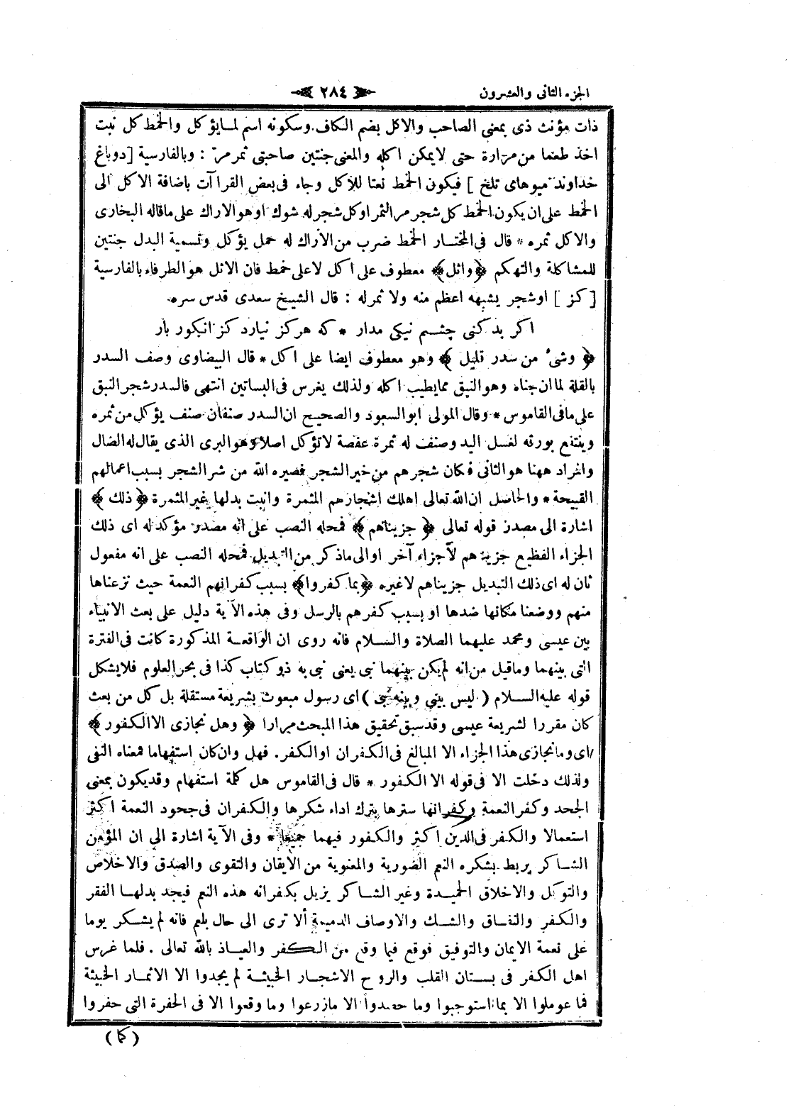 وَشَيْءٍ مِنْ سِدْرٍ قَلِيلٍ وهو معطوف ايضا على أكل قال البيضاوي وصف السدر بالقلة لما ان جناه وهو النبق مما يطيب أكله ولذلك يغرس فى البساتين انتهى فالسدر شجر النبق على ما فى القاموس وقال المولى ابو السعود والصحيح ان السدر صنفان صنف يؤكل من ثمره وينتفع بورقه لغسل اليد وصنف له ثمرة عفصة لا تؤكل أصلا وهو البرى الذي يقال له الضال والمراد هاهنا هو الثاني فكان شجرهم من خير الشجر فصيره الله من شر الشجر بسبب أعمالهم القبيحة والحاصل ان الله تعالى أهلك أشجارهم المثمرة وأنبت بدلها غير المثمرة ذلِكَ اشارة الى مصدر قوله تعالى جَزَيْناهُمْ فمحله النصب على انه مصدر مؤكد له اى ذلك الجزاء الفظيع جزيناهم لاجزاء آخر او الى ما ذكر من التبديل فمحله النصب على انه مفعول ثان له اى ذلك التبديل جزيناهم لا غيره بِما كَفَرُوا بسبب كفرانهم النعمة حيث نزعناها منهم ووضعنا مكانها ضدها او بسبب كفرهم بالرسل وفى هذه الآية دليل على بعث الأنبياء بين عيسى ومحمد عليهما الصلاة والسلام فانه روى ان الواقعة المذكورة كانت فى الفترة التي بينهما وما قيل من انه لم يكن بينهما نبى يعنى نبى به ذو كتاب كذا فى بحر العلوم فلا يشكل قوله عليه السلام (ليس بينى وبينه نبى) اى رسول مبعوث بشريعة مستقلة بل كل من بعث كان مقررا لشريعة عيسى وقد سبق تحقيق هذا المبحث مرارا وَهَلْ نُجازِي إِلَّا الْكَفُورَ اى وما نجازى هذا الجزاء الا المبالغ فى الكفران او الكفر. فهل وان كان استفهاما فمعناه النفي ولذلك دخلت الا فى قوله الا الكفور قال فى القاموس هل كلمة استفهام وقد يكون بمعنى الجحد وكفر النعمة وكفرانها سترها بترك أداء شكرها والكفران فى جحود النعمة اكثر استعمالا والكفر فى الدين اكثر والكفور فيهما جميعا وفى الآية اشارة الى ان المؤمن الشاكر يربط بشكره النعم الصورية والمعنوية من الإيقان والتقوى والصدق والإخلاص والتوكل والأخلاق الحميدة وغير الشاكر يزيل بكفرانه هذه النعم فيجد بدلها الفقر والكفر والنفاق والشك والأوصاف الذميمة ألا ترى الى حال بلعم فانه لم يشكر يوما على نعمة الايمان والتوفيق فوقع فيما وقع من الكفر والعياذ بالله تعالى. فلما غرس اهل الكفر فى بستان القلب والروح الأشجار الخبيثة لم يجدوا الا الأثمار الخبيثة فما عوملوا الا بما استوجبوا وما حصدوا الا ما زرعوا وما وقعوا الا فى الحفرة التي حفروا