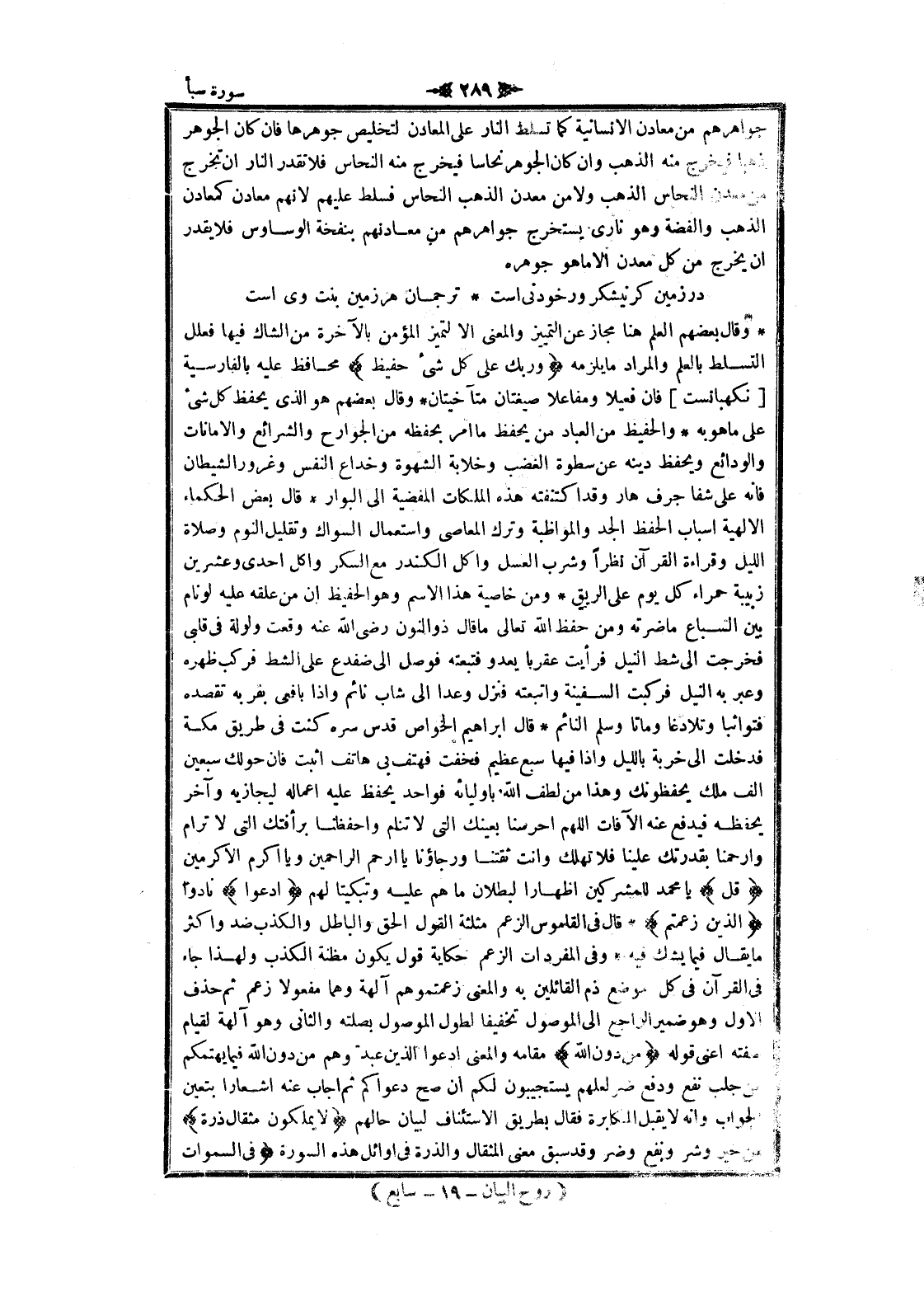 وقال بعضهم العلم هنا مجاز عن التمييز والمعنى الا لتميز المؤمن بالآخرة من الشاك فيها فعلل التسلط بالعلم والمراد ما يلزمه وَرَبُّكَ عَلى كُلِّ شَيْءٍ حَفِيظٌ محافظ عليه بالفارسية [نكهبانست] فان فعيلا ومفاعلا صيغتان متآخيتان وقال بعضهم هو الذي يحفظ كل شىء على ما هو به والحفيظ من العباد من يحفظ ما امر بحفظه من الجوارح والشرائع والأمانات والودائع ويحفظ دينه عن سطوة الغضب وخلابة الشهوة وخداع النفس وغرور الشيطان فانه على شفا جرف هار وقد اكتنفته هذه الملكات المفضية الى البوار قال بعض الحكماء الالهية اسباب الحفظ الجد والمواظبة وترك المعاصي واستعمال السواك وتقليل النوم وصلاة الليل وقراءة القرآن نظرا وشرب العسل وأكل الكندر مع السكر وأكل احدى وعشرين زبيبة حمراء كل يوم على الريق ومن خاصية هذا الاسم وهو الحفيظ ان من علقه عليه لو نام بين السباع ما ضرته ومن حفظ الله تعالى ما قال ذو النون رضى الله عنه وقعت ولولة فى قلبى فخرجت الى شط النيل فرأيت عقربا يعدو فتبعته فوصل الى ضفدع على الشط فركب ظهره وعبر به النيل فركبت السفينة واتبعته فنزل وعدا الى شاب نائم وإذا بأفعى بقربه تقصده فتواثبا وتلادغا وماتا وسلم النائم قال ابراهيم الخواص قدس سره كنت فى طريق مكة فدخلت الى خربة بالليل وإذا فيها سبع عظيم فخفت فهتف بي هاتف اثبت فان حولك سبعين الف ملك يحفظونك وهذا من لطف الله باوليائه فواحد يحفظ عليه اعماله ليجازيه وآخر يحفظه فيدفع عنه الآفات اللهم احرسنا بعينك التي لا تنام واحفظنا برأفتك التي لا ترام وارحمنا بقدرتك علينا فلا تهلك وأنت ثقتنا ورجاؤنا يا ارحم الراحمين ويا أكرم الأكرمين قُلِ يا محمد للمشركين إظهارا لبطلان ما هم عليه وتبكيتا لهم ادْعُوا نادوا الَّذِينَ زَعَمْتُمْ قال فى القاموس الزعم مثلثة القول الحق والباطل والكذب ضد واكثر ما يقال فيما يشك فيه وفى المفردات الزعم حكاية قول يكون مظنة الكذب ولهذا جاء فى القرآن فى كل موضع ذم القائلين به والمعنى زعمتموهم آلهة وهما مفعولا زعم ثم حذف الاول وهو ضمير الراجع الى الموصول تخفيفا لطول الموصول بصلته والثاني وهو آلهة لقيام صفته اعنى قوله مِنْ دُونِ اللَّهِ مقامه والمعنى ادعوا الذين عبدتموهم من دون الله فيما يهتمكم من جلب نفع ودفع ضر لعلهم يستجيبون لكم ان صح دعواكم ثم أجاب عنه اشعارا بتعين الجواب وانه لا يقبل المكابرة فقال بطريق الاستئناف لبيان حالهم لا يَمْلِكُونَ مِثْقالَ ذَرَّةٍ من خير وشر ونفع وضر وقد سبق معنى المثقال والذرة فى أوائل هذه السورة فِي السَّماواتِ وَلا فِي الْأَرْضِ