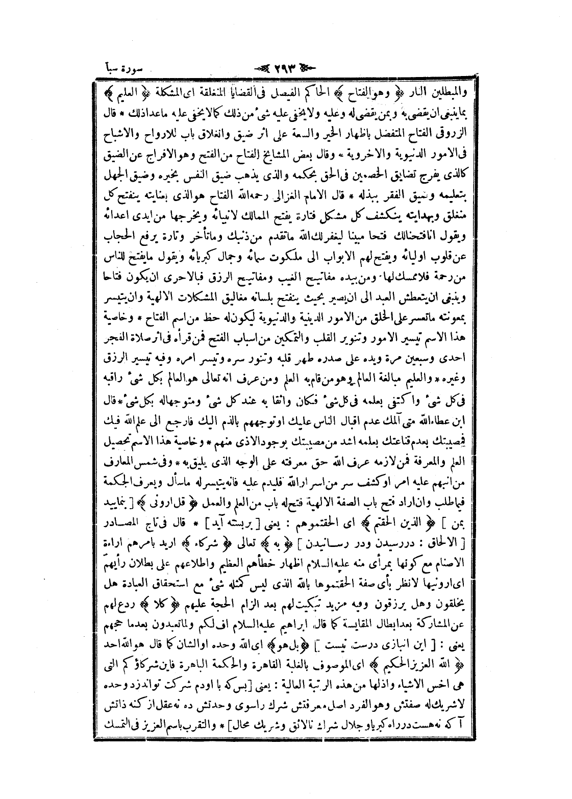 والمبطلين النار وَهُوَ الْفَتَّاحُ الحاكم الفيصل فى القضايا المنغلقة اى المشكلة الْعَلِيمُ بما ينبغى ان يقضى به وبمن يقضى له وعليه ولا يخفى عليه شىء من ذلك كما لا يخفى عليه ما عدا ذلك قال الزروقى الفتاح المتفضل بإظهار الخير والسعة على اثر ضيق وانغلاق باب للارواح والأشباح فى الأمور الدنيوية والاخروية وقال بعض المشايخ الفتاح من الفتح وهو الإفراج عن الضيق كالذى يفرج تضايق الخصمين فى الحق بحكمه والذي يذهب ضيق النفس بخيره وضيق الجهل بتعليمه وضيق الفقر ببذله قال الامام الغزالي رحمه الله الفتاح هو الذي بعنايته ينفتح كل منغلق وبهدايته ينكشف كل مشكل فتارة يفتح الممالك لانبيائه ويخرجها من أيدي أعدائه ويقول انا فتحنا لك فتحا مبينا ليغفر لك الله ما تقدم من ذنبك وما تأخر وتارة يرفع الحجاب عن قلوب أوليائه ويفتح لهم الأبواب الى ملكوت سمائه وجمال كبريائه ويقول ما يفتح للناس من رحمة فلا ممسك لها ومن بيده مفاتيح الغيب ومفاتيح الرزق فبالاحرى ان يكون فتاحا وينبغى ان يتعطش العبد الى ان يصير بحيث ينفتح بلسانه مغاليق المشكلات الالهية وان يتيسر بمعونته ما تعسر على الخلق من الأمور الدينية والدنيوية ليكون له حظ من اسم الفتاح وخاصية هذا الاسم تيسير الأمور وتنوير القلب والتمكين من اسباب الفتح فمن قرأه فى اثر صلاة الفجر احدى وسبعين مرة ويده على صدره طهر قلبه وتنور سره وتيسر امره وفيه تيسير الرزق وغيره والعليم مبالغة العالم وهو من قام به العلم ومن عرف انه تعالى هو العالم بكل شىء راقبه فى كل شىء واكتفى بعلمه فى كل شىء فكان واثقا به عند كل شىء ومتوجها له بكل شىء قال ابن عطاء الله متى آلمك عدم اقبال الناس عليك او توجههم بالذم إليك فارجع الى علم الله فيك فمصيبتك بعدم قناعتك بعلمه أشد من مصيبتك بوجود الأذى منهم وخاصية هذا الاسم تحصيل العلم والمعرفة فمن لازمه عرف الله حق معرفته على الوجه الذي يليق به وفى شمس المعارف من انبهم عليه امر او كشف سر من اسرار الله فليدم عليه فانه يتيسر له ما سأل ويعرف الحكمة فيما طلب وان أراد فتح باب الصفة الالهية فتح له باب من العلم والعمل قُلْ أَرُونِيَ [بنماييد بمن] الَّذِينَ أَلْحَقْتُمْ اى ألحقتموهم: يعنى [بربسته آيد] قال فى تاج المصادر [الإلحاق: در رسيدن ودر رسانيدن] بِهِ تعالى شُرَكاءَ أريد بامرهم اراءة الأصنام مع كونها بمرأى منه عليه السلام اظهار خطأهم العظيم واطلاعهم على بطلان رأيهم اى ارونيها لا نظر بأى صفة الحقتموها بالله الذي ليس كمثله شىء مع استحقاق العبادة هل يخلقون وهل يرزقون وفيه مزيد تبكيت لهم بعد الزام الحجة عليهم كَلَّا ردع لهم عن المشاركة بعد ابطال المقايسة كما قال ابراهيم عليه السلام أف لكم ولما تعبدون بعد ما حجهم يعنى: [اين انبازى درست نيست] بَلْ هُوَ اى الله وحده او الشان كما قال هو الله أحد اللَّهُ الْعَزِيزُ الْحَكِيمُ اى الموصوف بالغلبة القاهرة والحكمة الباهرة فاين شركاؤكم التي هى اخس الأشياء وأذلها من هذه الرتبة العالية: يعنى [بس كه با او دم شركت تواند زد وحده لا شريك له صفتش وهو الفرد اصل معرفتش شرك را سوى وحدتش ده نه عقل از كنه ذاتش آگه نه هست در راه كبريا وجلال شرك نالائق وشريك محال] والتقرب باسم العزيز فى التمسك