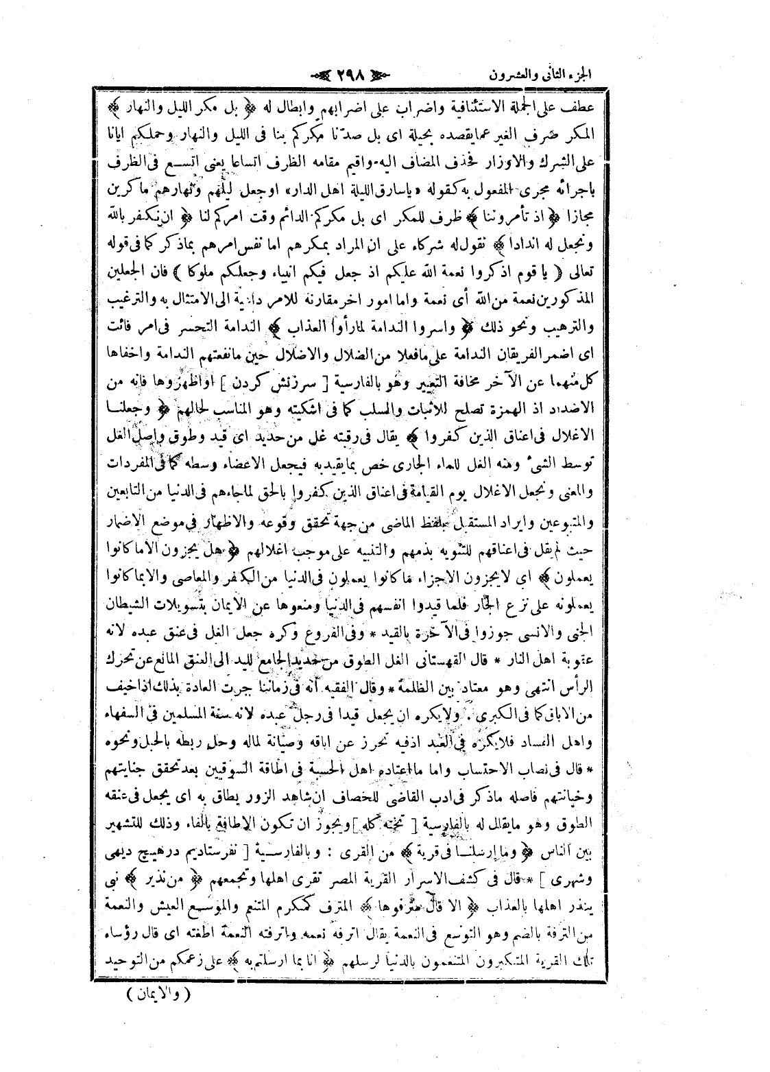 عطف على الجملة الاستئنافية وإضراب على اضرابهم وابطال له بَلْ مَكْرُ اللَّيْلِ وَالنَّهارِ المكر صرف الغير عما يقصده بحيلة اى بل صدّنا مكركم بنا فى الليل والنهار وحملكم إيانا على الشرك والأوزار فحذف المضاف اليه وأقيم مقامه الظرف اتساعا يعنى اتسع فى الظرف باجرائه مجرى المفعول به كقوله «يا سارق الليلة اهل الدار» او جعل ليلهم ونهارهم ما كرين مجازا إِذْ تَأْمُرُونَنا ظرف للمكر اى بل مكركم الدائم وقت أمركم لنا أَنْ نَكْفُرَ بِاللَّهِ وَنَجْعَلَ لَهُ أَنْداداً نقول له شركاء على ان المراد بمكرهم اما نفس أمرهم بما ذكر كما فى قوله تعالى (يا قَوْمِ اذْكُرُوا نِعْمَتَ اللَّهِ عَلَيْكُمْ إِذْ جَعَلَ فِيكُمْ أَنْبِياءَ وَجَعَلَكُمْ مُلُوكاً) فان الجعلين المذكورين نعمة من الله أي نعمة واما امور اخر مقارنه للامر داعية الى الامتثال به والترغيب والترهيب ونحو ذلك وَأَسَرُّوا النَّدامَةَ لَمَّا رَأَوُا الْعَذابَ الندامة التحسر فى امر فائت اى أضمر الفريقان الندامة على ما فعلا من الضلال والإضلال حين ما نفعتهم الندامة وأخفاها كل منهما عن الآخر مخافة التعيير وهو بالفارسية [سرزنش كردن] او أظهروها فانه من الاضداد إذ الهمزة تصلح للاثبات والسلب كما فى أشكيته وهو المناسب لحالهم وَجَعَلْنَا الْأَغْلالَ فِي أَعْناقِ الَّذِينَ كَفَرُوا يقال فى رقبته غل من حديد اى قيد وطوق واصل الغل توسط الشيء ومنه الغل للماء الجاري خص بما يقيد به فيجعل الأعضاء وسطه كما فى المفردات والمعنى ونجعل الاغلال يوم القيامة فى أعناق الذين كفروا بالحق لما جاءهم فى الدنيا من التابعين والمتبوعين وإيراد المستقبل بلفظ الماضي من جهة تحقق وقوعه والإظهار فى موضع الإضمار حيث لم يقل فى أعناقهم للتنويه بذمهم والتنبيه على موجب اغلالهم هَلْ يُجْزَوْنَ إِلَّا ما كانُوا يَعْمَلُونَ اى لا يجزون الاجزاء ما كانوا يعملون فى الدنيا من الكفر والمعاصي والا بما كانوا يعملونه على نزع الجار فلما قيدوا أنفسهم فى الدنيا ومنعوها عن الايمان بتسويلات الشيطان الجنى والانسى جوزوا فى الآخرة بالقيد وفى الفروع وكره جعل الغل فى عنق عبده لانه عقوبة اهل النار قال القهستاني الغل الطوق من حديد الجامع لليد الى العنق المانع عن تحرك الرأس انتهى وهو معتاد بين الظلمة وقال الفقيه انه فى زماننا جرت العادة بذلك إذا خيف من الإباق كما فى الكبرى. ولا يكره ان يجعل قيدا فى رجل عبده لانه سنة المسلمين فى السفهاء واهل الفساد فلا يكره فى العبد إذ فيه تحرز عن إباقه وصيانة لماله وحل ربطه بالحبل ونحوه قال فى نصاب الاحتساب واما ما اعتاده اهل الحسبة فى إطاقة السوقيين بعد تحقق جنايتهم وخيانتهم فاصله ما ذكر فى ادب القاضي للخصاف ان شاهد الزور يطاق به اى يجعل فى عنقه الطوق وهو ما يقال له بالفارسية [تخته كله] ويجوز ان تكون الاطافة بالفاء وذلك للتشهير بين الناس وَما أَرْسَلْنا فِي قَرْيَةٍ من القرى: وبالفارسية [نفرستاديم در هيچ ديهى وشهرى] قال فى كشف الاسرار القرية المصر تقرى أهلها وتجمعهم مِنْ نَذِيرٍ نبى ينذر أهلها بالعذاب إِلَّا قالَ مُتْرَفُوها المترف كمكرم المتنعم والموسع العيش والنعمة من الترفة بالضم وهو التوسع فى النعمة يقال اترفه نعمه وأترفته النعمة أطغته اى قال رؤساء تلك القرية المتكبرون المتنعمون بالدنيا لرسلهم إِنَّا بِما أُرْسِلْتُمْ بِهِ على زعمكم من التوحيد
