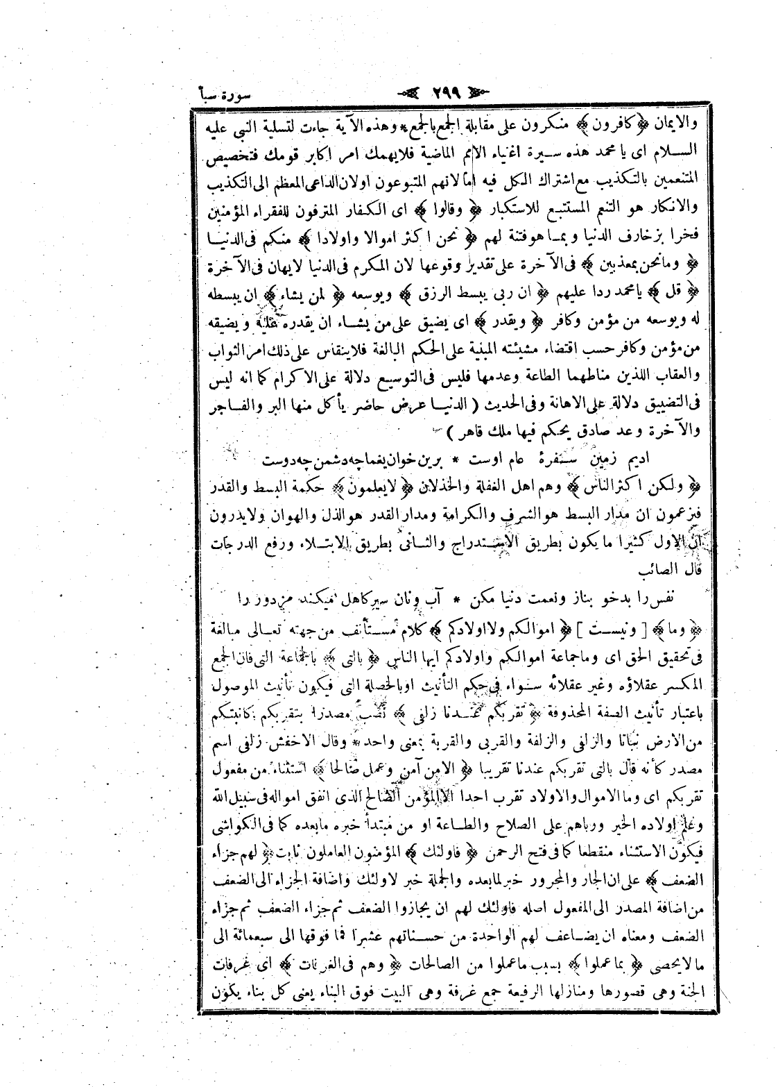 والايمان كافِرُونَ منكرون على مقابلة الجمع بالجمع وهذه الآية جاءت لتسلية النبي عليه السلام اى يا محمد هذه سيرة اغنياء الأمم الماضية فلا يهمك امر أكابر قومك فتخصيص المتنعمين بالتكذيب مع اشتراك الكل فيه اما لانهم المتبوعون او لان الداعي المعظم الى التكذيب والإنكار هو التنعم المستتبع للاستكبار وَقالُوا اى الكفار المترفون للفقراء المؤمنين فخرا بزخارف الدنيا وبما هو فتنة لهم نَحْنُ أَكْثَرُ أَمْوالًا وَأَوْلاداً منكم فى الدنيا وَما نَحْنُ بِمُعَذَّبِينَ فى الآخرة على تقدير وقوعها لان المكرم فى الدنيا لا يهان فى الآخرة قُلْ يا محمد ردا عليهم إِنَّ رَبِّي يَبْسُطُ الرِّزْقَ ويوسعه لِمَنْ يَشاءُ ان يبسطه له ويوسعه من مؤمن وكافر وَيَقْدِرُ اى يضيق على من يشاء ان يقدره عليه ويضيقه من مؤمن وكافر حسب اقتضاء مشيئته المبنية على الحكم البالغة فلا ينقاس على ذلك امر الثواب والعقاب اللذين مناطهما الطاعة وعدمها فليس فى التوسيع دلالة على الإكرام كما انه ليس فى التضييق دلالة على الاهانة وفى الحديث (الدنيا عرض حاضر يأكل منها البر والفاجر والآخرة وعد صادق يحكم فيها ملك قاهر)