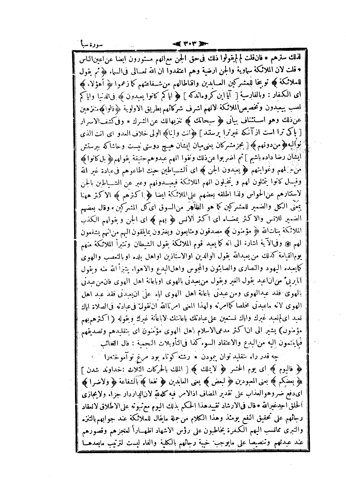 لذلك سترهم فان قلت لم لم يقولوا ذلك فى حق الجن مع انهم مستورون ايضا عن أعين الناس قلت لان الملائكة سماوية والجن ارضية وهم اعتقدوا ان الله تعالى فى السماء ثُمَّ يَقُولُ لِلْمَلائِكَةِ توبيخا للمشركين العابدين وإقناطا لهم من شفاعتهم كما زعموا أَهؤُلاءِ اى الكفار: وبالفارسية [آيا اين كروه اند كه] إِيَّاكُمْ كانُوا يَعْبُدُونَ فى الدنيا وإياكم نصب بيعبدون وتخصيص الملائكة لانهم اشرف شركائهم بطريق الاولوية قالُوا متنزهين عن ذلك وهو استئناف بيانى سُبْحانَكَ تنزيها لك عن الشرك وفى كشف الاسرار [پاكى ترا است از آنكه غير ترا پرستند] أَنْتَ وَلِيُّنا الولي خلاف العدو اى أنت الذي نواليه مِنْ دُونِهِمْ [بجز مشركان يعنى ميان ايشان هيچ دوستى نيست وحاشا كه بپرستش ايشان رضا داده باشيم] ثم اضربوا عن ذلك ونفوا انهم عبدوهم حقيقة بقولهم بَلْ كانُوا من جهلهم وغوايتهم يَعْبُدُونَ الْجِنَّ اى الشياطين حيث أطاعوهم فى عبادة غير الله وقيل كانوا يتمثلون لهم ويتخيلون انهم الملائكة فيعبدونهم وعبر عن الشياطين بالجن لاستتارهم عن الحواس ولذا أطلقه بعضهم على الملائكة ايضا أَكْثَرُهُمْ الأكثر هاهنا بمعنى الكل والضمير للمشركين كما هو الظاهر من السوق اى كل المشركين وقال بعضهم الضمير للانس والأكثر بمعناه اى اكثر الانس بِهِمْ اى الجن وبقولهم الكذب الملائكة بنات الله مُؤْمِنُونَ مصدقون ومتابعون ويغترون بما يلقون إليهم من انهم يشفعون لهم وفى الآية اشارة الى انه كما يعبد قوم الملائكة بقول الشيطان وتتبرأ الملائكة منهم يوم القيامة كذلك من يعبد الله بقول الوالدين او الاستاذين او اهل بلده او بالتعصب والهوى كما يعبده اليهود والنصارى والصابئون والمجوس واهل البدع والأهواء يتبرأ الله منه ويقول انا بريىء من ان اعبد بقول الغير وبقول من يعبدنى بالهوى او باعانة اهل الهوى فان من عبدنى بالهوى فقد عبد الهوى ومن عبدنى باعانة اهل الهوى إياه على ان يعبدنى فقد عبد اهل الهوى لانه ما عبدنى مخلصا كما أمرته ولهذا المعنى أمرنا الله ان نقول فى عبادته فى الصلاة إياك نعبد اى لم نعبد غيرك وإياك نستعين على عبادتك باعانتك لا باعانة غيرك وبقوله (أَكْثَرُهُمْ بِهِمْ مُؤْمِنُونَ) يشير الى ان اكثر مدعى الإسلام باهل الهوى مؤمنون اى بتقليدهم وتصديقهم فيما ينتمون اليه من البدع والاعتقاد السوء كذا فى التأويلات النجمية: قال الصائب