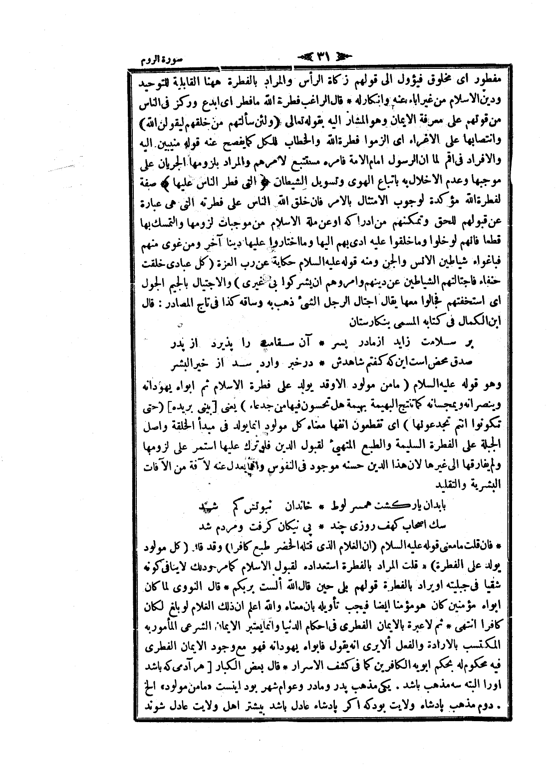 فان قلت ما معنى قوله عليه السلام (ان الغلام الذي قتله الخضر طبع كافرا) وقد قال (كل مولود يولد على الفطرة) قلت المراد بالفطرة استعداده لقبول الإسلام كما مر وذلك لا ينافى كونه شقيا فى جبليته او يراد بالفطرة قولهم بلى حين قال الله ألست بربكم قال النووي لما كان أبواه مؤمنين كان هو مؤمنا ايضا فيجب تأويله بان معناه والله اعلم ان ذلك الغلام لو بلغ لكان كافرا انتهى ثم لا عبرة بالايمان الفطري فى احكام الدنيا وانما يعتبر الايمان الشرعي المأمور به المكتسب بالارادة والفعل ألا يرى انه يقول فابواه يهودانه فهو مع وجود الايمان الفطري فيه محكوم له بحكم أبويه الكافرين كما فى كشف الاسرار قال بعض الكبار [هر آدمي كه باشد او را البته سه مذهب باشد. يكى مذهب پدر ومادر وعوام شهر بود اينست «ما من مولود» إلخ. دوم مذهب پادشاه ولايت بود كه اگر پادشاه عادل باشد بيشتر اهل ولايت عادل شوند