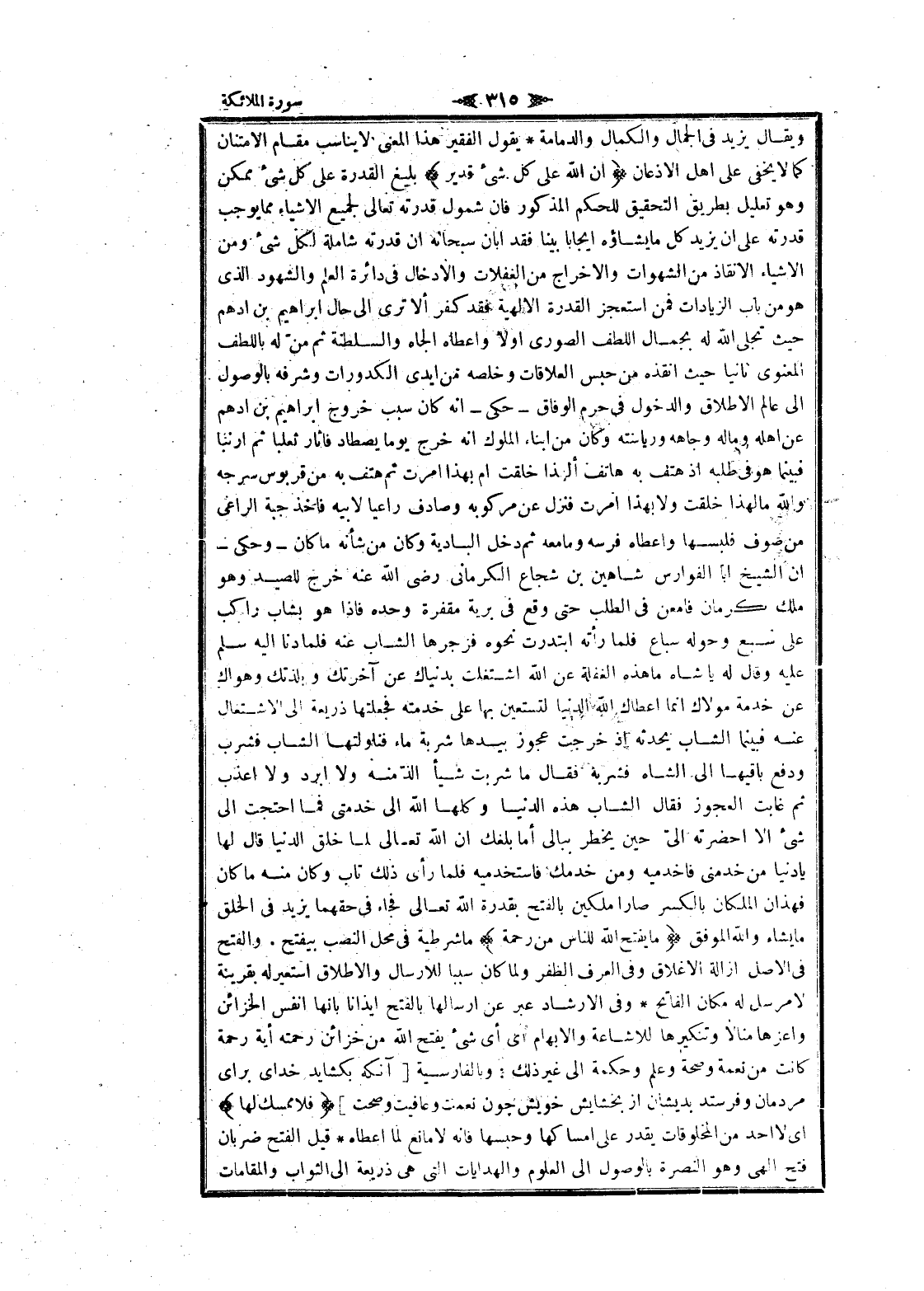 ويقال يزيد فى الجمال والكمال والدمامة يقول الفقير هذا المعنى لا يناسب مقام الامتنان كما لا يخفى على اهل الإذعان إِنَّ اللَّهَ عَلى كُلِّ شَيْءٍ قَدِيرٌ بليغ القدرة على كل شىء ممكن وهو تعليل بطريق التحقيق للحكم المذكور فان شمول قدرته تعالى لجميع الأشياء مما يوجب قدرته على ان يزيد كل ما يشاؤه إيجابا بينا فقد ابان سبحانه ان قدرته شاملة لكل شىء ومن الأشياء الانقاذ من الشهوات والإخراج من الغفلات والإدخال فى دائرة العلم والشهود الذي هو من باب الزيادات فمن استعجز القدرة الالهية فقد كفر ألا ترى الى حال ابراهيم بن أدهم حيث تجلى الله له بجمال اللطف الصوري اولا وأعطاه الجاه والسلطنة ثم منّ له باللطف المعنوي ثانيا حيث أنقذه من حبس العلاقات وخلصه من أيدي الكدورات وشرفه بالوصول الى عالم الإطلاق والدخول فى حرم الوفاق- حكى- انه كان سبب خروج ابراهيم بن أدهم عن اهله وماله وجاهه ورياسته وكان من أبناء الملوك انه خرج يوما يصطاد فاثار ثعلبا ثم أرنبا فبينما هو فى طلبه إذ هتف به هاتف ألهذا خلقت أم بهذا أمرت ثم هتف به من قربوس سرجه والله ما لهذا خلقت ولا بهذا أمرت فنزل عن مركوبه وصادف راعيا لابيه فاخذ جبة الراعي من صوف فلبسها وأعطاه فرسه وما معه ثم دخل البادية وكان من شأنه ما كان- وحكى- ان الشيخ أبا الفوارس شاهين بن شجاع الكرماني رضى الله عنه خرج للصيد وهو ملك كرمان فامعن فى الطلب حتى وقع فى برية مقفرة وحده فاذا هو بشاب راكب على سبع وحوله سباع فلما رأته ابتدرت نحوه فزجرها الشاب عنه فلما دنا اليه سلم عليه وقال له يا شاه ما هذه الغفلة عن الله اشتغلت بدنياك عن آخرتك وبلذتك وهواك عن خدمة مولاك انما اعطاك الله الدنيا لتستعين بها على خدمته فجعلتها ذريعة الى الاشتغال عنه فبينما الشاب يحدثه إذ خرجت عجوز بيدها شربة ماء فناولتها الشاب فشرب ودفع باقيها الى الشاه فشربه فقال ما شربت شيأ الذّمنه ولا أبرد ولا أعذب ثم غابت العجوز فقال الشاب هذه الدنيا وكلها الله الى خدمتى فما احتجت الى شىء الا أحضرته الىّ حين يخطر ببالي أما بلغك ان الله تعالى لما خلق الدنيا قال لها يا دنيا من خدمنى فاخدميه ومن خدمك فاستخدميه فلما رأى ذلك تاب وكان منه ما كان فهذان الملكان بالكسر صارا ملكين بالفتح بقدرة الله تعالى فجاء فى حقهما يزيد فى الخلق ما يشاء والله الموفق ما يَفْتَحِ اللَّهُ لِلنَّاسِ مِنْ رَحْمَةٍ ما شرطية فى محل النصب بيفتح. والفتح فى الأصل ازالة الاغلاق وفى العرف الظفر ولما كان سببا للارسال والإطلاق استعير له بقرينة لا مرسل له مكان الفاتح وفى الإرشاد عبر عن إرسالها بالفتح إيذانا بانها انفس الخزائن وأعزها منالا وتنكيرها للاشاعة والإبهام اى أي شىء يفتح الله من خزائن رحمته أية رحمة كانت من نعمة وصحة وعلم وحكمة الى غير ذلك: وبالفارسية [آنكه بگشايد خداى براى مردمان وفرستد بديشان از بخشايش خويش چون نعمت وعافيت وصحت] فَلا مُمْسِكَ لَها اى لا أحد من المخلوقات يقدر على إمساكها وحبسها فانه لا مانع لما أعطاه قيل الفتح ضربان فتح الهى وهو النصرة بالوصول الى العلوم والهدايات التي هى ذريعة الى الثواب والمقامات