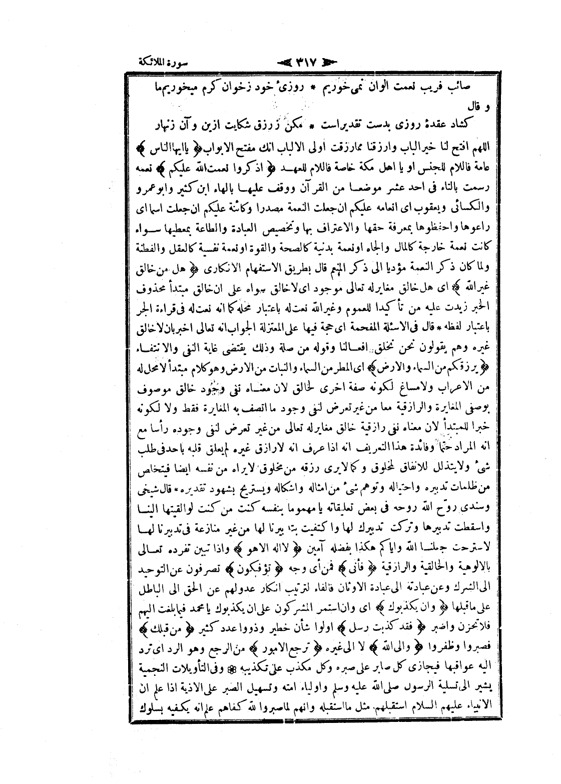 اللهم افتح لنا خير الباب وارزقنا مما رزقت اولى الألباب انك مفتح الأبواب يا أَيُّهَا النَّاسُ عامة فاللام للجنس او يا اهل مكة خاصة فاللام للعهد اذْكُرُوا نِعْمَتَ اللَّهِ عَلَيْكُمْ نعمة رسمت بالتاء فى أحد عشر موضعا من القرآن ووقف عليها بالهاء ابن كثير وابو عمرو والكسائي ويعقوب اى انعامه عليكم ان جعلت النعمة مصدرا وكائنة عليكم ان جعلت اسما اى راعوها واحفظوها بمعرفة حقها والاعتراف بها وتخصيص العبادة والطاعة بمعطيها سواء كانت نعمة خارجة كالمال والجاه او نعمة بدنية كالصحة والقوة او نعمة نفسية كالعقل والفطنة ولما كان ذكر النعمة مؤديا الى ذكر المنعم قال بطريق الاستفهام الإنكاري هَلْ مِنْ خالِقٍ غَيْرُ اللَّهِ اى هل خالق مغاير له تعالى موجود اى لا خالق سواه على ان خالق مبتدأ محذوف الخبر زيدت عليه من تأكيدا للعموم وغير الله نعت له باعتبار محله كما انه نعت له فى قراءة الجر باعتبار لفظه قال فى الاسئلة المفحمة اى حجة فيها على المعتزلة الجواب انه تعالى اخبر بان لا خالق غيره وهم يقولون نحن نخلق أفعالنا وقوله من صلة وذلك يقتضى غاية النفي والانتفاء يَرْزُقُكُمْ مِنَ السَّماءِ وَالْأَرْضِ اى المطر من السماء والنبات من الأرض وهو كلام مبتدأ لا محل له من الاعراب ولا مساغ لكونه صفة اخرى لخالق لان معناه نفى وجود خالق موصوف بوصفى المغايرة والرازقية معا من غير تعرض لنفى وجود ما اتصف به المغايرة فقط ولا لكونه خبرا للمبتدأ لان معناه نفى رازقية خالق مغاير له تعالى من غير تعرض لنفى وجوده رأسا مع انه المراد حتما وفائدة هذا التعريف انه إذا عرف انه لا رازق غيره لم يعلق قلبه بأحد فى طلب شىء ولا يتذلل للانفاق لمخلوق وكما لا يرى رزقه من مخلوق لا يراه من نفسه ايضا فيتخلص من ظلمات تدبيره واحتياله وتوهم شىء من أمثاله واشكاله ويستريح بشهود تقديره قال شيخى وسندى روّح الله روحه فى بعض تعليقاته يا مهموما بنفسه كنت من كنت لو ألقيتها إلينا وأسقطت تدبيرها وتركت تدبيرك لها واكتفيت بتدبيرنا لها من غير منازعة فى تدبيرنا لها لاسترحت جعلنا الله وإياكم هكذا بفضله آمين لا إِلهَ إِلَّا هُوَ وإذا تبين تفرده تعالى بالالوهية والخالقية والرازقية فَأَنَّى فمن أي وجه تُؤْفَكُونَ تصرفون عن التوحيد الى الشرك وعن عبادته الى عبادة الأوثان فالفاء لترتيب انكار عدولهم عن الحق الى الباطل على ما قبلها وَإِنْ يُكَذِّبُوكَ اى وان استمر المشركون على ان يكذبوك يا محمد فيما بلغت إليهم فلا تحزن واصبر فَقَدْ كُذِّبَتْ رُسُلٌ أولوا شأن خطير وذووا عدد كثير مِنْ قَبْلِكَ فصبروا وظفروا وَإِلَى اللَّهِ لا الى غيره تُرْجَعُ الْأُمُورُ من الرجع وهو الرد اى ترد اليه عواقبها فيجازى كل صابر على صبره وكل مكذب على تكذيبه وفى التأويلات النجمية يشير الى تسلية الرسول صلى الله عليه وسلم واولياء أمته وتسهيل الصبر على الاذية إذا علم ان الأنبياء عليهم السلام استقبلهم مثل ما استقبله وانهم لما صبروا لله كفاهم علم انه يكفيه بسلوك