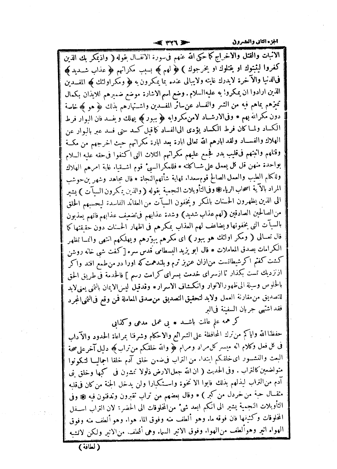 الإثبات والقتل والإخراج كما حكى الله عنهم فى سورة الأنفال بقوله (وَإِذْ يَمْكُرُ بِكَ الَّذِينَ كَفَرُوا لِيُثْبِتُوكَ أَوْ يَقْتُلُوكَ أَوْ يُخْرِجُوكَ) لَهُمْ بسبب مكراتهم عَذابٌ شَدِيدٌ فى الدنيا والآخرة لا يدرك غايته ولا يبالى عنده بما يمكرون به وَمَكْرُ أُولئِكَ المفسدين الذين أرادوا ان يمكروا به عليه السلام. وضع اسم الاشارة موضع ضميرهم للايذان بكمال تميزهم بما هم فيه من الشر والفساد عن سائر المفسدين واشتهارهم بذلك هُوَ خاصة دون مكر الله بهم وفى الإرشاد لا من مكروا به يَبُورُ يهلك ويفسد فان البوار فرط الكساد ولما كان فرط الكساد يؤدى الى الفساد كما قيل كسد حتى فسد عبر بالبوار عن الهلاك والفساد ولقد ابارهم الله تعالى ابارة بعد ابارة مكراتهم حيث أخرجهم من مكة وقتلهم واثبتهم فى قليب بدر فجمع عليهم مكراتهم الثلاث التي اكتفوا فى حقه عليه السلام بواحدة منهن قل كل يعمل على شاكلته فللمكر السيّء قوم أشقياء غاية أمرهم الهلاك وللكلم الطيب والعمل الصالح قوم سعداء نهاية شأنهم النجاة قال مجاهد وشهر بن حوشب المراد بالآية اصحاب الرياء وفى التأويلات النجمية بقوله (وَالَّذِينَ يَمْكُرُونَ السَّيِّئاتِ) يشير الى الذين يظهرون الحسنات بالمكر ويخفون السيئات من العقائد الفاسدة ليحسبهم الخلق من الصالحين الصادقين (لَهُمْ عَذابٌ شَدِيدٌ) وشدة عذابهم فى تضعيف عذابهم فانهم يعذبون بالسيئات التي يخفونها ويضاعف لهم العذاب بمكرهم فى اظهار الحسنات دون حقيقتها كما قال تعالى (وَمَكْرُ أُولئِكَ هُوَ يَبُورُ) اى مكرهم يبوّرهم ويهلكهم انتهى وانما تظهر الكرامات بصدق المعاملات قال ابو يزيد البسطامي قدس سره [كفت شبى خانه روشن كشت كفتم اگر شيطانست من از ان عزيزترم وبلند همت كه او را در من طمع افتد واگر از نزديك تست بگذار تا از سراى خدمت بسراى كرامت رسم] فالخدمة فى طريق الحق بالخلوص وسيلة الى ظهور الأنوار وانكشاف الاسرار وقد قيل ليس الايمان بالتمني يعنى لا بد للتصديق من مقارنة العمل ولا بد لتحقيق التصديق من صدق المعاملة فمن وقع فى التمني المجرد فقد اشتهى جريان السفينة فى البر