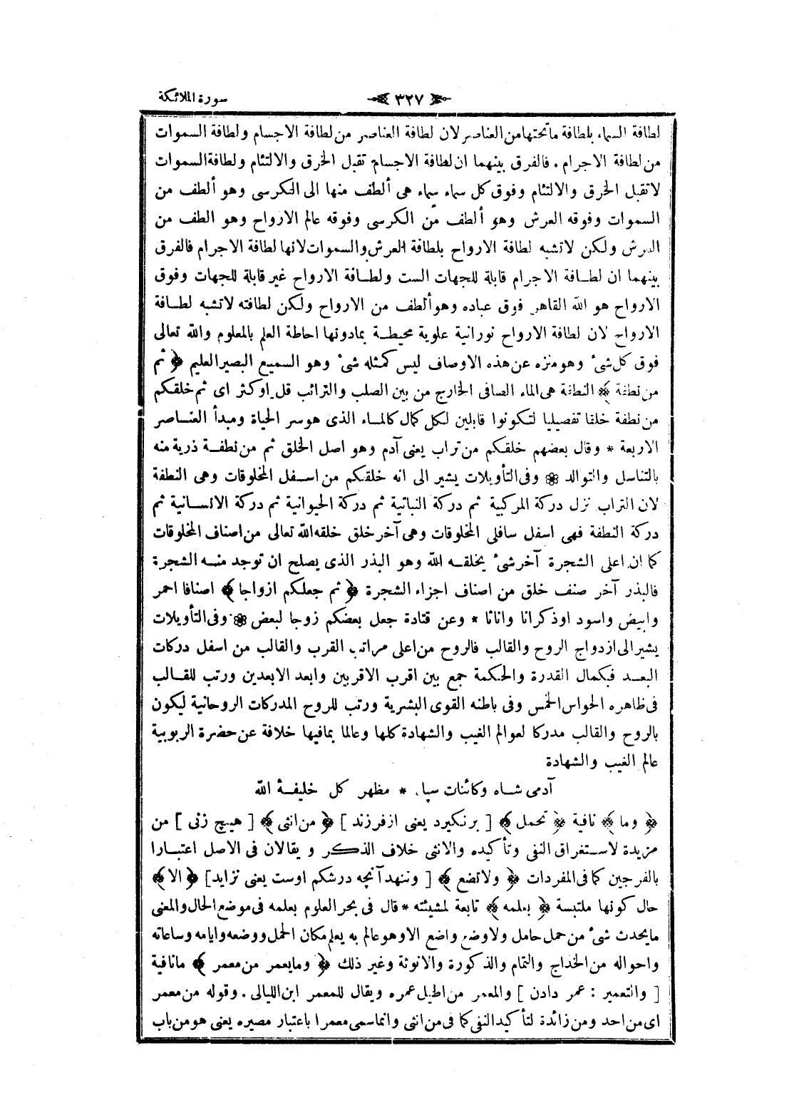 لطافة السماء بلطافة ما تحتها من العناصر لان لطافة العناصر من لطافة الأجسام ولطافة السموات من لطافة الاجرام. فالفرق بينهما ان لطافة الأجسام تقبل الخرق والالتئام ولطافة السموات لا تقبل الخرق والالتئام وفوق كل سماء سماء هى ألطف منها الى الكرسي وهو ألطف من السموات وفوقه العرش وهو ألطف من الكرسي وفوقه عالم الأرواح وهو الطف من العرش ولكن لا تشبه لطافة الأرواح بلطافة العرش والسموات لانها لطافة الاجرام فالفرق بينهما ان لطافة الاجرام قابلة للجهات الست ولطافة الأرواح غير قابلة للجهات وفوق الأرواح هو الله القاهر فوق عباده وهو ألطف من الأرواح ولكن لطافته لا تشبه لطافة الأرواح لان لطافة الأرواح نورانية علوية محيطة بما دونها احاطة العلم بالمعلوم والله تعالى فوق كل شىء وهو منزه عن هذه الأوصاف ليس كمثله شىء وهو السميع البصير العليم ثُمَّ مِنْ نُطْفَةٍ النطفة هى الماء الصافي الخارج من بين الصلب والترائب قل او كثر اى ثم خلقكم من نطفة خلقا تفصيليا لتكونوا قابلين لكل كمال كالماء الذي هو سر الحياة ومبدأ العناصر الاربعة وقال بعضهم خلقكم من تراب يعنى آدم وهو اصل الخلق ثم من نطفة ذرية منه
