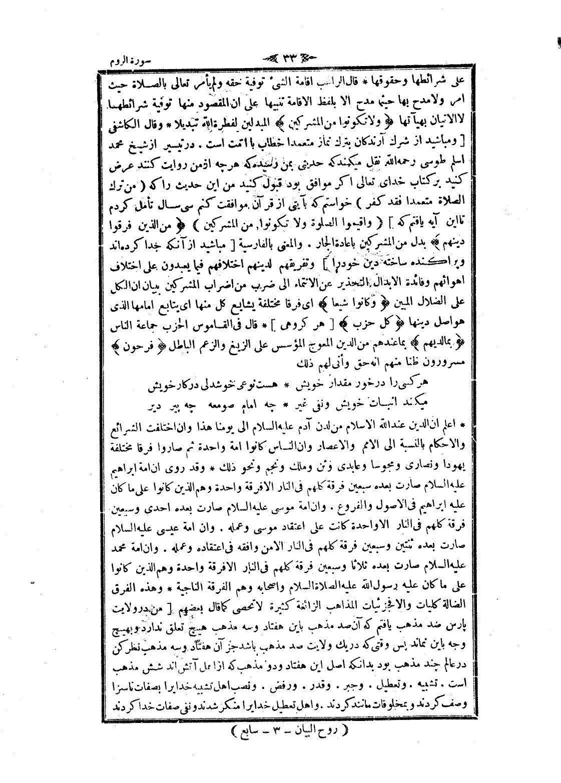 على شرائطها وحقوقها قال الراغب اقامة الشيء توفية حقه ولم يأمر تعالى بالصلاة حيث امر ولا مدح بها حيثما مدح الا بلفظ الاقامة تنبيها على ان المقصود منها توفية شرائطها لا الإتيان بهيآتها وَلا تَكُونُوا مِنَ الْمُشْرِكِينَ المبدلين لفطرة الله تبديلا وقال الكاشفى [ومباشيد از شرك آرندگان بترك نماز متعمدا خطاب با امّت است. در تيسير از شيخ محمد اسلم طوسى رحمه الله نقل ميكند كه حديثى بمن رسيده كه هر چهـ از من روايت كنند عرض كنيد بر كتاب خداى تعالى اگر موافق بود قبول كنيد من اين حديث را كه (من ترك الصلاة متعمدا فقد كفر) خواستم كه بآيتى از قرآن موافقت كنم سى سال تأمل كردم تا اين آيه يافتم كه] (وَأَقِيمُوا الصَّلاةَ وَلا تَكُونُوا مِنَ الْمُشْرِكِينَ) مِنَ الَّذِينَ فَرَّقُوا دِينَهُمْ بدل من المشركين باعادة الجار. والمعنى بالفارسية [مباشيد از آنكه جدا كرده اند و پراكنده ساخته دين خود را] وتفريقهم لدينهم اختلافهم فيما يعبدون على اختلاف اهوائهم وفائدة الابدال التحذير عن الانتماء الى ضرب من إضراب المشركين ببيان ان الكل على الضلال المبين وَكانُوا شِيَعاً اى فرقا مختلفة يشايع كل منها اى يتابع امامها الذي هو اصل دينها كُلُّ حِزْبٍ [هر كروهى] قال فى القاموس الحزب جماعة الناس بِما لَدَيْهِمْ بما عندهم من الدين المعوج المؤسس على الزيغ والزعم الباطل فَرِحُونَ مسرورون ظنا منهم انه حق وأنى لهم ذلك