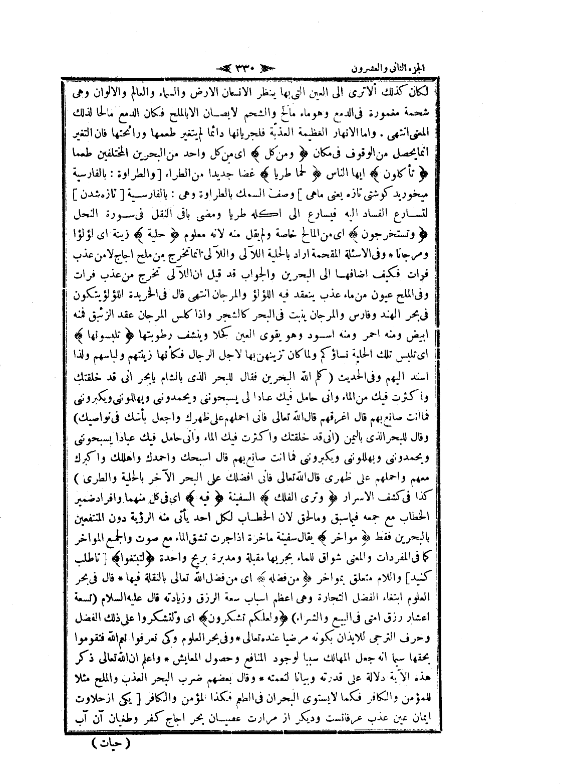 لكان كذلك ألا ترى الى العين التي بها ينظر الإنسان الأرض والسماء والعالم والألوان وهى شحمة مغمورة فى الدمع وهو ماء مالح والشحم لايصان الا بالملح فكان الدمع مالحا لذلك المعنى انتهى. واما الأنهار العظيمة العذبة فلجريانها دائما لم يتغير طعمها ورائحتها فان التغير انما يحصل من الوقوف فى مكان وَمِنْ كُلٍّ اى من كل واحد من البحرين المختلفين طعما تَأْكُلُونَ ايها الناس لَحْماً طَرِيًّا غضا جديدا من الطراء [والطراوة: بالفارسية ميخوريد كوشتى تازه يعنى ماهى] وصف السمك بالطراوة وهى: بالفارسية [تازه شدن] لتسارع الفساد اليه فيسارع الى أكله طريا ومضى باقى النقل فى سورة النحل وَتَسْتَخْرِجُونَ اى من المالح خاصة ولم يقل منه لانه معلوم حِلْيَةً زينة اى لؤلؤا ومرجانا وفى الاسئلة المقحمة أراد بالحلية اللآلى واللآلى انما تخرج من ملح أجاج لا من عذب فرات فكيف أضافها الى البحرين والجواب قد قيل ان اللآلى تخرج من عذب فرات وفى الملح عيون من ماء عذب ينعقد فيه اللؤلؤ والمرجان انتهى قال فى الخريدة اللؤلؤ يتكون فى بحر الهند وفارس والمرجان ينبت فى البحر كالشجر وإذا كلس المرجان عقد الزئبق فمنه ابيض ومنه احمر ومنه اسود وهو يقوى العين كحلا وينشف رطوبتها تَلْبَسُونَها اى تلبس تلك الحلية نساؤكم ولما كان تزينهن بها لاجل الرجال فكأنها زينتهم ولباسهم ولذا أسند إليهم وفى الحديث (كلم الله البحرين فقال للبحر الذي بالشام يا بحر انى قد خلقتك وأكثرت فيك من الماء وانى حامل فيك عبادا لى يسبحوننى ويحمدوننى ويهللوننى ويكبروننى فما أنت صانع بهم قال أغرقهم قال الله تعالى فانى احملهم على ظهرك واجعل بأسك فى نواصيك) وقال للبحر الذي باليمن (انى قد خلقتك وأكثرت فيك الماء وانى حامل فيك عبادا يسبحوننى ويحمدوننى ويهللوننى ويكبروننى فما أنت صانع بهم قال أسبحك وأحمدك واهللك وأكبرك معهم واحملهم على ظهرى قال الله تعالى فانى أفضلك على البحر الآخر بالحلية والطري) كذا فى كشف الاسرار وَتَرَى الْفُلْكَ السفينة فِيهِ اى فى كل منهما وافراد ضمير الخطاب مع جمعه فيما سبق وما لحق لان الخطاب لكل أحد يأتى منه الرؤية دون المنتفعين بالبحرين فقط مَواخِرَ يقال سفينة ماخرة إذا جرت تشق الماء مع صوت والجمع المواخر كما فى المفردات والمعنى شواق للماء بجريها مقبلة ومدبرة بريح واحدة لِتَبْتَغُوا [تا طلب كنيد] واللام متعلق بمواخر مِنْ فَضْلِهِ اى من فضل الله تعالى بالنقلة فيها قال فى بحر العلوم ابتغاء الفضل التجارة وهى أعظم اسباب سعة الرزق وزيادته قال عليه السلام (تسعة أعشار رزق أمتي فى البيع والشراء) وَلَعَلَّكُمْ تَشْكُرُونَ اى ولتشكروا على ذلك الفضل وحرف الترجي للايذان بكونه مرضيا عنده تعالى