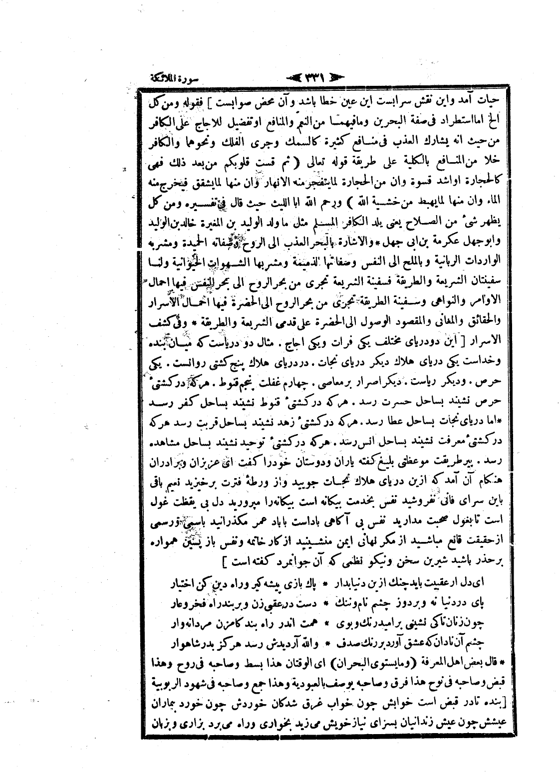 حيات آمد واين نقش سرابست اين عين خطا باشد وآن محض صوابست] فقوله ومن كل إلخ اما استطراد فى صفة البحرين وما فيهما من النعم والمنافع او تفضيل للاجاج على الكافر من حيث انه يشارك العذب فى منافع كثيرة كالسمك وجرى الفلك ونحوهما والكافر خلا من المنافع بالكلية على طريقة قوله تعالى (ثُمَّ قَسَتْ قُلُوبُكُمْ مِنْ بَعْدِ ذلِكَ فَهِيَ كَالْحِجارَةِ أَوْ أَشَدُّ قَسْوَةً وَإِنَّ مِنَ الْحِجارَةِ لَما يَتَفَجَّرُ مِنْهُ الْأَنْهارُ وَإِنَّ مِنْها لَما يَشَّقَّقُ فَيَخْرُجُ مِنْهُ الْماءُ وَإِنَّ مِنْها لَما يَهْبِطُ مِنْ خَشْيَةِ اللَّهِ) ورحم الله أبا الليث حيث قال فى تفسيره ومن كل يظهر شىء من الصلاح يعنى يلد الكافر المسلم مثل ما ولد الوليد بن المغيرة خالد بن الوليد وابو جهل عكرمة بن ابى جهل والاشارة بالبحر العذب الى الروح وصفاته الحميدة ومشربه الواردات الربانية وبالملح الى النفس وصفاتها الذميمة ومشربها الشهوات الحيوانية ولنا سفينتان الشريعة والطريقة فسفينة الشريعة تجرى من بحر الروح الى بحر النفس فيها أحمال الأوامر والنواهي وسفينة الطريقة تجرى من بحر الروح الى الحضرة فيها أحمال الاسرار والحقائق والمعاني والمقصود الوصول الى الحضرة على قدمى الشريعة والطريقة وفى كشف الاسرار [اين دو درياى مختلف يكى فرات ويكى أجاج. مثال دو درياست كه ميان بنده وخداست يكى درياى هلاك ديكر درياى نجات. در درياى هلاك پنج كشتى روانست. يكى حرص. وديكر رياست. ديكر اصرار بر معاصى. چهارم غفلت پنجم قنوط. هر كه در كشتىء حرص نشيند بساحل حسرت رسد. هر كه در كشتىء قنوط نشيند بساحل كفر رسد اما درياى نجات بساحل عطا رسد. هر كه در كشتىء زهد نشيند بساحل قربت رسد هر كه در كشتىء معرفت نشيند بساحل انس رسد. هر كه در كشتىء توحيد نشيند بساحل مشاهده رسد. پير طريقت موعظتى بليغ كفته ياران ودوستان خود را كفت اى عزيزان وبرادران هنكام آن آمد كه ازين درياى هلاك نجات جوييد واز ورطه فترت برخيزيد نعيم باقى باين سراى فانى نفروشيد نفس بخدمت بيكانه است بيكانه را مپروريد دل بى يقظت غول است تا بغول صحبت مداريد نفس بى آكاهى باد است با باد عمر مكذرانيد باسمي ورسمى از حقيقت قانع مباشيد از مكر نهانى ايمن منشينيد از كار خاتمه ونفس باز پسين همواره بر حذر باشيد شيرين سخن ونيكو نظمى كه آن جوانمرد كفته است]