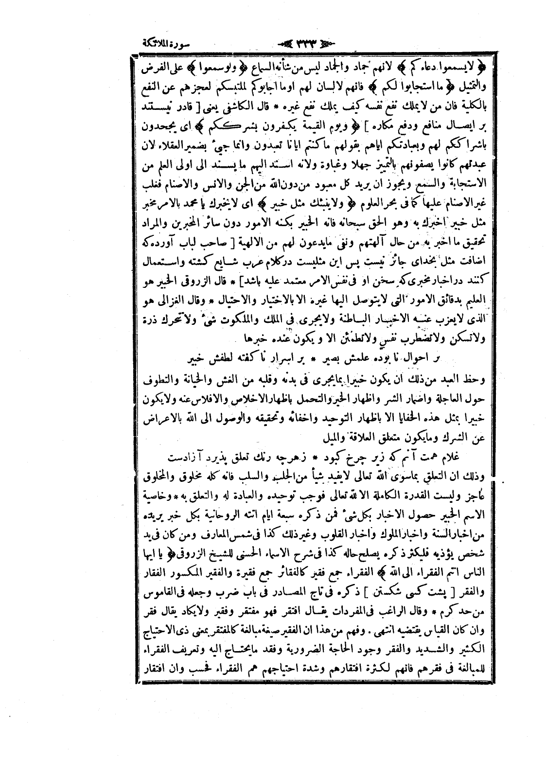 وذلك ان التعلق بما سوى الله تعالى لا يفيد شيأ من الجلب والسلب فانه كله مخلوق والمخلوق عاجز وليست القدرة الكاملة الا لله تعالى فوجب توحيده والعبادة له والتعلق به وخاصية الاسم الخبير حصول الاخبار بكل شىء فمن ذكره سبعة ايام أتته الروحانية بكل خبر يريده من اخبار السنة واخبار الملوك واخبار القلوب وغير ذلك كذا فى شمس المعارف ومن كان فى يد شخص يؤذيه فليكثر ذكره يصلح حاله كذا فى شرح الأسماء الحسنى للشيخ الزروقى يا أَيُّهَا النَّاسُ أَنْتُمُ الْفُقَراءُ إِلَى اللَّهِ الفقراء جمع فقير كالفقائر جمع فقيرة والفقير المكسور الفقار والفقر [پشت كسى شكستن] ذكره فى تاج المصادر فى باب ضرب وجعله فى القاموس من حد كرم وقال الراغب فى المفردات يقال افتقر فهو مفتقر وفقير ولا يكاد يقال فقر وان كان القياس يقتضيه انتهى. وفهم من هذا ان الفقير صيغة مبالغة كالمفتقر بمعنى ذى الاحتياج الكثير والشديد والفقر وجود الحاجة الضرورية وفقد ما يحتاج اليه وتعريف الفقراء للمبالغة فى فقرهم فانهم لكثرة افتقارهم وشدة احتياجهم هم الفقراء فحسب وان افتقار