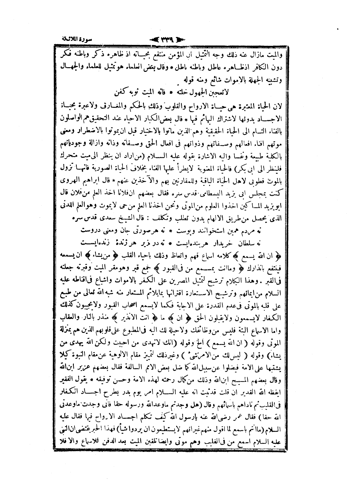 لان الحياة المعتبرة هى حياة الأرواح والقلوب وذلك بالحكم والمعارف ولا عبرة بحياة الأجساد بدونها لاشتراك البهائم فيها قال بعض الكبار الاحياء عند التحقيق هم الواصلون بالفناء التام الى الحياة الحقيقية وهم الذين ماتوا بالاختيار قبل ان يموتوا بالاضطرار ومعنى موتهم إفناء أفعالهم وصفاتهم وذواتهم فى افعال الحق وصفاته وذاته وازالة وجودياتهم بالكلية طبيعة ونفسا واليه الاشارة بقوله عليه السلام (من أراد ان ينظر الى ميت متحرك فلينظر الى ابى بكر) فالحياة المعنوية لا يطرأ عليها الفناء بخلاف الحياة الصورية فانها تزول بالموت فطوبى لاهل الحياة الباقية وللمقارنين بهم والآخذين عنهم قال ابراهيم الهروي كنت بمجلس ابى يزيد البسطامي قدس سره فقال بعضهم ان فلانا أخذ العلم من فلان قال ابو يزيد المساكين أخذوا العلوم من الموتى ونحن أخذنا العلم من حى لا يموت وهو العلم اللدني الذي يحصل من طريق الإلهام بدون تطلب وتكلف: قال الشيخ سعدى قدس سره