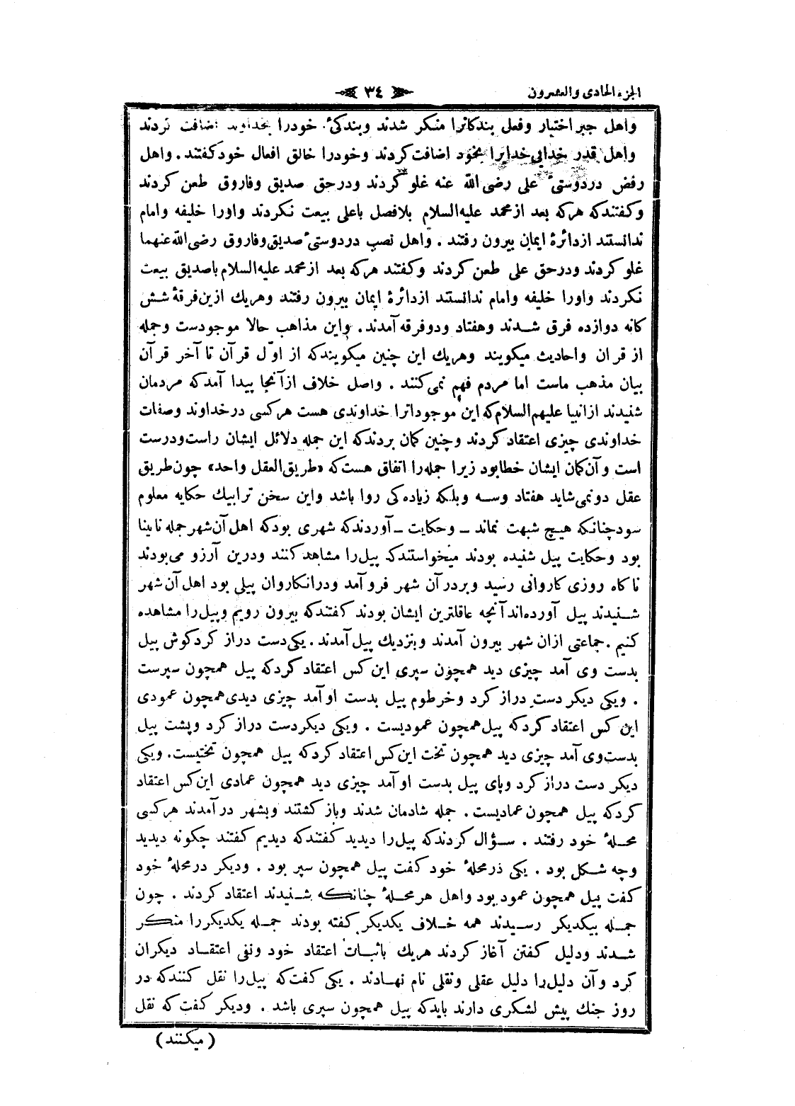 واهل جبر اختيار وفعل بندگانرا منكر شدند وبندگى خود را بخداوند اضافت كردند. واهل قدر خدايى خدايرا بخود اضافت كردند وخود را خالق افعال خود كفتند. واهل رفض در دوستى على رضى الله عنه غلو كردند ودر حق صديق وفاروق طعن كردند وكفتند كه هر كه بعد از محمد عليه السلام بلا فصل با على بيعت نكردند واو را خليفه وامام ندانستند از دائره ايمان بيرون رفتند. واهل نصب در دوستى صديق وفاروق رضى الله عنهما غلو كردند ودر حق على طعن كردند وكفتند هر كه بعد از محمد عليه السلام با صديق بيعت نكردند واو را خليفه وامام ندانستند از دائره ايمان بيرون رفتند وهر يك ازين فرقه شش كانه دوازده فرق شدند وهفتاد ودو فرقه آمدند. واين مذاهب حالا موجودست وجمله از قران وأحاديث ميكويند وهر يك اين چنين ميكويند كه از اوّل قرآن تا آخر قرآن بيان مذهب ماست اما مردم فهم نمى كنند. واصل خلاف از آنجا پيدا آمد كه مردمان شنيدند از انبيا عليهم السلام كه اين موجوداترا خداوندى هست هر كسى در خداوند وصفات خداوندى چيزى اعتقاد كردند و چنين كمان بردند كه اين جمله دلائل ايشان راست ودرست است وآن كمان ايشان خطا بود زيرا جمله را اتفاق هست كه «طريق العقل واحد» چون طريق عقل دو نمى شايد هفتاد وسه وبلكه زياده كى روا باشد واين سخن ترا بيك حكايه معلوم سود چنانكه هيچ شبهت نماند- وحكايت- آوردند كه شهرى بود كه اهل آن شهر جمله نا؟ ينا بود وحكايت پيل شنيده بودند ميخواستند كه پيل را مشاهد كنند ودرين آرزو مى بودند ناكاه روزى كاروانى رسيد وبر در آن شهر فرو آمد ودر آنكاروان پيلى بود اهل آن شهر شنيدند پيل آورده اند آنچهـ عاقلترين ايشان بودند كفتند كه بيرون رويم و پيل را مشاهده كنيم. جماعتى از ان شهر بيرون آمدند وبنزديك پيل آمدند. يكى دست دراز كرد كوش پيل بدست وى آمد چيزى ديد همچون سپرى اين كس اعتقاد كرد كه پيل همچون سپرست. ويكى ديكر دست دراز كرد وخرطوم پيل بدست او آمد چيزى ديدى همچون عمودى اين كس اعتقاد كرد كه پيل همچون عموديست. ويكى ديكر دست دراز كرد و پشت پيل بدست وى آمد چيزى ديد همچون تخت اين كس اعتقاد كرد كه پيل همچون تختيست. ويكى ديكر دست دراز كرد و پاى پيل بدست او آمد چيزى ديد همچون عمادى اين كس اعتقاد