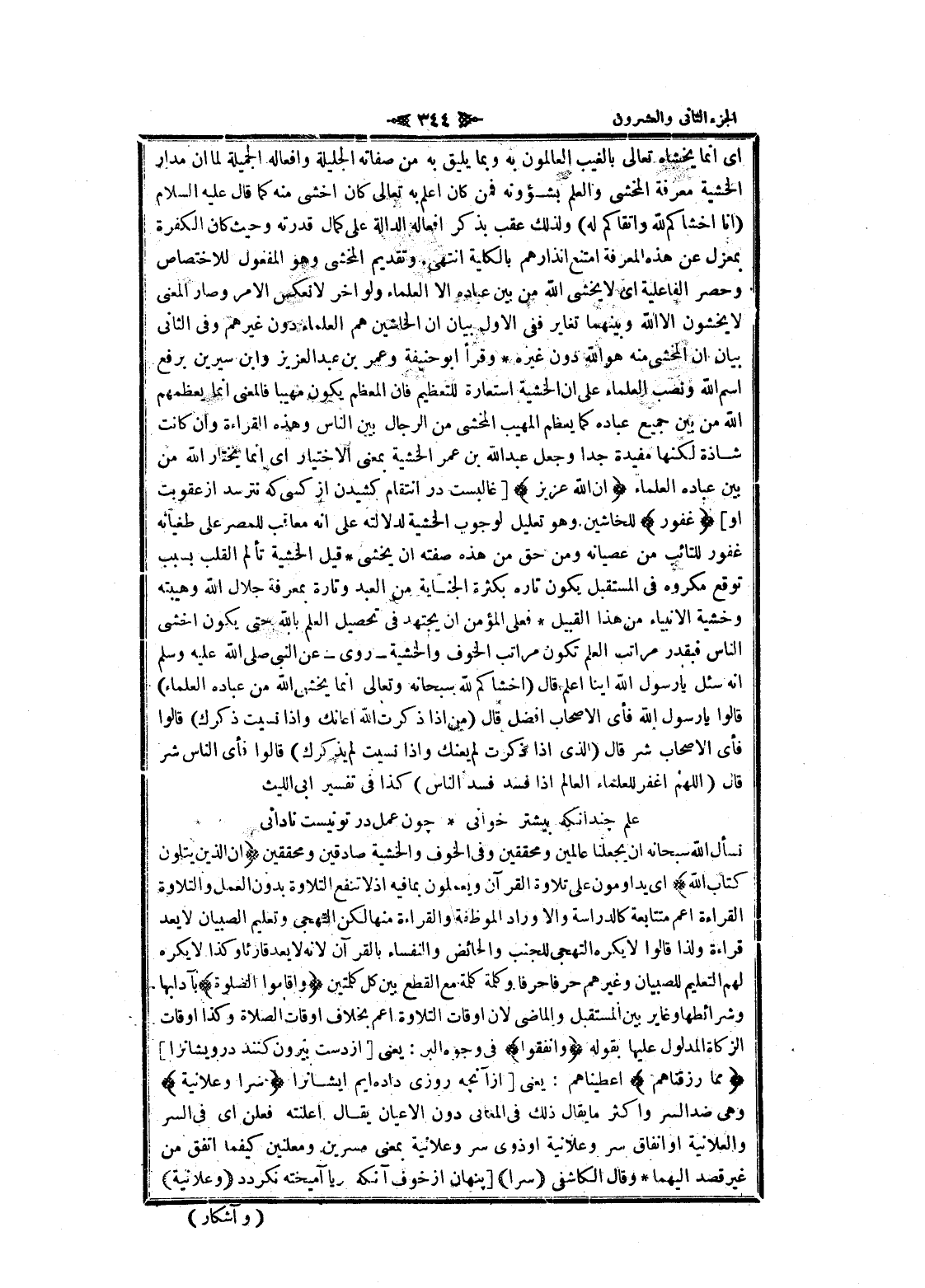 اى انما يخشاه تعالى بالغيب العالمون به وبما يليق به من صفاته الجليلة وأفعاله الجميلة لما ان مدار الخشية معرفة المخشى والعلم بشؤونه فمن كان اعلم به تعالى كان أخشى منه كما قال عليه السلام (انا أخشاكم لله وأتقاكم له) ولذلك عقب بذكر أفعاله الدالة على كمال قدرته وحيث كان الكفرة بمعزل عن هذه المعرفة امتنع إنذارهم بالكلية انتهى. وتقديم المخشى وهو المفعول للاختصاص وحصر الفاعلية اى لا يخشى الله من بين عباده الا العلماء ولو اخر لانعكس الأمر وصار المعنى لا يخشون الا الله وبينهما تغاير ففى الاول بيان ان الخاشين هم العلماء دون غيرهم وفى الثاني بيان ان المخشى منه هو الله دون غيره وقرأ ابو حنيفة وعمر بن عبد العزيز وابن سيرين برفع اسم الله ونصب العلماء على ان الخشية استعارة للتعظيم فان المعظم يكون مهيبا فالمعنى انما يعظمهم الله من بين جميع عباده كما يعظم المهيب المخشى من الرجال بين الناس وهذه القراءة وان كانت شاذة لكنها مفيدة جدا وجعل عبد الله بن عمر الخشية بمعنى الاختيار اى انما يختار الله من بين عباده العلماء إِنَّ اللَّهَ عَزِيزٌ [غالبست در انتقام كشيدن از كسى كه نترسد از عقوبت او] غَفُورٌ للخاشين وهو تعليل لوجوب الخشية لدلالته على انه معاقب للمصر على طغيانه غفور للتائب من عصيانه ومن حق من هذه صفته ان يخشى قيل الخشية تألم القلب بسبب توقع مكروه فى المستقبل يكون تارة بكثرة الجناية من العبد وتارة بمعرفة جلال الله وهيبته وخشية الأنبياء من هذا القبيل فعلى المؤمن ان يجتهد فى تحصيل العلم بالله حتى يكون أخشى الناس فبقدر مراتب العلم تكون مراتب الخوف والخشية- روى- عن النبي صلى الله عليه وسلم انه سئل يا رسول الله أينا اعلم قال (أخشاكم لله سبحانه وتعالى انما يخشى الله من عباده العلماء) قالوا يا رسول الله فأى الاصحاب أفضل قال (من إذا ذكرت الله اعانك وإذا نسيت ذكرك) قالوا فأى الاصحاب شر قال (الذي إذا ذكرت لم يعنك وإذا نسيت لم يذكرك) قالوا فأى الناس شر قال (اللهم اغفر للعلماء العالم إذا فسد فسد الناس) كذا فى تفسير ابى الليث علم چندانكه بيشتر خوانى چون عمل در تو نيست نادانى نسأل الله سبحانه ان يجعلنا عالمين ومحققين وفى الخوف والخشية صادقين ومحققين إِنَّ الَّذِينَ يَتْلُونَ كِتابَ اللَّهِ اى يداومون على تلاوة القرآن ويعملون بما فيه إذ لا تنفع التلاوة بدون العمل والتلاوة القراءة أعم متتابعة كالدراسة والأوراد الموظفة والقراءة منها لكن التهجي وتعليم الصبيان لا يعد قراءة ولذا قالوا لا يكره التهجي للجنب والحائض والنفساء بالقرآن لانه لا يعد قارئا وكذا لا يكره لهم التعليم للصبيان وغيرهم حرفا حرفا وكلمة كلمة مع القطع بين كل كلمتين وَأَقامُوا الصَّلاةَ بآدابها وشرائطها وغاير بين المستقبل والماضي لان اوقات التلاوة أعم بخلاف اوقات الصلاة وكذا اوقات الزكاة المدلول عليها بقوله وَأَنْفَقُوا فى وجوه البر: يعنى [از دست بيرون كنند درويشانرا] مِمَّا رَزَقْناهُمْ أعطيناهم: يعنى [از آنچهـ روزى داده ايم ايشانرا سِرًّا وَعَلانِيَةً وهى ضد السر واكثر ما يقال ذلك فى المعاني دون الأعيان يقال اعلنته فعلن اى فى السر والعلانية او انفاق سر وعلانية او ذوى سر وعلانية بمعنى مسرين ومعلنين كيفما اتفق من غير قصد إليهما وقال الكاشفى (سِرًّا) [پنهان از خوف آنكه بريا آميخته نكردد (وَعَلانِيَةً)