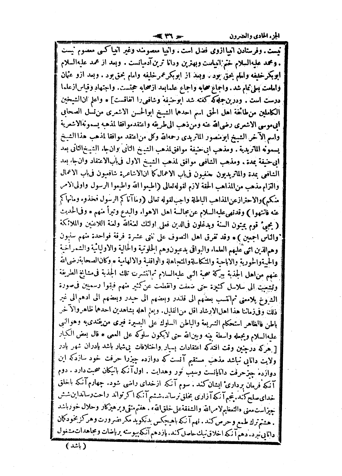 نيست. وفرستادن انبيا از وى فضل است. وانبيا معصومند وغير انبيا كسى معصوم نيست. ومحمد عليه السلام ختم انبياست وبهترين وداناترين آدميانست. وبعد از محمد عليه السلام ابو بكر خليفه وامام بحق بود. وبعد از ابو بكر عمر خليفه وامام بحق بود. وبعد ازو عثمان وامامت بعلى تمام شد. واجماع صحابه واجماع علما بعد از صحابه حجتست. واجتهاد وقياس از علما درست است. ودرين جمله كه كفته شد ابو حنيفه وشافعى را اتفاقست] واعلم ان الشيخين الكاملين من طائفة اهل الحق اسم أحدهما الشيخ ابو الحسن الأشعري من نسل الصحابي ابى موسى الأشعري رضى الله عنه ومن ذهب الى طريقه واعتقد موافقا لمذهبه يسمونه الاشعرية واسم الآخر الشيخ ابو منصور الماتريدى رحمه الله وكل من اعتقد موافقا لمذهب هذا الشيخ يسمونه الماتريدية. ومذهب ابى حنيفة موافق لمذهب الشيخ الثاني وان جاء الشيخ الثاني بعد ابى حنيفة بمدة. ومذهب الشافعي موافق لمذهب الشيخ الاول فى باب الاعتقاد وان جاء بعد الشافعي بمدة والماتريديون حنفيون فى باب الأعمال كما ان الاشاعرة شافعيون فى باب الأعمال والتزام مذهب من المذاهب الحقة لازم لقوله تعالى (أَطِيعُوا اللَّهَ وَأَطِيعُوا الرَّسُولَ وَأُولِي الْأَمْرِ مِنْكُمْ) والاحتراز عن المذاهب الباطلة واجب لقوله تعالى (وَما آتاكُمُ الرَّسُولُ فَخُذُوهُ وَما نَهاكُمْ عَنْهُ فَانْتَهُوا) وقد نهى عليه السلام عن مجالسة اهل الأهواء والبدع وتبرأ منهم وفى الحديث (يجيىء قوم يميتون السنة ويدغلون فى الدين فعلى أولئك لعنة الله ولعنة اللاعنين والملائكة والناس أجمعين) وقد تفرق اهل التصوف على ثنتى عشرة فرقة فواحدة منهم سنيون وهم الذين اثنى عليهم العلماء والبواقي بدعيون وهم الخلوتية والحالية والاوليائية والشمراخية والحبية والحورية والإباحية والمتكاسلة والمتجاهلة والواقفية والالهامية وكان الصحابة رضى الله عنهم من اهل الجذبة ببركة صحبة النبي عليه السلام ثم انتشرت تلك الجذبة فى مشايخ الطريقة وتشعبت الى سلاسل كثيرة حتى ضعفت وانقطعت عن كثير منهم فبقوا رسميين فى صورة الشيوخ بلا معنى ثم انتسب بعضهم الى قلندر وبعضهم الى حيدر وبعضهم الى أدهم الى غير ذلك وفى زماننا هذا اهل الإرشاد اقل من القليل. ويعلم اهله بشاهدين أحدهما ظاهر والآخر باطن فالظاهر استحكام الشريعة والباطن السلوك على البصيرة فيرى من يقتدى به وهو النبي عليه السلام ويجعله واسطة بينه وبين الله حتى لا يكون سلوكه على العمى قال بعض الكبار [هر كه در چنين وقت افتد كه اعتقادات بسيار واختلافات بى شمار باشد يا در ان شهر يا در ولايت دانايى نباشد مذهب مستقيم آنست كه دوازده چيز را حرفت خود سازد كه اين دوازده چيز حرفت دانايانست وسبب نور وهدايت. أول آنكه با نيكان صحبت دارد. دوم آنكه فرمان بردارىء ايشان كند. سوم آنكه از خداى راضى شود. چهارم آنكه با خلق خداى صلح كند. پنجم آنكه آزارى بخلق نرساند. ششم آنكه اگر تواند راحت رساند اين شش چيز است معنى «التعظيم لامر الله والشفقة على خلق الله» . هفتم متقى و پرهيزكار وحلال خور باشد. هشتم ترك طمع وحرص كند. نهم آنكه با هيچكس بد نكويد مكر ضرورت وهركز بخود كمان دانايى نبرد. دهم آنكه اخلاق نيك حاصل كند. يازدهم آنكه پيوسته برياضات ومجاهدات مشغول