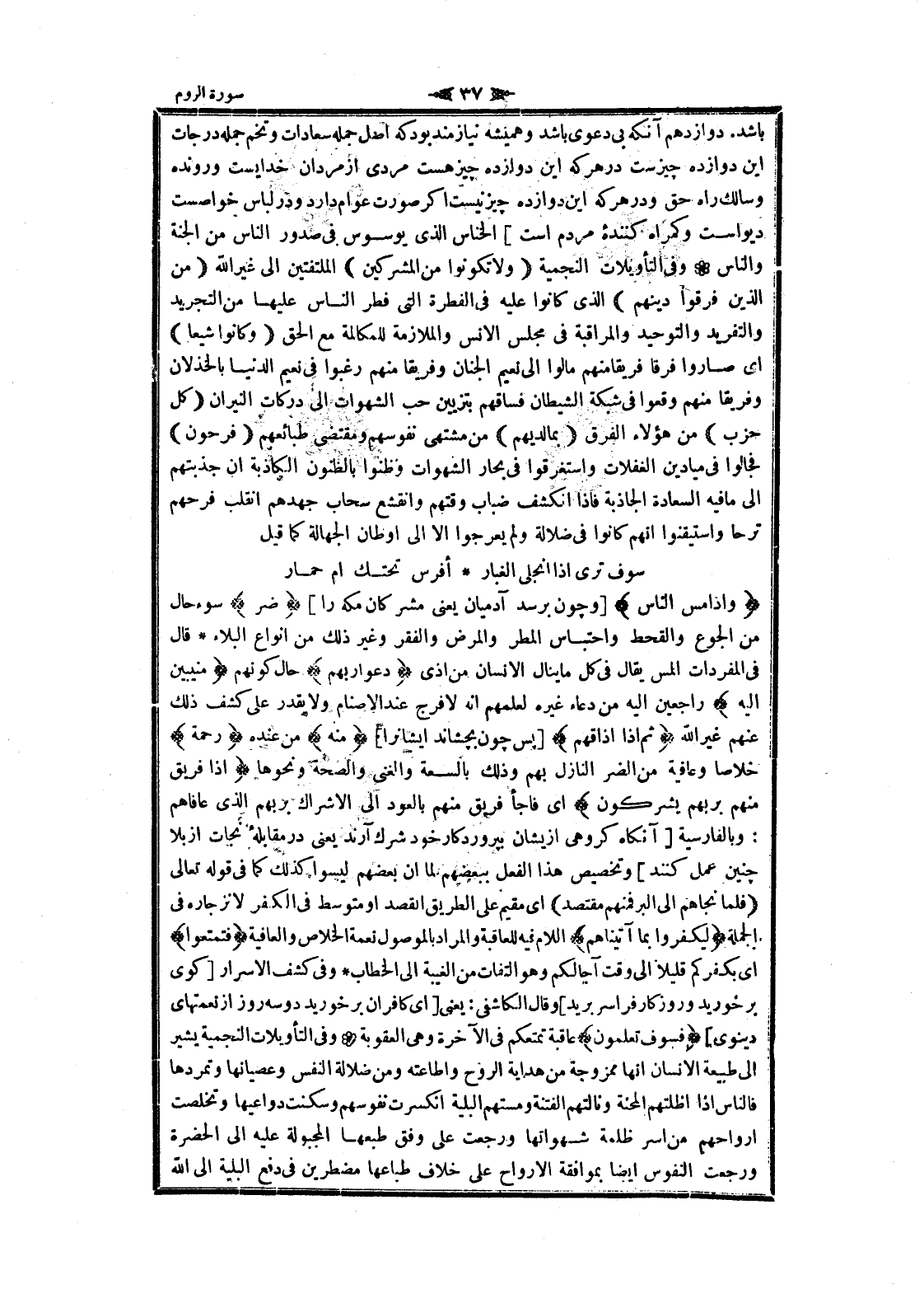 وَإِذا مَسَّ النَّاسَ [و چون برسد آدميان يعنى مشركان مكه را] ضُرٌّ سوء حال من الجوع والقحط واحتباس المطر والمرض والفقر وغير ذلك من انواع البلاء قال فى المفردات المس يقال فى كل ما ينال الإنسان من أذى دَعَوْا رَبَّهُمْ حال كونهم مُنِيبِينَ إِلَيْهِ راجعين اليه من دعاء غيره لعلمهم انه لا فرج عند الأصنام ولا يقدر على كشف ذلك عنهم غير الله ثُمَّ إِذا أَذاقَهُمْ [پس چون بچشاند ايشانرا] مِنْهُ من عنده رَحْمَةً خلاصا وعافية من الضر النازل بهم وذلك بالسعة والغنى والصحة ونحوها إِذا فَرِيقٌ مِنْهُمْ بِرَبِّهِمْ يُشْرِكُونَ اى فاجأ فريق منهم بالعود الى الإشراك بربهم الذي عافاهم: وبالفارسية [آنگاه كروهى ازيشان بپروردگار خود شرك آرند يعنى در مقابله نجات از بلا چنين عمل كنند] وتخصيص هذا الفعل ببعضهم لما ان بعضهم ليسوا كذلك كما فى قوله تعالى (فَلَمَّا نَجَّاهُمْ إِلَى الْبَرِّ فَمِنْهُمْ مُقْتَصِدٌ) اى مقيم على الطريق القصد او متوسط فى الكفر لانزجاره فى الجملة لِيَكْفُرُوا بِما آتَيْناهُمْ اللام فيه للعاقبة والمراد بالموصول نعمة الخلاص والعافية فَتَمَتَّعُوا اى بكفركم قليلا الى وقت آجالكم وهو التفات من الغيبة الى الخطاب وفى كشف الاسرار [كوى برخوريد وروزكار فرا سربريد] وقال الكاشفى: يعنى [اى كافران برخوريد دو سه روز از نعمتهاى دنيوى] فَسَوْفَ تَعْلَمُونَ عاقبة تمتعكم فى الآخرة وهى العقوبة وفى التأويلات النجمية يشير الى طبيعة الإنسان انها ممزوجة من هداية الروح واطاعته ومن ضلالة النفس وعصيانها وتمردها فالناس إذا أظلتهم المحنة ونالتهم الفتنة ومستهم البلية انكسرت نفوسهم وسكنت دواعيها وتخلصت أرواحهم من اسر ظلمة شهواتها ورجعت على وفق طبعها المجبولة عليه الى الحضرة ورجعت النفوس ايضا بموافقة الأرواح على خلاف طباعها مضطرين فى دفع البلية الى الله