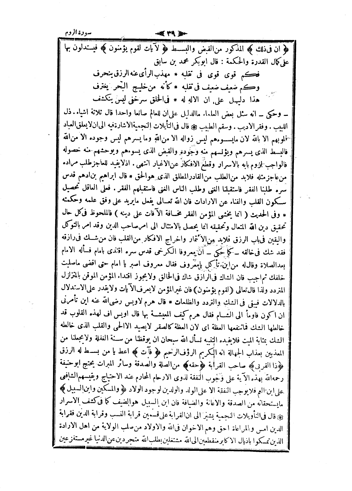 - وحكى- انه سئل بعض العلماء ما الدليل على ان للعالم صانعا واحدا قال ثلاثة أشياء. ذل اللبيب. وفقر الأديب. وسقم الطبيب قال فى التأويلات النجمية الاشارة فيه الى ان لا يعلق العباد قلوبهم الا بالله لان ما يسوءهم ليس زواله الا من الله وما يسرهم ليس وجوده الا من الله فالبسط الذي يسرهم ويؤنسهم منه وجوده والقبض الذي يسوءهم ويوحشهم منه حصوله فالواجب لزوم بابه بالاسرار وقطع الافكار عن الأغيار انتهى. إذ لا يفيد للعاجز طلب مراده من عاجز مثله فلا بد من الطلب من القادر المطلق الذي هو الحق قال ابراهيم بن أدهم قدس سره طلبنا الفقر فاستقبلنا الغنى وطلب الناس الغنى فاستقبلهم الفقر. فعلى العاقل تحصيل سكون القلب والفناء عن الإرادات فان الله تعالى يفعل ما يريد على وفق علمه وحكمته وفى الحديث (انما يخشى المؤمن الفقر مخافة الآفات على دينه) فالملحوظ فى كل حال تحقيق دين الله المتعال وتحقيقه انما يحصل بالامتثال الى امر صاحب الدين وقد امر بالتوكل واليقين فى باب الرزق فلا بد من الائتمار وإخراج الافكار من القلب فان من شك فى رازقه فقد شك فى خالقه- كما حكى- ان معروفا الكرخي قدس سره اقتدى بامام فسأله الامام بعد الصلاة وقال له من اين تأكل يا معروف فقال معروف اصبر يا امام حتى أقضي ما صليت خلفك ثم أجيب فان الشاك فى الرازق شاك فى الخالق ولا يجوز اقتداء المؤمن الموقن بالمتزلزل المتردد ولذا قال تعالى (لِقَوْمٍ يُؤْمِنُونَ) فان غير المؤمن لا يعرف الآيات ولا يقدر على الاستدلال بالدلالات فيبقى فى الشك والتردد والظلمات قال هرم لاويس رضى الله عنه اين تأمرنى ان أكون فاومأ الى الشام فقال هرم كيف المعيشة بها قال اويس أف لهذه القلوب قد خالطها الشك فما تنفعها العظة اى لان العظة كالصقر لا يصيد الا الحي والقلب الذي خالطه الشك بمثابة الميت فلا يفيده التنبيه نسأل الله سبحان ان يوقظنا من سنة الغفلة ولا يجعلنا من المعذبين بعذاب الجهالة انه الكريم الرؤوف الرحيم فَآتِ أعط يا من بسط له الرزق ذَا الْقُرْبى صاحب القرابة حَقَّهُ من الصلة والصدقة وسائر المبرات يحتج ابو حنيفة رحمه الله بهذه الآية على وجوب النفقة لذوى الأرحام المحارم عند الاحتياج ويقيسهم الشافعي على ابن العم فلا يوجب النفقة الا على الولد والولدين لوجود الولاد وَالْمِسْكِينَ وَابْنَ السَّبِيلِ ما يستحقانه من الصدقة والاعانة والضيافة فان ابن السبيل هو الضيف كما فى كشف الاسرار قال فى التأويلات النجمية يشير الى ان القرابة على قسمين قرابة النسب وقرابة الدين فقرابة الدين أمس وبالمراعاة أحق وهم الاخوان فى الله والأولاد من صلب الولاية من اهل الارادة الذين تمسكوا بأذيال الأكابر منقطعين الى الله مشتغلين بطلب الله متجردين عن الدنيا غير مستفزعين