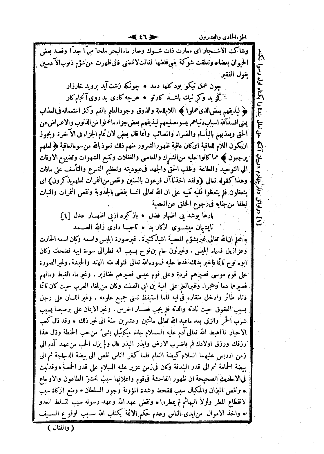اعلم ان الله تعالى غير بشؤم المعصية أشياء كثيرة. غير صورة إبليس واسمه وكان اسمه الحارث وعزازيل فسماه إبليس. وغير لون حام بن نوح بسبب انه نظر الى سوءة أبيه فضحك وكان أبوه نوح نائما فاخبر بذلك فدعا عليه فسوده الله تعالى فتولد منه الهند والحبشة. وغير الصورة على قوم موسى فصيرهم قردة وعلى قوم عيسى فصيرهم خنازير. وغير ماء القبط ومالهم فصيرهما دما وحجرا. وغير العلم على امية بن ابى الصلت وكان من بلغاء العرب حيث كان نائما فاتاه طائر وادخل منقاره فى فيه فلما استيقظ نسى جميع علومه. وغير اللسان على رجل بسبب العقوق حيث نادته والدته فلم يجب فصار اخرس. وغير الايمان على برصيصا بسبب شرب الخمر والزنى بعد ما عبد الله تعالى مائتين وعشرين سنة الى غير ذلك وقد قال كعب الأحبار لما اهبط الله تعالى آدم عليه السلام جاءه ميكائيل بشىء من حب الحنطة وقال هذا رزقك ورزق أولادك قم فاضرب الأرض وابذر البذر قال ولم يزل الحب من عهد آدم الى زمن إدريس عليهما السلام كبيضة النعام فلما كفر الناس نفص الى بيضة الدجاجة ثم الى بيضة الحمامة ثم الى قدر البندقة وكان فى زمن عزير عليه السلام على قدر الحمصة وقد ثبت فى الأحاديث الصحيحة ان ظهور الفاحشة فى قوم واعلانها سبب لفشوّ الطاعون والأوجاع ونقص الميزان والمكيال سبب للقحط وشدة المئونة وجور السلطان ومنع الزكاة سبب لانقطاع المطر ولولا البهائم لم يمطروا ونقض عهد الله وعهد رسوله سبب لتسلط العدو وأخذ الأموال من أيدي الناس وعدم حكم الائمة بكتاب الله سبب لوقوع السيف