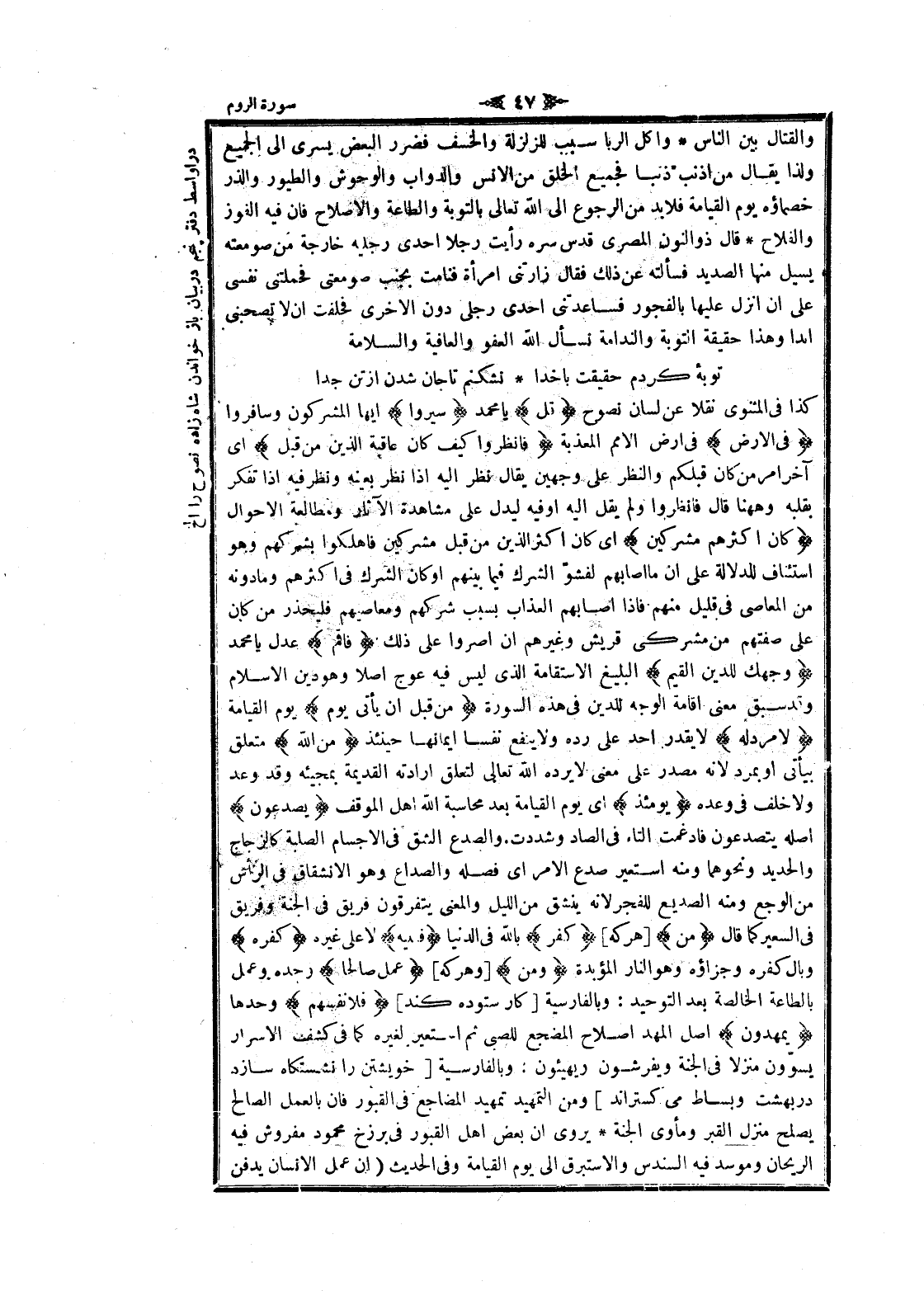 كذا فى المثنوى نقلا عن لسان نصوح قُلْ يا محمد سِيرُوا ايها المشركون وسافروا فِي الْأَرْضِ فى ارض الأمم المعذبة فَانْظُرُوا كَيْفَ كانَ عاقِبَةُ الَّذِينَ مِنْ قَبْلُ اى آخر امر من كان قبلكم والنظر على وجهين يقال نظر اليه إذا نظر بعينه ونظر فيه إذا تفكر بقلبه وهاهنا قال فانظروا ولم يقل اليه او فيه ليدل على مشاهدة الآثار ومطالعة الأحوال كانَ أَكْثَرُهُمْ مُشْرِكِينَ اى كان اكثر الذين من قبل مشركين فاهلكوا بشركهم وهو استئناف للدلالة على ان ما أصابهم لفشوّ الشرك فيما بينهم او كان الشرك فى أكثرهم وما دونه من المعاصي فى قليل منهم فاذا أصابهم العذاب بسبب شركهم ومعاصيهم فليحذر من كان على صفتهم من مشركى قريش وغيرهم ان أصروا على ذلك فَأَقِمْ عدل يا محمد وَجْهَكَ لِلدِّينِ الْقَيِّمِ البليغ الاستقامة الذي ليس فيه عوج أصلا وهو دين الإسلام وقد سبق معنى اقامة الوجه للدين فى هذه السورة مِنْ قَبْلِ أَنْ يَأْتِيَ يَوْمٌ يوم القيامة لا مَرَدَّ لَهُ لا يقدر أحد على رده ولا ينفع نفسا إيمانها حينئذ مِنَ اللَّهِ متعلق بيأتي او بمرد لانه مصدر على معنى لا يرده الله تعالى لتعلق إرادته القديمة بمجيئه وقد وعد ولا خلف فى وعده يَوْمَئِذٍ اى يوم القيامة بعد محاسبة الله اهل الموقف يَصَّدَّعُونَ أصله يتصدعون فادغمت التاء فى الصاد وشددت. والصدع الشق فى الأجسام الصلبة كالزجاج والحديد ونحوهما ومنه استعير صدع الأمر اى فصله والصداع وهو الانشقاق فى الرأس من الوجع ومنه الصديع للفجر لانه ينشق من الليل والمعنى يتفرقون فريق فى الجنة وفريق فى السعير كما قال مَنْ [هركه] كَفَرَ بالله فى الدنيا فَعَلَيْهِ لا على غيره كُفْرُهُ وبال كفره وجزاؤه وهو النار المؤبدة وَمَنْ [وهر كه] عَمِلَ صالِحاً وحده وعمل بالطاعة الخالصة بعد التوحيد: وبالفارسية [كار ستوده كند] فَلِأَنْفُسِهِمْ وحدها يَمْهَدُونَ اصل المهد إصلاح المضجع للصبى ثم استعير لغيره كما فى كشف الاسرار يسوّون منزلا فى الجنة ويفرشون ويهيئون: وبالفارسية [خويشتن را نشستكاه سازد در بهشت وبساط مى كستراند] ومن التمهيد تمهيد المضاجع فى القبور فان بالعمل الصالح يصلح منزل القبر ومأوى الجنة يروى ان بعض اهل القبور فى برزخ محمود مفروش فيه الريحان وموسد فيه السندس والإستبرق الى يوم القيامة وفى الحديث (ان عمل الإنسان يدفن