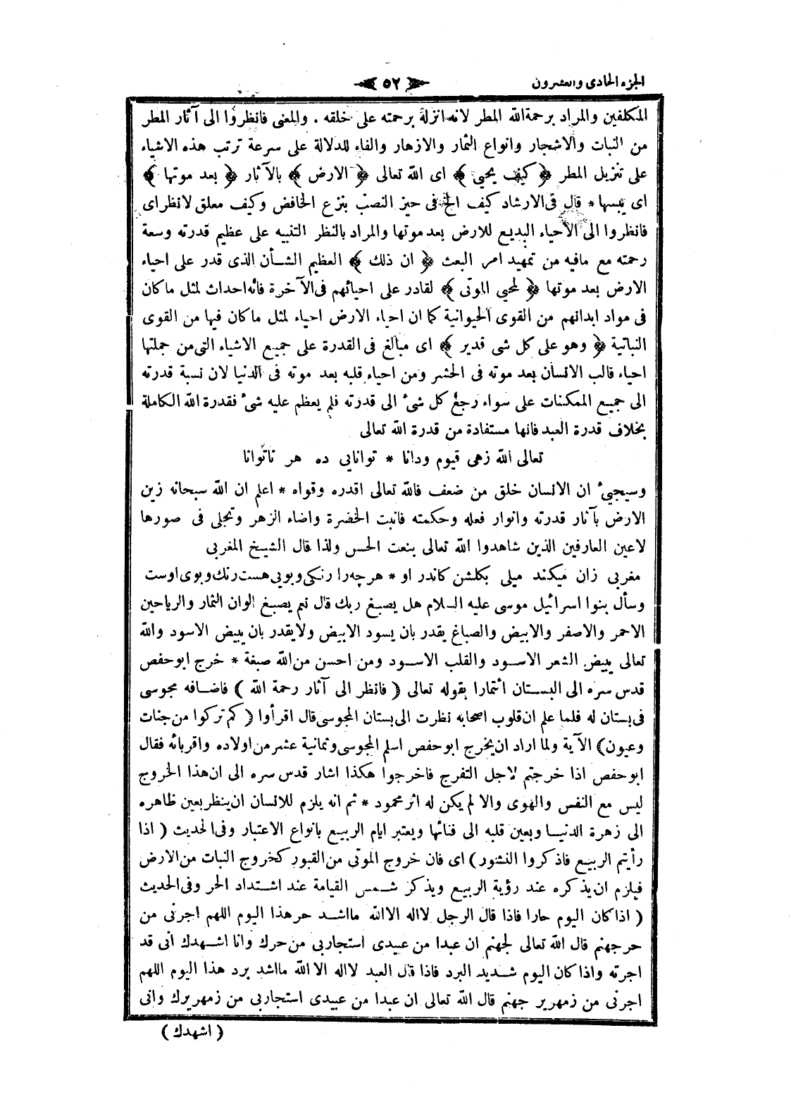 وسأل بنوا إسرائيل موسى عليه السلام هل يصبغ ربك قال نعم يصبغ ألوان الثمار والرياحين الأحمر والأصفر والأبيض والصباغ يقدر بان يسود الأبيض ولا يقدر بان يبيض الأسود والله تعالى يبيض الشعر الأسود والقلب الأسود ومن احسن من الله صبغة خرج ابو حفص قدس سره الى البستان ائتمارا بقوله تعالى (فَانْظُرْ إِلى آثارِ رَحْمَتِ اللَّهِ) فاضافه مجوسى فى بستان له فلما علم ان قلوب أصحابه نظرت الى بستان المجوسي قال اقرأوا (كَمْ تَرَكُوا مِنْ جَنَّاتٍ وَعُيُونٍ) الآية ولما أراد ان يخرج ابو حفص اسلم المجوسي وثمانية عشر من أولاده وأقربائه فقال ابو حفص إذا خرجتم لاجل التفرج فاخرجوا هكذا أشار قدس سره الى ان هذا الخروج ليس مع النفس والهوى والا لم يكن له اثر محمود ثم انه يلزم للانسان ان ينظر بعين ظاهره الى زهرة الدنيا وبعين قلبه الى فنائها ويعتبر ايام الربيع بانواع الاعتبار وفى الحديث (إذا رأيتم الربيع فاذكروا النشور) اى فان خروج الموتى من القبور كخروج النبات من الأرض فيلزم ان يذكره عند رؤية الربيع ويذكر شمس القيامة عند اشتداد الحر وفى الحديث (إذا كان اليوم حارا فاذا قال الرجل لا اله الا الله ما أشد حر هذا اليوم اللهم أجرني من حر جهنم قال الله تعالى لجهنم ان عبدا من عبيدى استجار بي من حرك وانا أشهدك انى قد أجرته وإذا كان اليوم شديد البرد فاذا قال العبد لا اله الا الله ما أشد برد هذا اليوم اللهم أجرني من زمهرير جهنم قال الله تعالى ان عبدا من عبيدى استجار بي من زمهريرك وانى