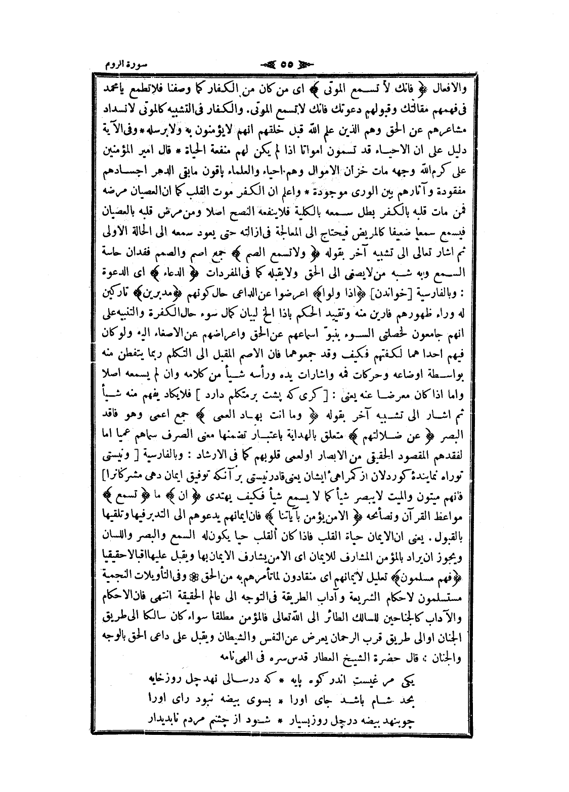 والافعال فَإِنَّكَ لا تُسْمِعُ الْمَوْتى اى من كان من الكفار كما وصفنا فلا تطمع يا محمد فى فهمهم مقالتك وقبولهم دعوتك فانك لا تسمع الموتى. والكفار فى التشبيه كالموتى لانسداد مشاعرهم عن الحق وهم الذين علم الله قبل خلقهم انهم لا يؤمنون به ولا برسله وفى الآية دليل على ان الاحياء قد تسمون أمواتا إذا لم يكن لهم منفعة الحياة قال امير المؤمنين على كرم الله وجهه مات خزان الأموال وهم احياء والعلماء باقون ما بقي الدهر أجسادهم مفقودة وآثارهم بين الورى موجودة واعلم ان الكفر موت القلب كما ان العصيان مرضه فمن مات قلبه بالكفر بطل سمعه بالكلية فلا ينفعه النصح أصلا ومن مرض قلبه بالعصيان فيسمع سمعا ضعيفا كالمريض فيحتاج الى المعالجة فى إزالته حتى يعود سمعه الى الحالة الاولى ثم أشار تعالى الى تشبيه آخر بقوله وَلا تُسْمِعُ الصُّمَّ جمع أصم والصمم فقدان حاسة السمع وبه شبه من لا يصغى الى الحق ولا يقبله كما فى المفردات الدُّعاءَ اى الدعوة: وبالفارسية [خواندن] إِذا وَلَّوْا اعرضوا عن الداعي حال كونهم مُدْبِرِينَ تاركين له وراء ظهورهم فارين منه وتقييد الحكم بإذا إلخ لبيان كمال سوء حال الكفرة والتنبيه على انهم جامعون لخصلتى السوء بنبو أسماعهم عن الحق واعراضهم عن الإصغاء اليه ولو كان فيهم إحداهما لكفتهم فكيف وقد جمعوهما فان الأصم المقبل الى التكلم ربما يتفطن منه بواسطة أوضاعه وحركات فمه وإشارات يده ورأسه شيأ من كلامه وان لم يسمعه أصلا واما إذا كان معرضا عنه يعنى: [كرى كه پشت بر متكلم دارد] فلا يكاد يفهم منه شيأ ثم أشار الى تشبيه آخر بقوله وَما أَنْتَ بِهادِ الْعُمْيِ جمع أعمى وهو فاقد البصر عَنْ ضَلالَتِهِمْ متعلق بالهداية باعتبار تضمنها معنى الصرف سماهم عميا اما لفقدهم المقصود الحقيقي من الابصار او لعمى قلوبهم كما فى الإرشاد: وبالفارسية [ونيستى تو راه نماينده كوردلان از كمراهىء ايشان يعنى قادر نيستى بر آنكه توفيق ايمان دهى مشركانرا] فانهم ميتون والميت لا يبصر شيأ كما لا يسمع شيأ فكيف يهتدى إِنْ ما تُسْمِعُ مواعظ القرآن ونصائحه إِلَّا مَنْ يُؤْمِنُ بِآياتِنا فان ايمانهم يدعوهم الى التدبر فيها وتلقيها بالقبول. يعنى ان الايمان حياة القلب فاذا كان القلب حيا يكون له السمع والبصر واللسان ويجوز ان يراد بالمؤمن المشارف للايمان اى الامن يشارف الايمان بها ويقبل عليها إقبالا حقيقيا فَهُمْ مُسْلِمُونَ تعليل لايمانهم اى منقادون لما تأمرهم به من الحق وفى التأويلات النجمية مستسلمون لاحكام الشريعة وآداب الطريقة فى التوجه الى عالم الحقيقة انتهى فان الاحكام والآداب كالجناحين للسالك الطائر الى الله تعالى فالمؤمن مطلقا سواء كان سالكا الى طريق الجنان او الى طريق قرب الرحمان يعرض عن النفس والشيطان ويقبل على داعى الحق بالوجه والجنان: قال حضرة الشيخ العطار قدس سره فى الهى نامه