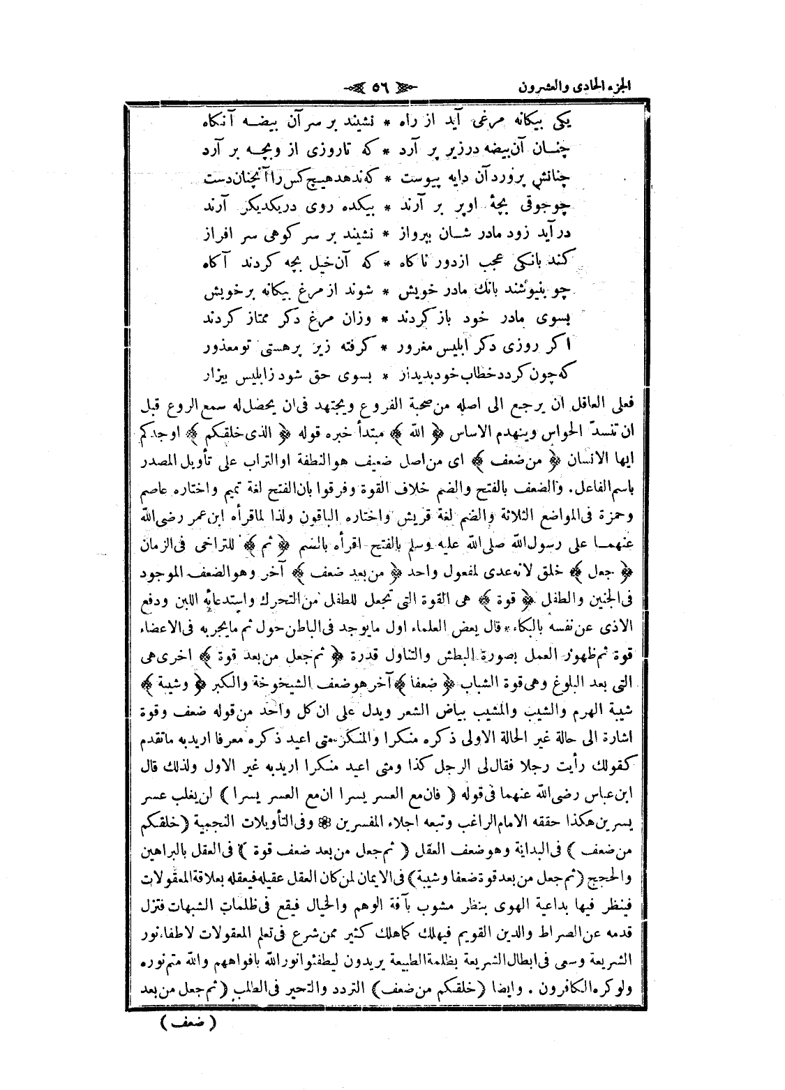 فعلى العاقل ان يرجع الى أصله من صحبة الفروع ويجتهد فى ان يحصل له سمع الروع قبل ان تنسدّ الحواس وينهدم الأساس اللَّهُ مبتدأ خبره قوله الَّذِي خَلَقَكُمْ أوجدكم ايها الإنسان مِنْ ضَعْفٍ اى من اصل ضعيف هو النطفة او التراب على تأويل المصدر باسم الفاعل. والضعف بالفتح والضم خلاف القوة وفرقوا بان الفتح لغة تميم واختاره عاصم وحمزة فى المواضع الثلاثة والضم لغة قريش واختاره الباقون ولذا لما قرأه ابن عمر رضى الله عنهما على رسول الله صلى الله عليه وسلم بالفتح اقرأه بالضم ثُمَّ للتراخى فى الزمان جَعَلَ خلق لانه عدى لمفعول واحد مِنْ بَعْدِ ضَعْفٍ آخر وهو الضعف الموجود فى الجنين والطفل قُوَّةً هى القوة التي تجعل للطفل من التحرك واستدعائه اللبن ودفع الأذى عن نفسه بالبكاء قال بعض العلماء أول ما يوجد فى الباطن حول ثم ما يجربه فى الأعضاء قوة ثم ظهور العمل بصورة البطش والتناول قدرة ثُمَّ جَعَلَ مِنْ بَعْدِ قُوَّةٍ اخرى هى التي بعد البلوغ وهى قوة الشباب ضَعْفاً آخر هو ضعف الشيخوخة والكبر وَشَيْبَةً شيبة الهرم والشيب والمشيب بياض الشعر ويدل على ان كل واحد من قوله ضعف وقوة اشارة الى حالة غير الحالة الاولى ذكره منكرا والمنكر متى أعيد ذكره معرفا أريد به ما تقدم كقولك رأيت رجلا فقال لى الرجل كذا ومتى أعيد منكرا أريد به غير الاول ولذلك قال ابن عباس رضى الله عنهما فى قوله (فَإِنَّ مَعَ الْعُسْرِ يُسْراً إِنَّ مَعَ الْعُسْرِ يُسْراً) لن يغلب عسر يسرين هكذا حققه الامام الراغب وتبعه اجلاء المفسرين وفى التأويلات النجمية (خَلَقَكُمْ مِنْ ضَعْفٍ) فى البداية وهو ضعف العقل (ثُمَّ جَعَلَ مِنْ بَعْدِ ضَعْفٍ قُوَّةً) فى العقل بالبراهين والحجج (ثُمَّ جَعَلَ مِنْ بَعْدِ قُوَّةٍ ضَعْفاً وَشَيْبَةً) فى الايمان لمن كان العقل عقيله فيعقله بعلاقة المعقولات فينظر فيها بداعية الهوى بنظر مشوب بآفة الوهم والخيال فيقع فى ظلمات الشبهات فتزل قدمه عن الصراط والدين القويم فيهلك كما هلك كثير ممن شرع فى تعلم المعقولات لاطفاء نور الشريعة وسعى فى ابطال الشريعة بظلمة الطبيعة يريدون ليطفئوا نور الله بأفواههم والله متم نوره ولو كره الكافرون. وايضا (خَلَقَكُمْ مِنْ ضَعْفٍ) التردد والتحير فى الطلب (ثُمَّ جَعَلَ مِنْ بَعْدِ
