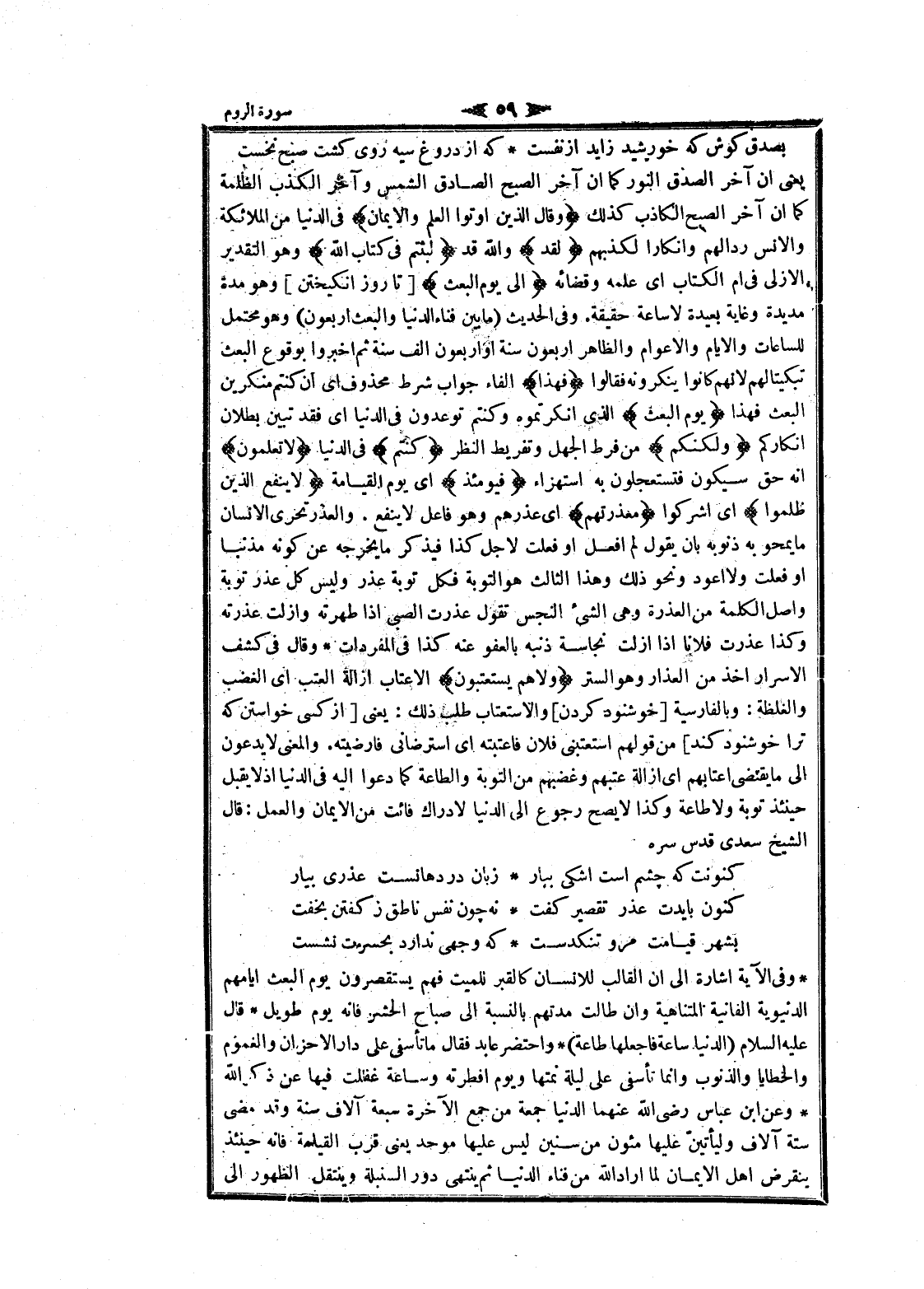 يعنى ان آخر الصدق النور كما ان آخر الصبح الصادق الشمس وآخر الكذب الظلمة كما ان آخر الصبح الكاذب كذلك وَقالَ الَّذِينَ أُوتُوا الْعِلْمَ وَالْإِيمانَ فى الدنيا من الملائكة والانس ردالهم وإنكارا لكذبهم لَقَدْ والله قد لَبِثْتُمْ فِي كِتابِ اللَّهِ وهو التقدير الأزلي فى أم الكتاب اى علمه وقضائه إِلى يَوْمِ الْبَعْثِ [تا روز انگيختن] وهو مدة مديدة وغاية بعيدة لا ساعة حقيقة. وفى الحديث (ما بين فناء الدنيا والبعث أربعون) وهو محتمل للساعات والأيام والأعوام والظاهر أربعون سنة او أربعون الف سنة ثم أخبروا بوقوع البعث تبكيتا لهم لانهم كانوا ينكرونه فقالوا فَهذا الفاء جواب شرط محذوف اى ان كنتم منكرين البعث فهذا يَوْمِ الْبَعْثِ الذي أنكرتموه وكنتم توعدون فى الدنيا اى فقد تبين بطلان انكاركم وَلكِنَّكُمْ من فرط الجهل وتفريط النظر كُنْتُمْ فى الدنيا لا تَعْلَمُونَ انه حق سيكون فتستعجلون به استهزاء فَيَوْمَئِذٍ اى يوم القيامة لا يَنْفَعُ الَّذِينَ ظَلَمُوا اى أشركوا مَعْذِرَتُهُمْ اى عذرهم وهو فاعل لا ينفع. والعذر تحرى الإنسان ما يمحو به ذنوبه بان يقول لم افعل او فعلت لاجل كذا فيذكر ما يخرجه عن كونه مذنبا او فعلت ولا أعود ونحو ذلك وهذا الثالث هو التوبة فكل توبة عذر وليس كل عذر توبة واصل الكلمة من العذرة وهى الشيء النجس تقول عذرت الصبى إذا طهرته وأزلت عذرته وكذا عذرت فلانا إذا أزلت نجاسة ذنبه بالعفو عنه كذا فى المفردات وقال فى كشف الاسرار أخذ من العذار وهو الستر وَلا هُمْ يُسْتَعْتَبُونَ الاعتاب ازالة العتب اى الغضب والغلظة: وبالفارسية [خوشنود كردن] والاستعتاب طلب ذلك: يعنى [از كسى خواستن كه ترا خوشنود كند] من قولهم استعتبني فلان فاعتبته اى استرضانى فارضيته. والمعنى لا يدعون الى ما يقتضى اعتابهم اى ازالة عتبهم وغضبهم من التوبة والطاعة كما دعوا اليه فى الدنيا إذ لا يقبل حينئذ توبة ولا طاعة وكذا لا يصح رجوع الى الدنيا لادراك فائت من الايمان والعمل: قال الشيخ سعدى قدس سره