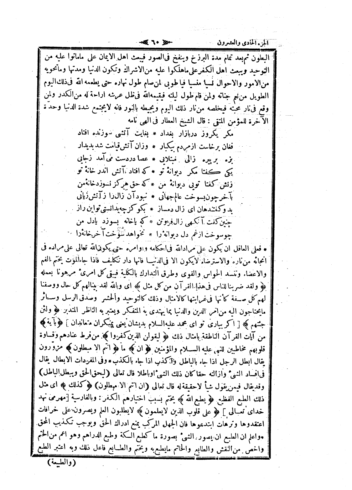 البطون ثم بعد تمام مدة البرزخ وينفخ فى الصور فيبعث اهل الايمان على ما ماتوا عليه من التوحيد ويبعث اهل الكفر على ما هلكوا عليه من الإشراك وتكون الدنيا ومدتها وما تحويه من الأمور والأحوال نسيا منسيا فيا طوبى لمن صام طول نهاره حتى يطعمه الله فى ذلك اليوم الطويل من نعم جناته ولمن قام طول ليلته فيقيمه الله فى ظل عرشه اراحة له من الكدر ولمن وقع فى نار محبته فيخلصه من نار ذلك اليوم ويحيطه بالنور فانه لا يجتمع شدة الدنيا وحدّة الآخرة للمؤمن المتقى: قال الشيخ العطار فى الهى نامه